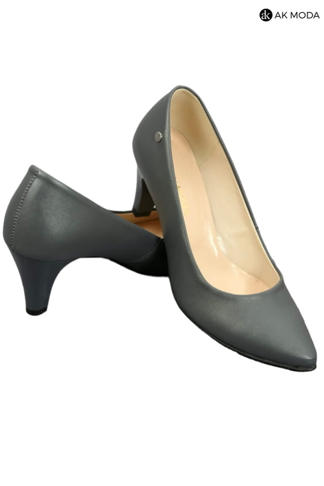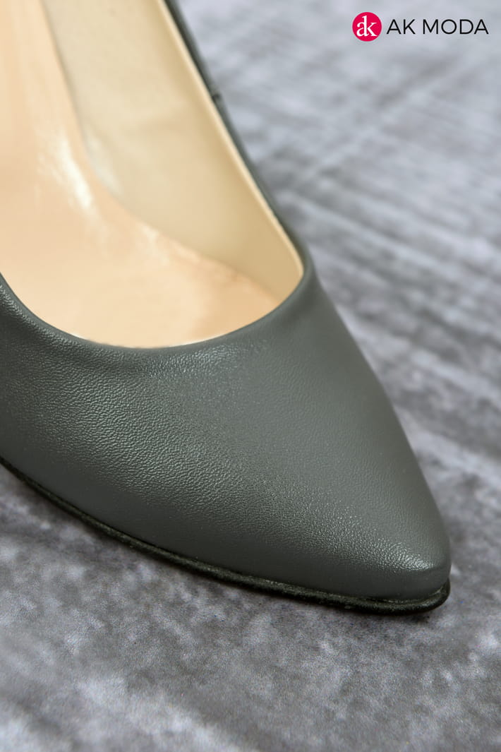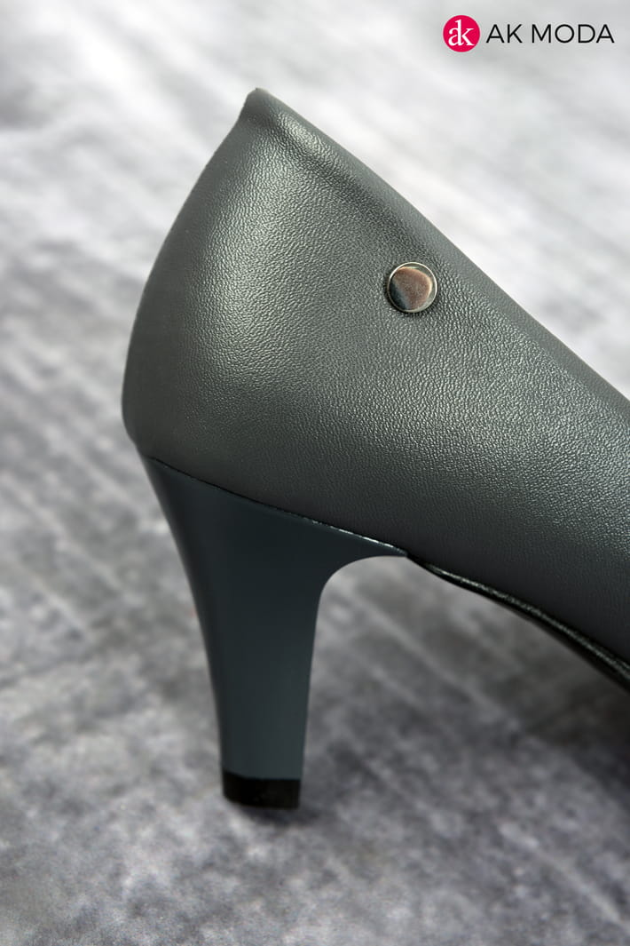 Obuwie damskie w kolorze grafitowym, na niewysokim obcasie.