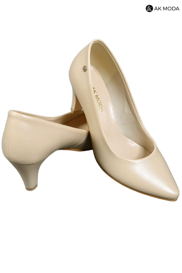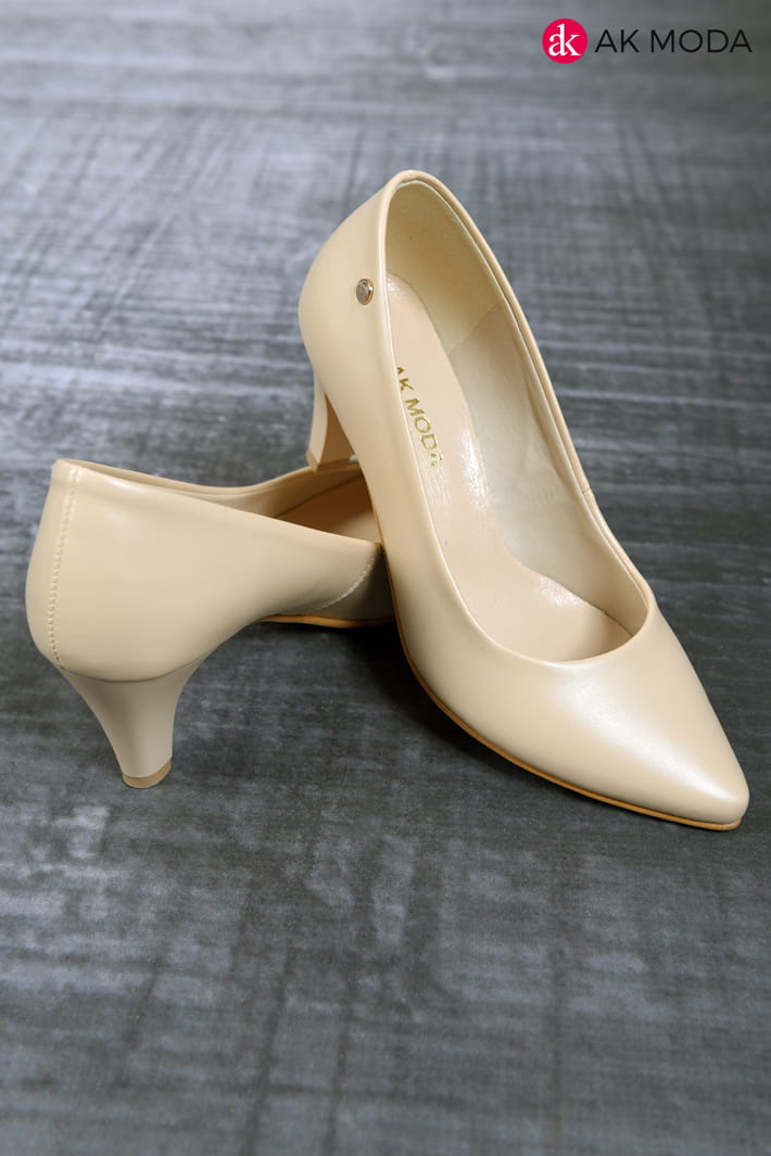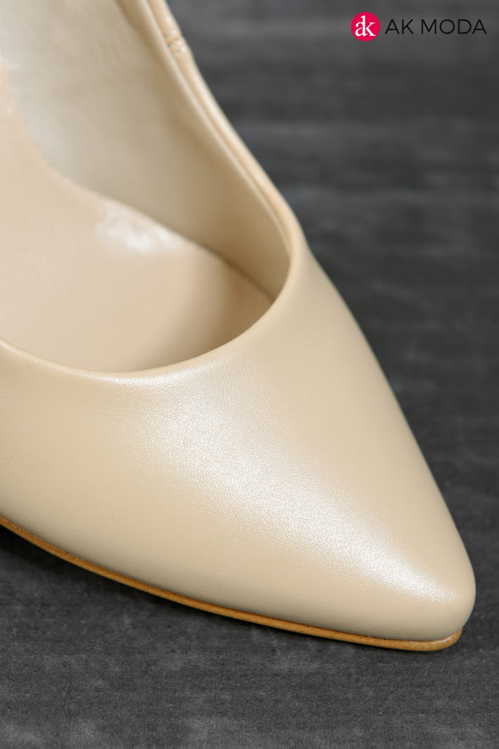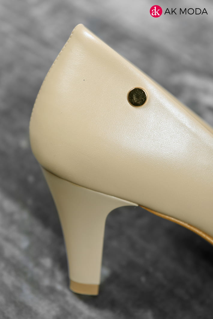 Obuwie damskie w beżowym kolorze, na niewysokim obcasie.