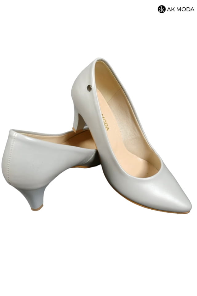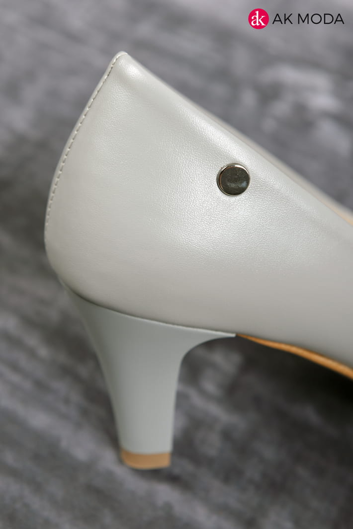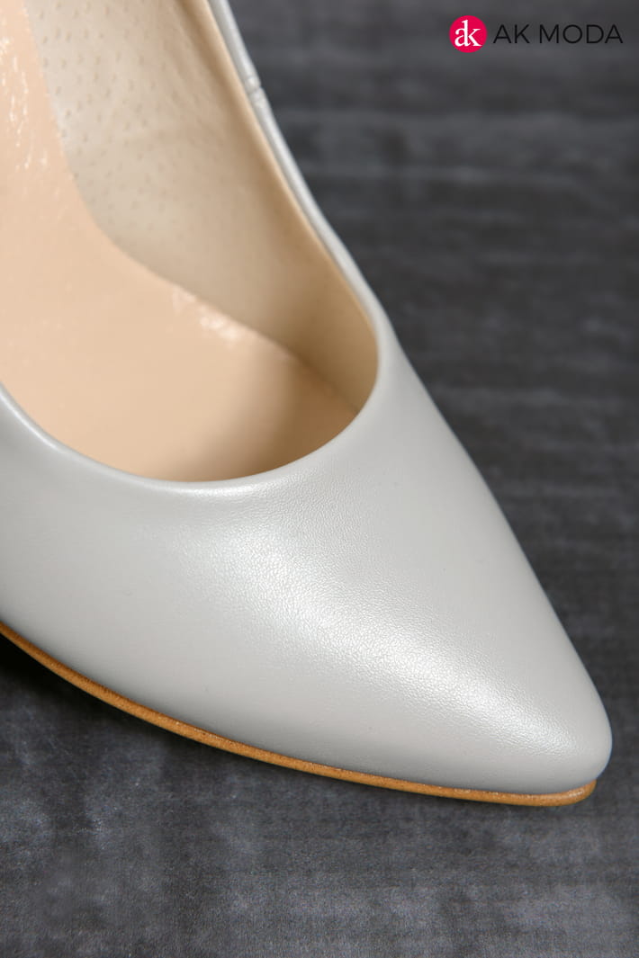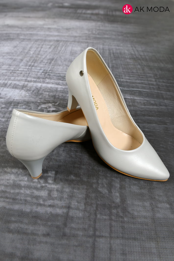 Obuwie damskie w szarym kolorze, na niewysokim obcasie.
