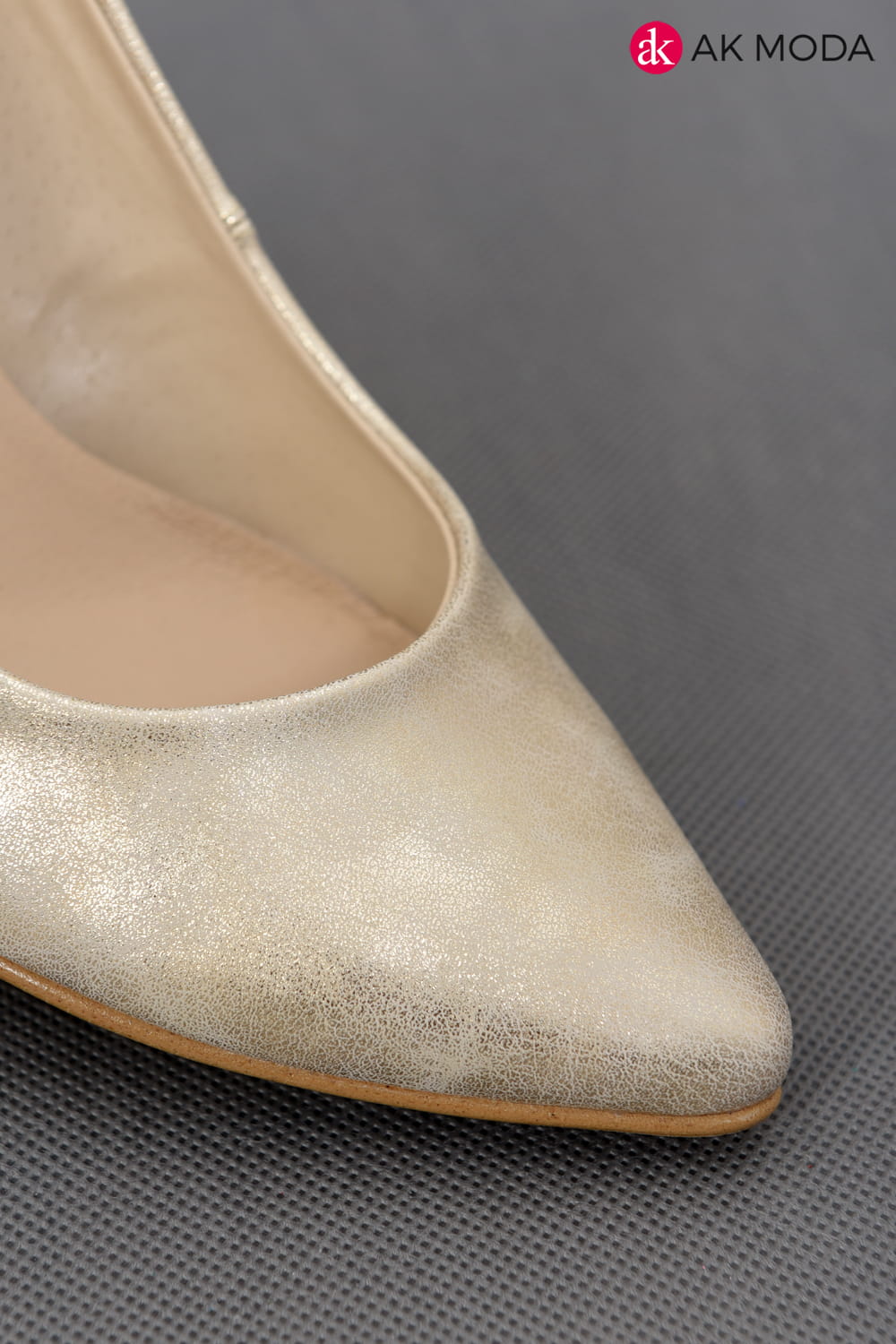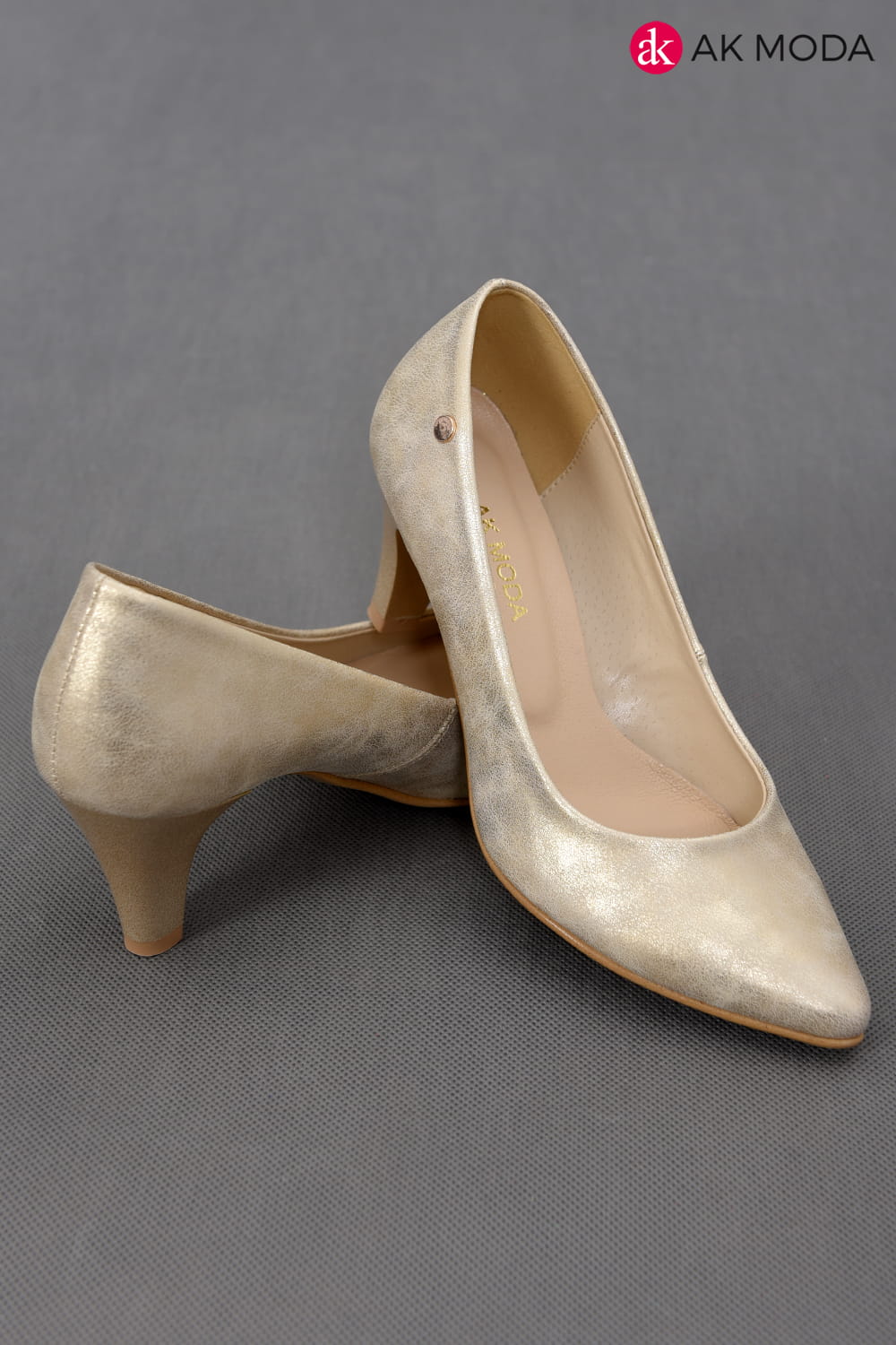Obuwie damskie złote z połyskiem, na niewysokim obcasie.