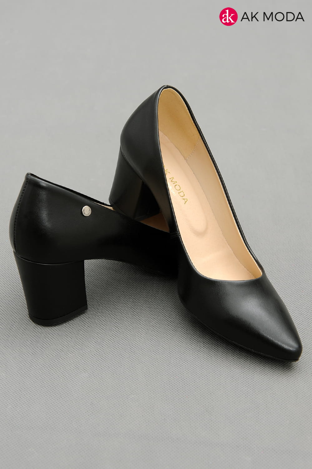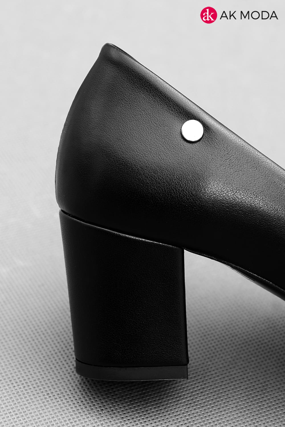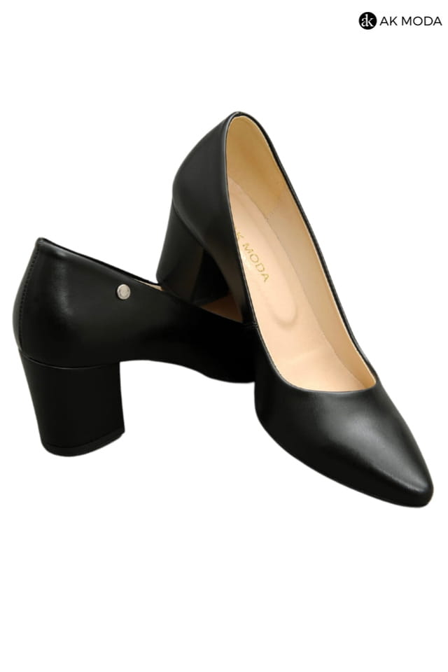 Obuwie damskie na niewysokim słupku w kolorze czarnym.