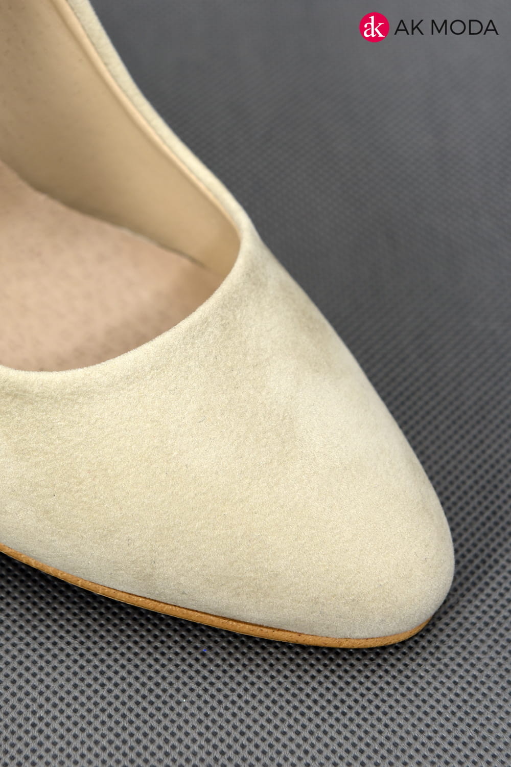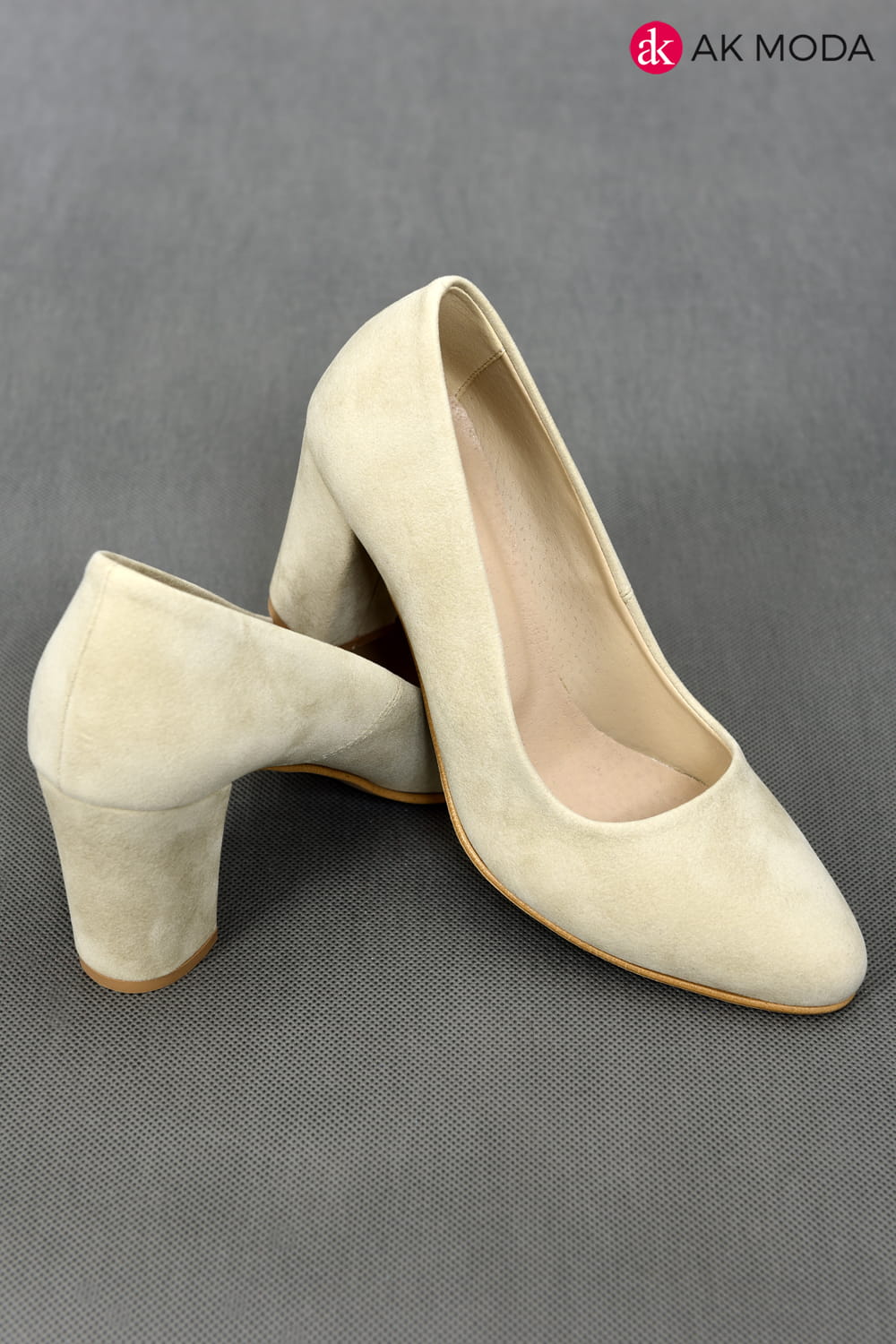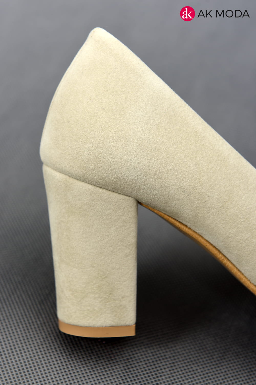 Obuwie damskie zamszowe w kolorze jasnobeżowym, na słupku.