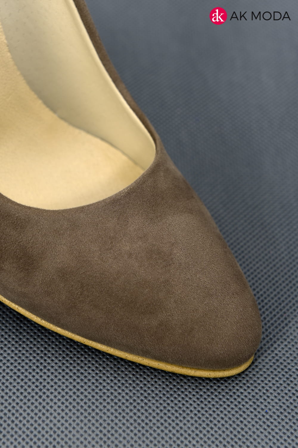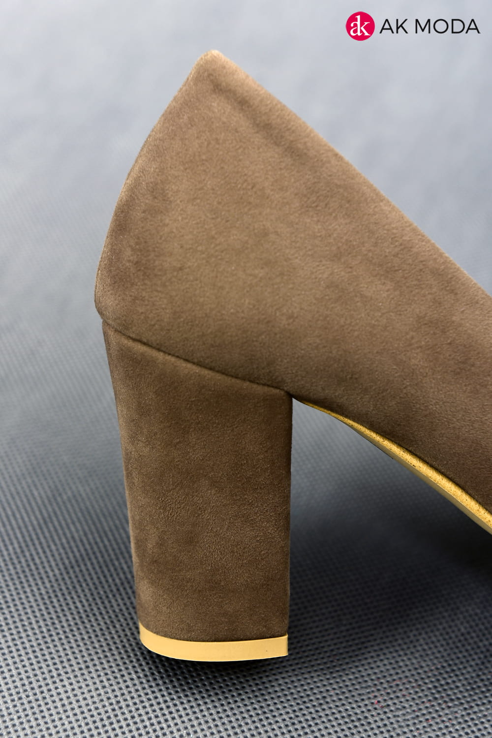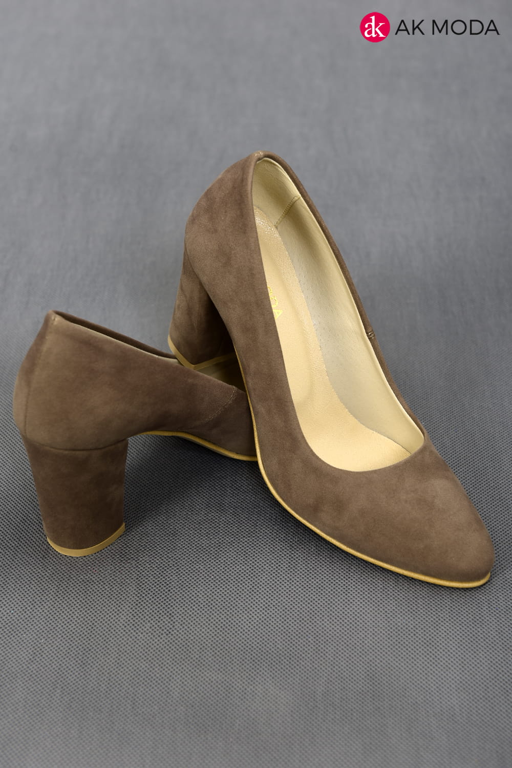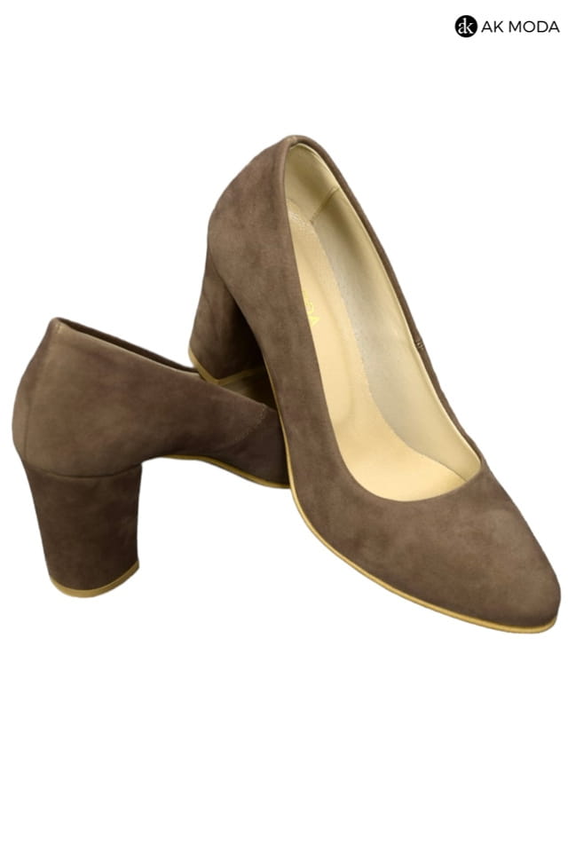 Obuwie damskie zamszowe w kolorze cappuccino, na słupku.