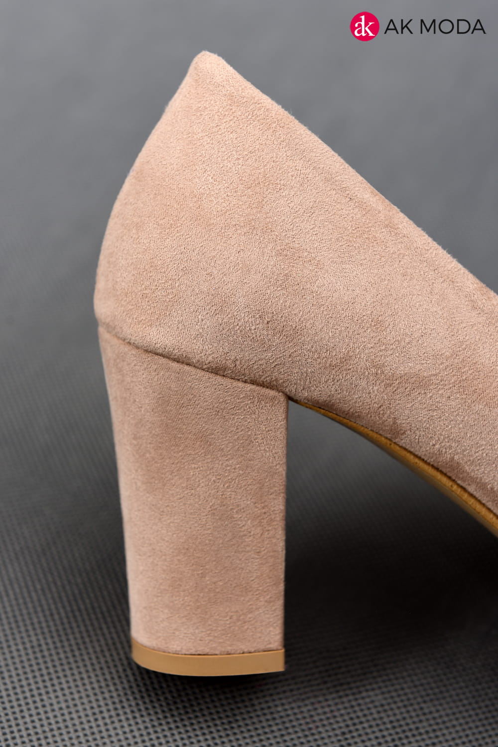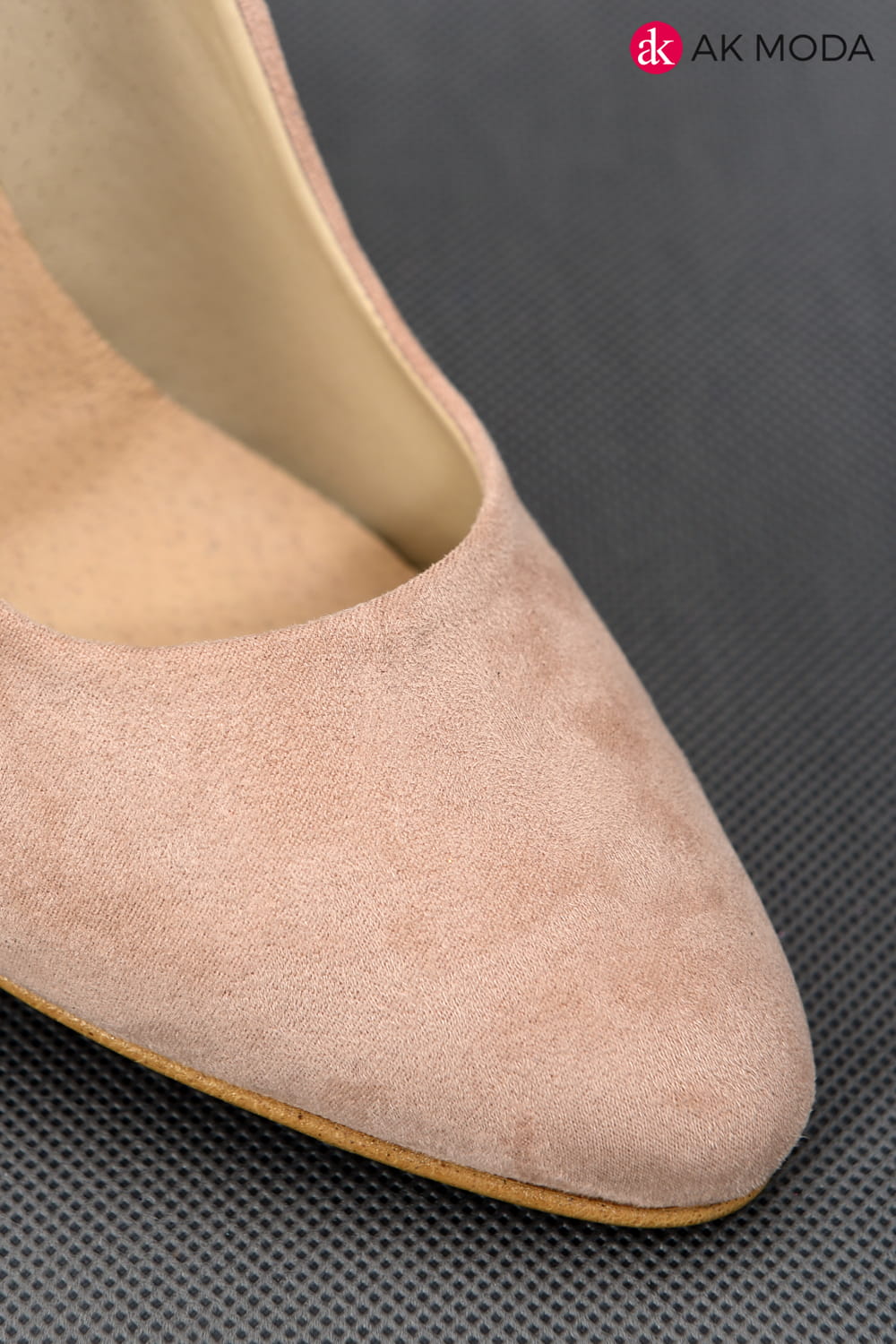 Obuwie damskie zamszowe w kolorze pudrowego różu, na słupku.