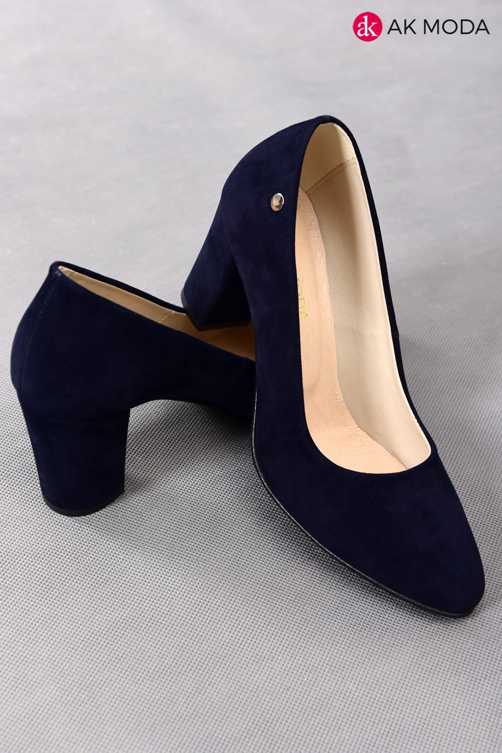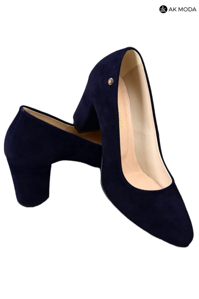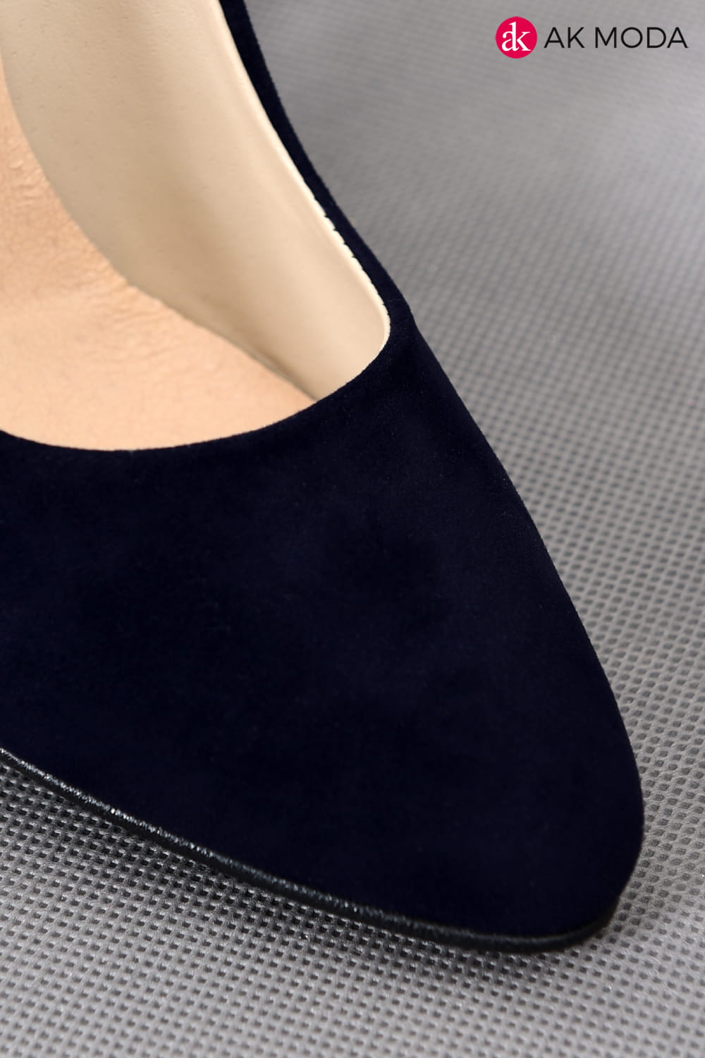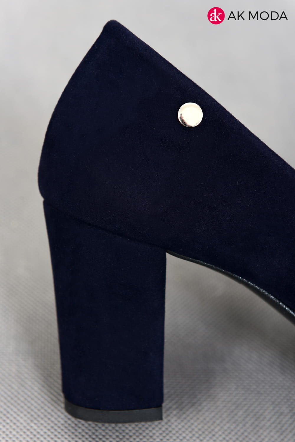 Obuwie damskie zamszowe w kolorze granatowym, na słupku.