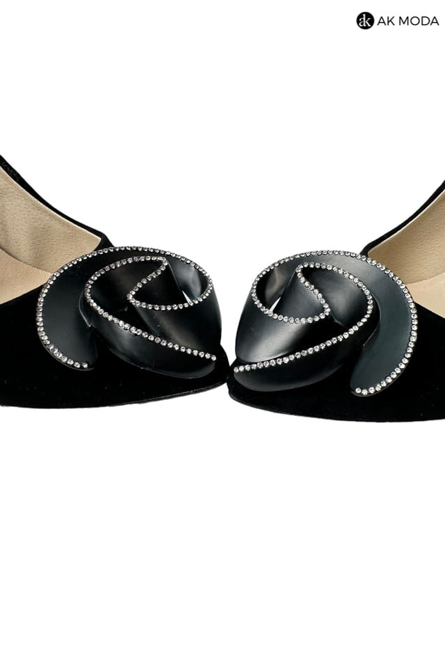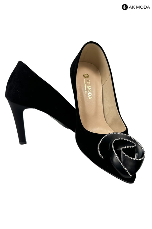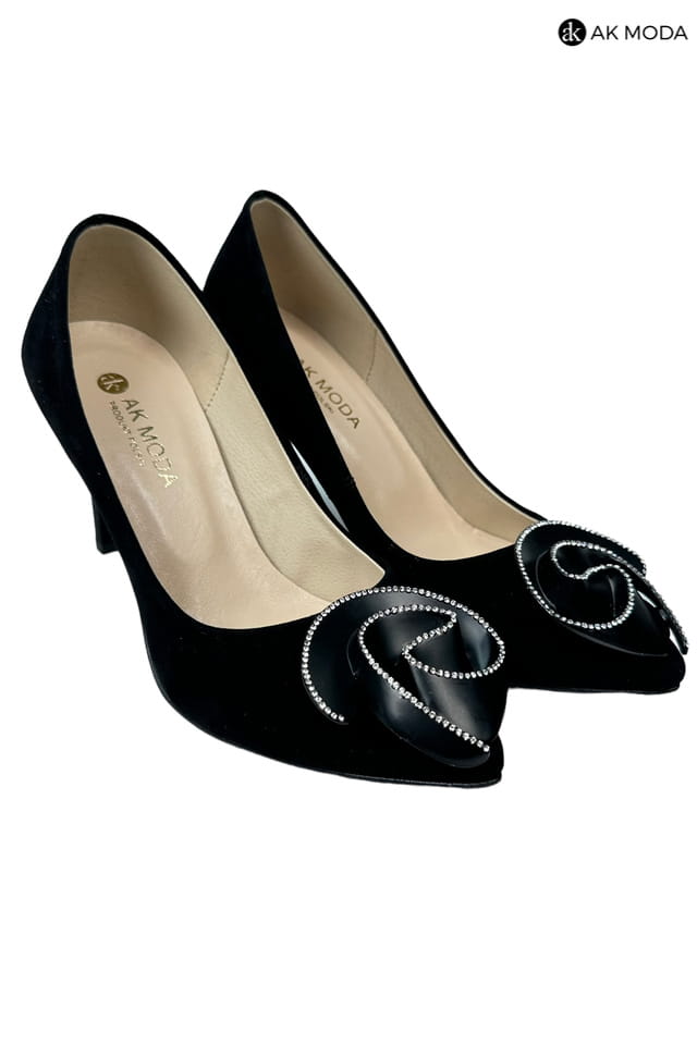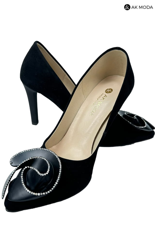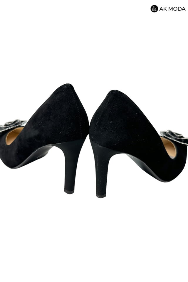 Czarne obuwie damskie wykonane z zamszowego materiału z błyszczącą ozdobą z przodu. Obcas wysoki, nosek w szpic.