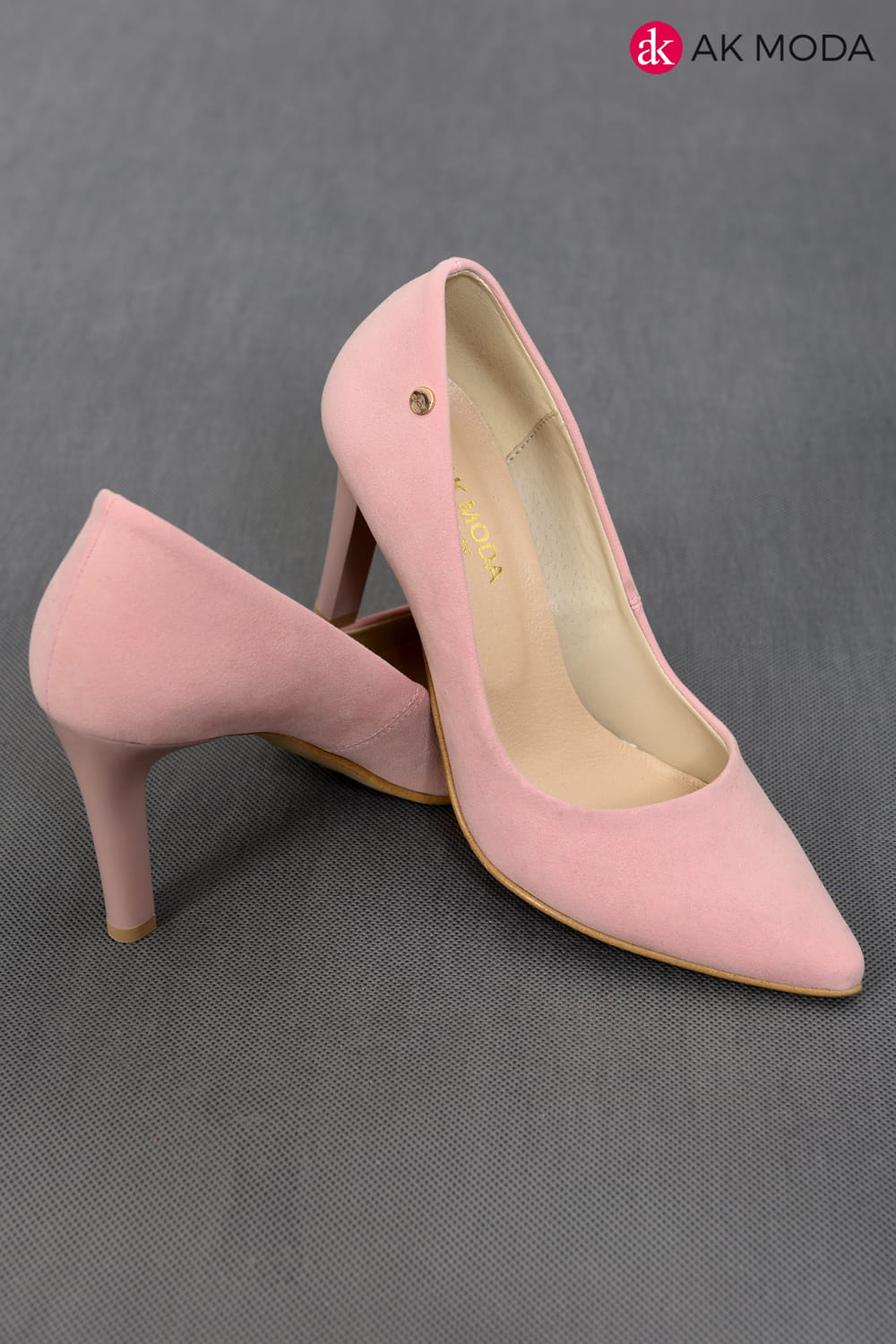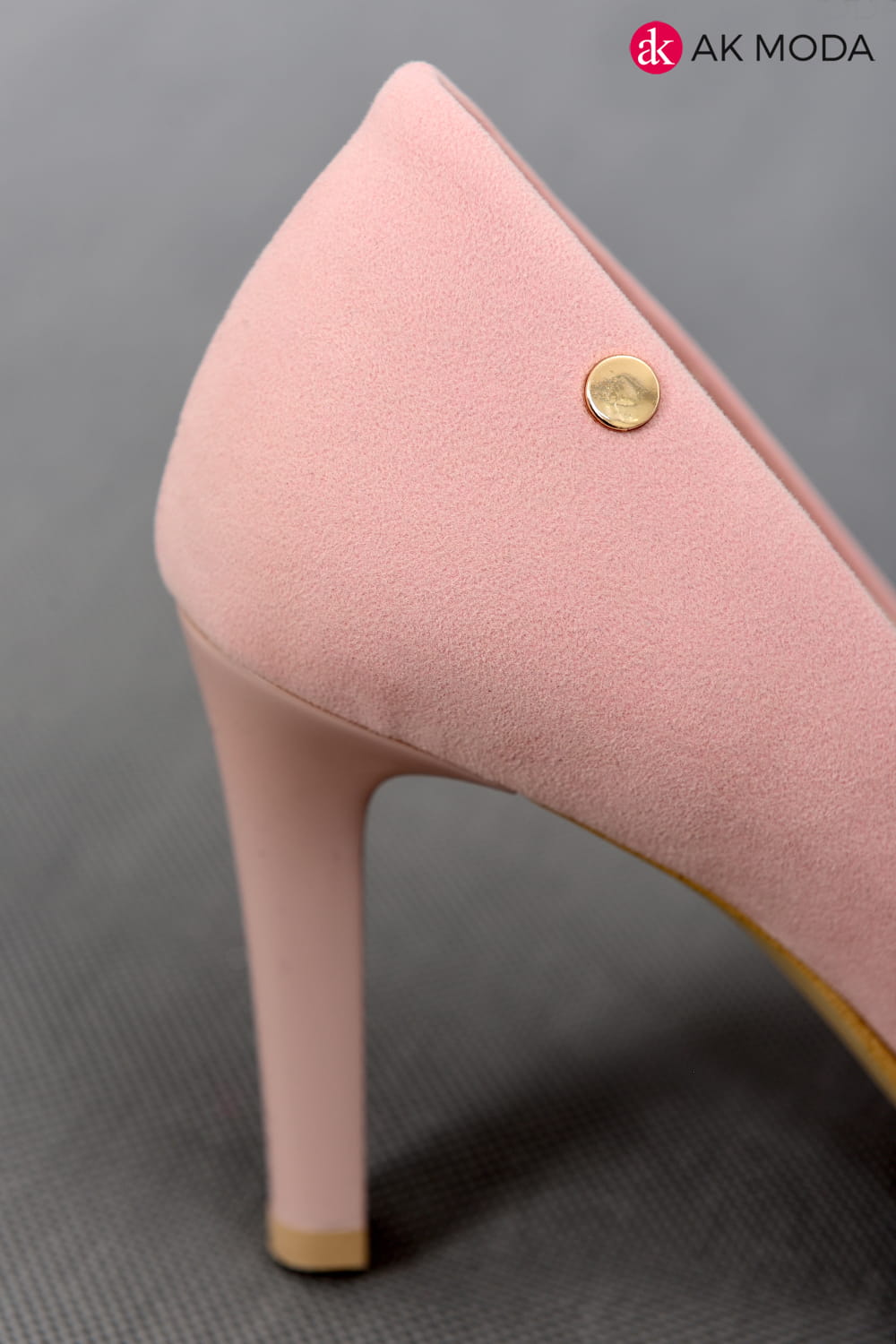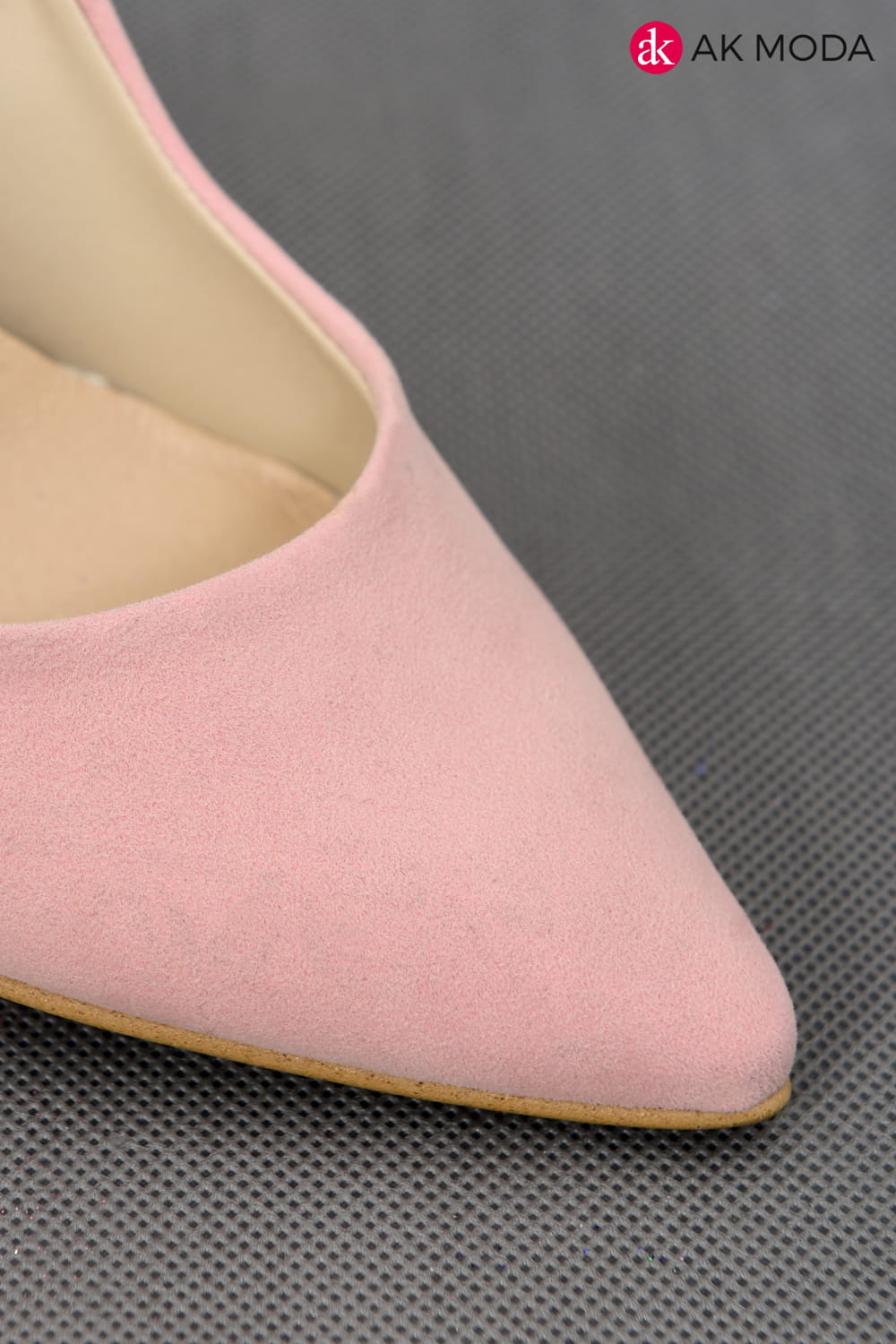 Obuwie damskie zamszowe w kolorze pudrowego różu, na obcasie.