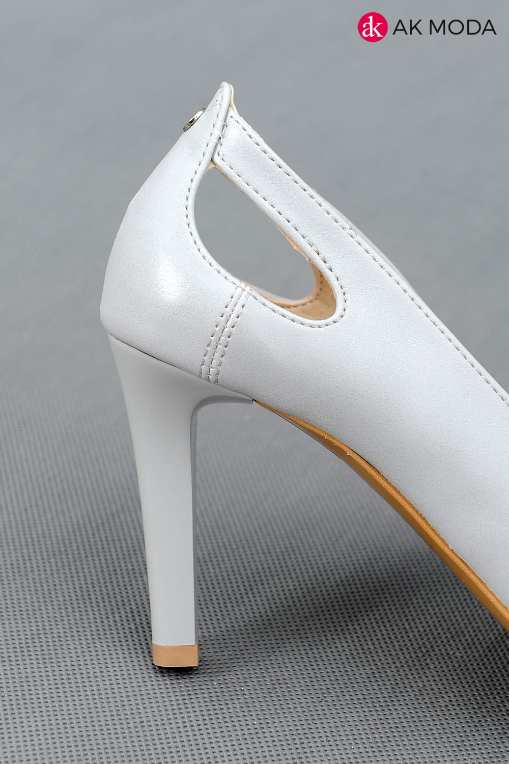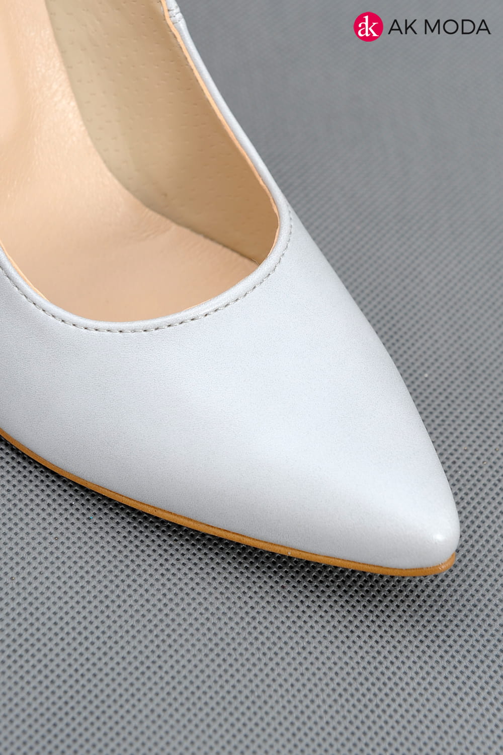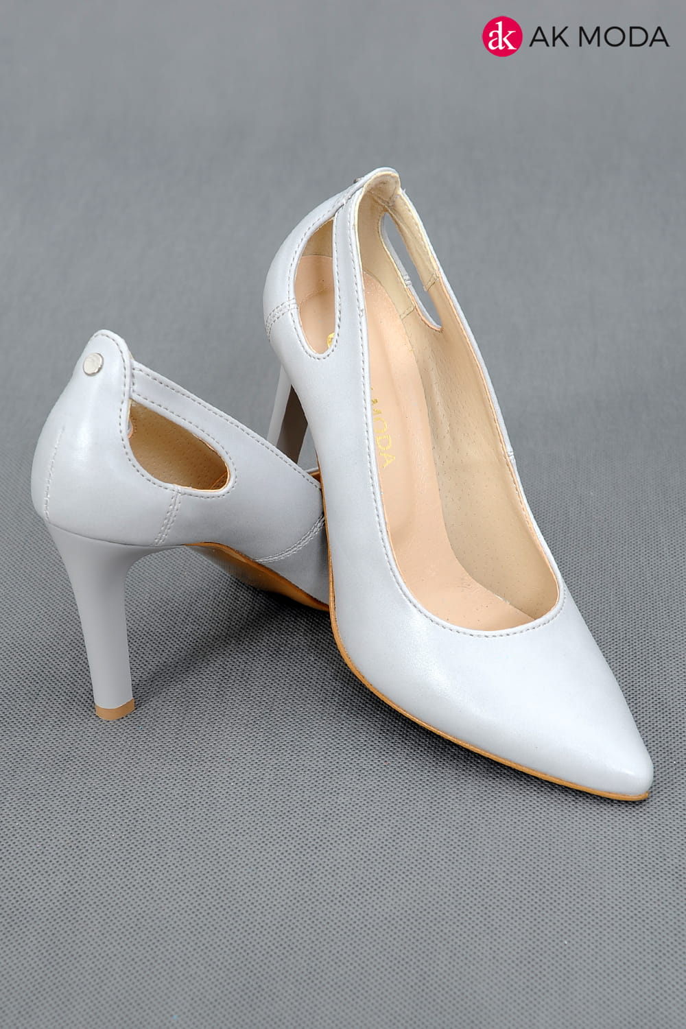 Obuwie damskie w kolorze szarym z wycięciem przy kostce, na obcasie.