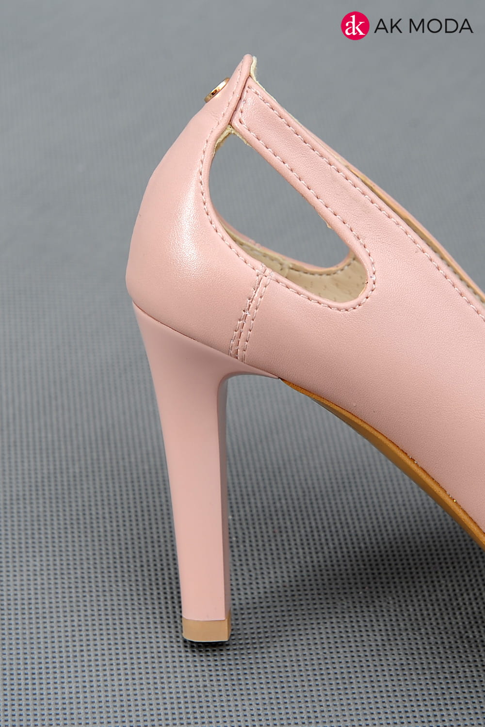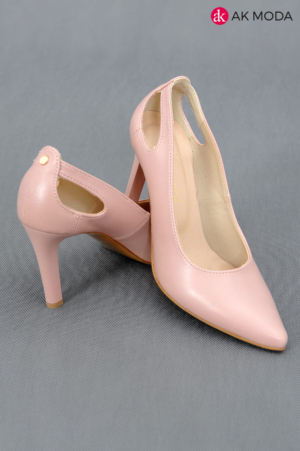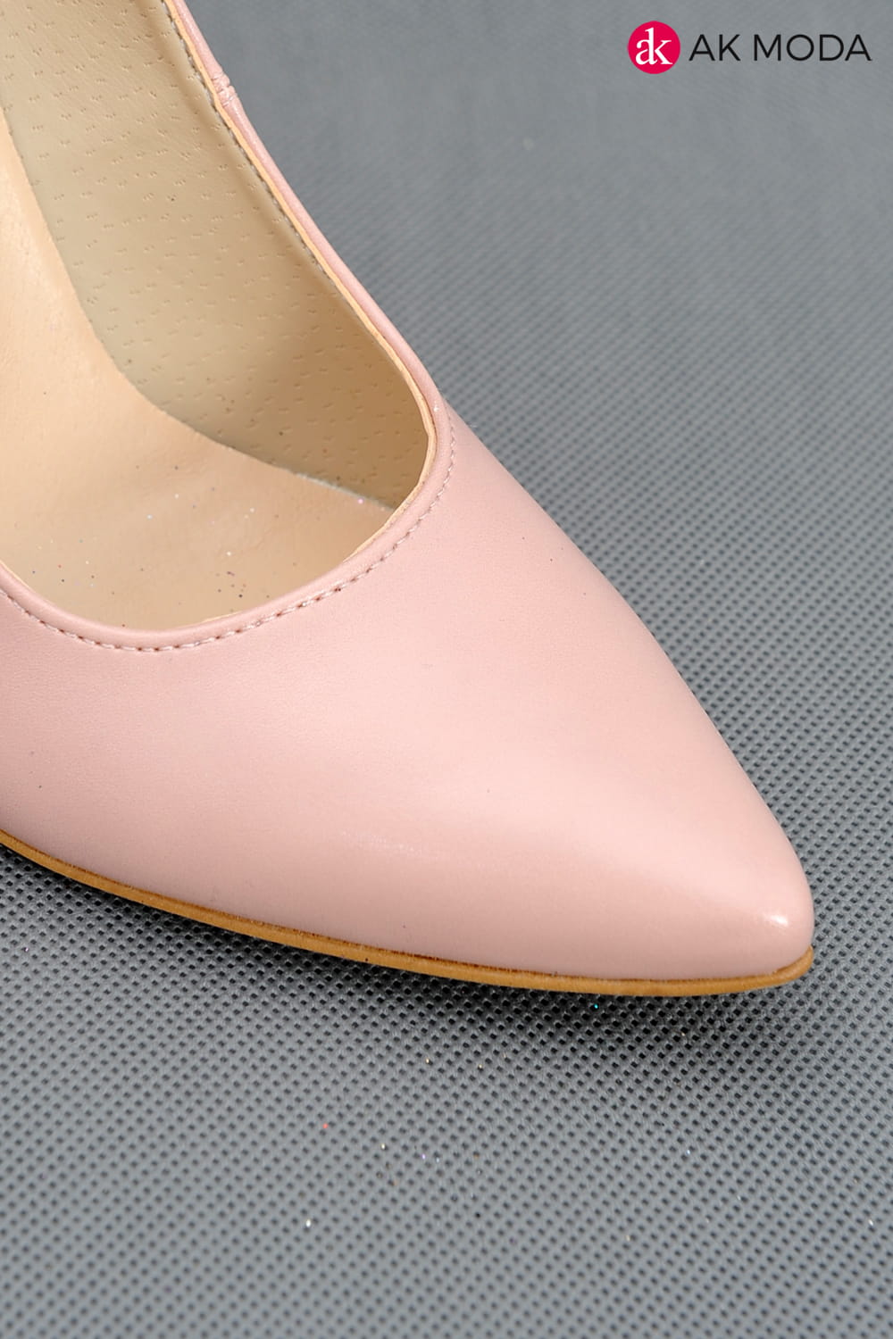 Obuwie damskie w kolorze pudrowego różu z wycięciem przy kostce, na obcasie.