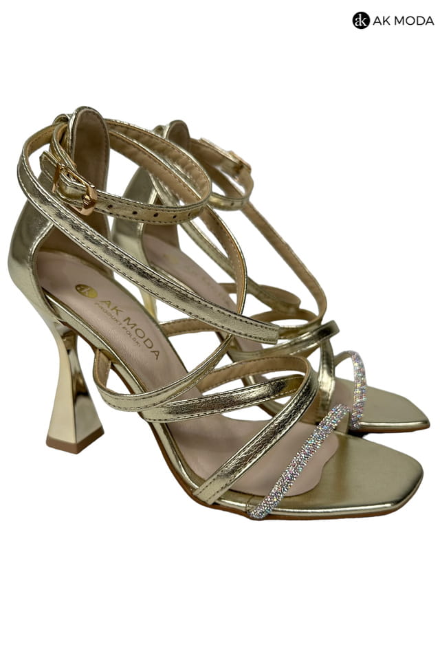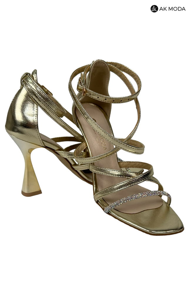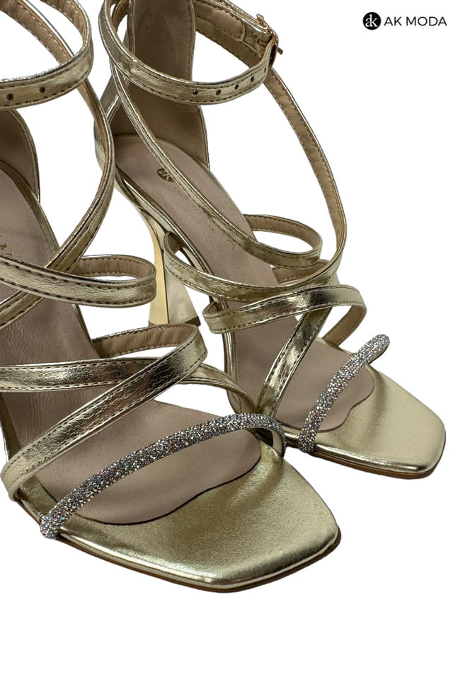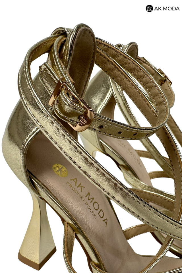 Eleganckie sandały w kolorze złotym z ozdobnym paskiem. Kieliszkowy obcas, zapięcie wokół kostki.