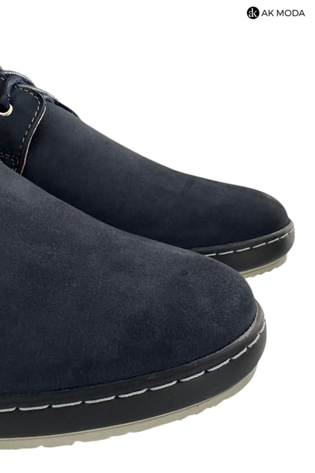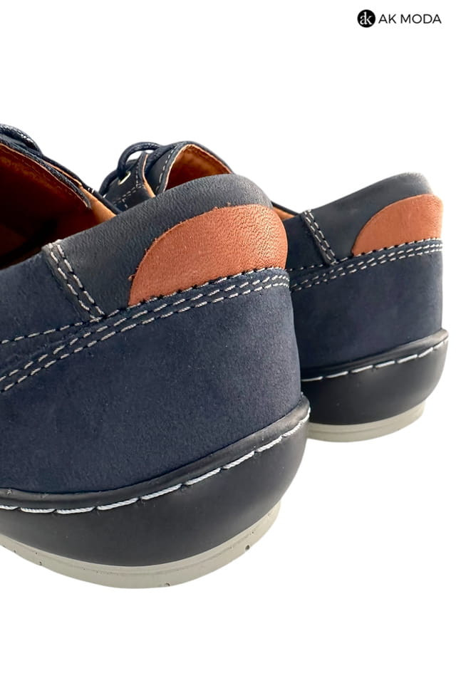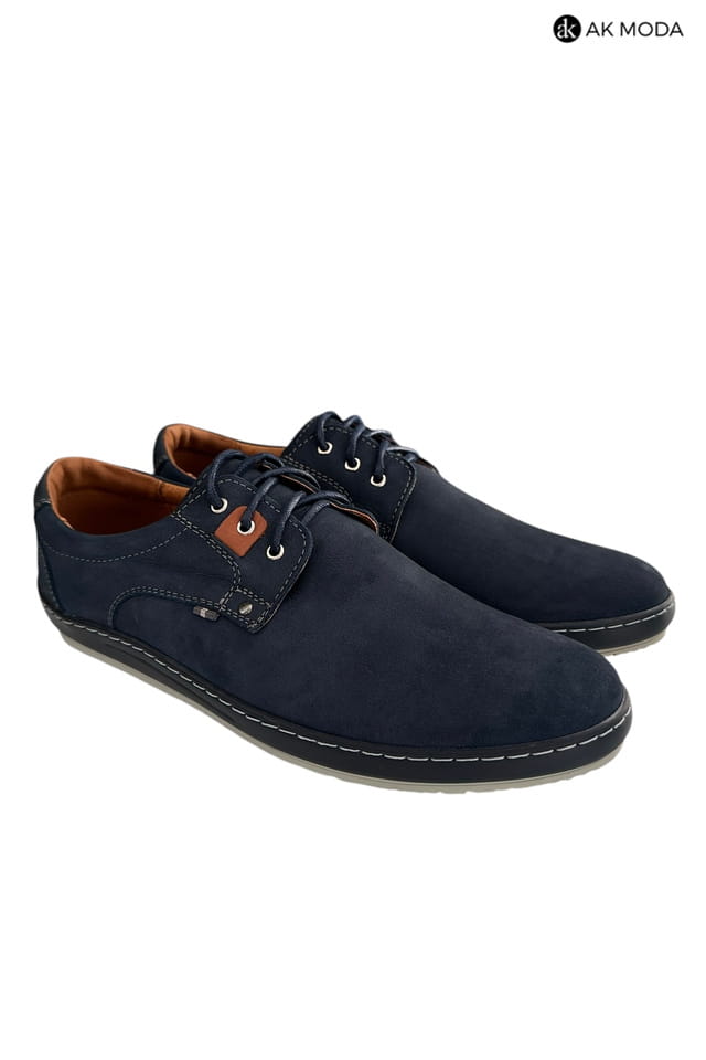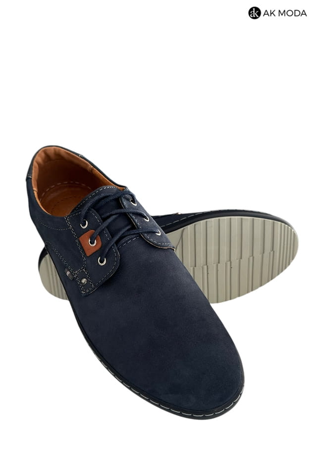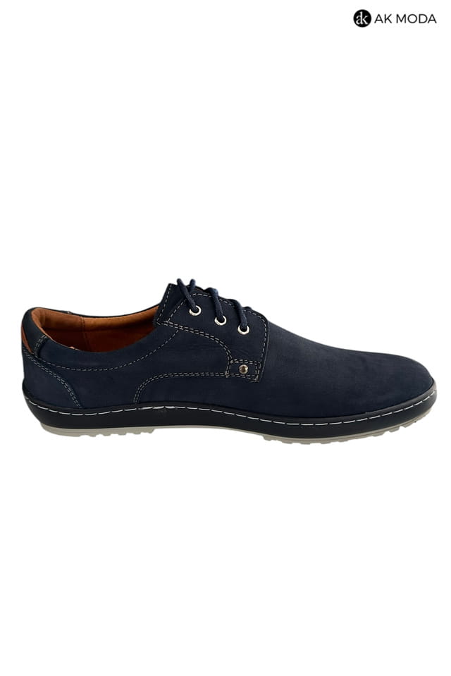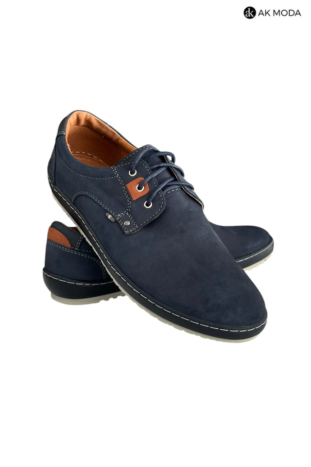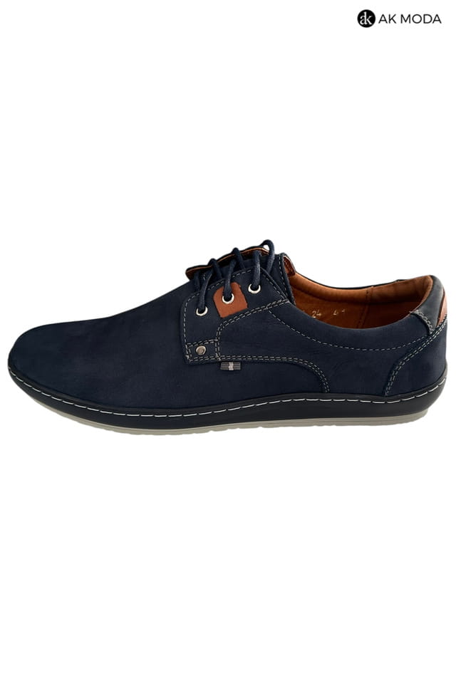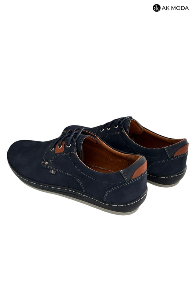 Casualowe półbuty męskie w kolorze granatowym z brązowymi akcentami. Buty w całości wykonane ze skóry naturalnej, środek - skóra licowa, wirzch - nubuk.