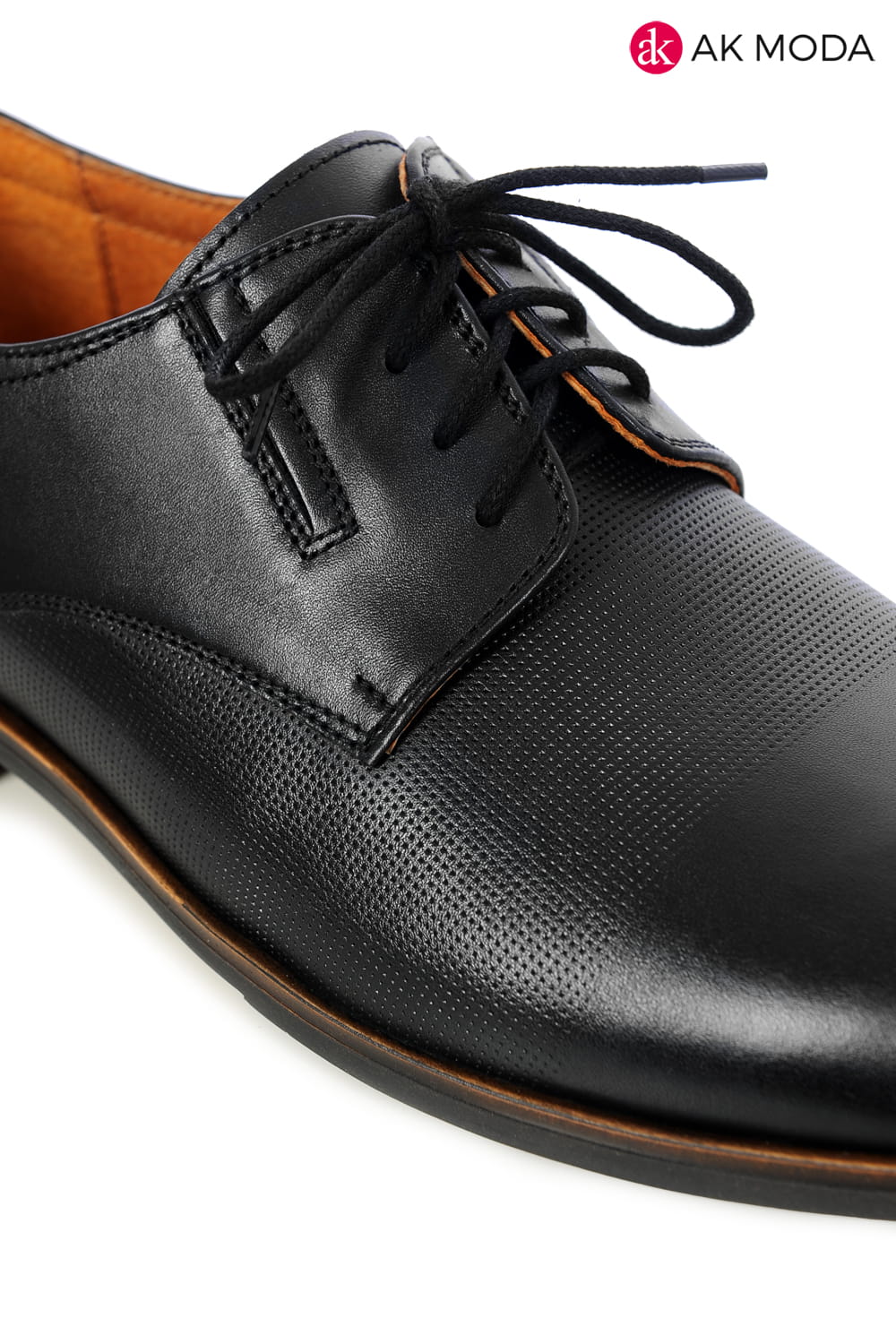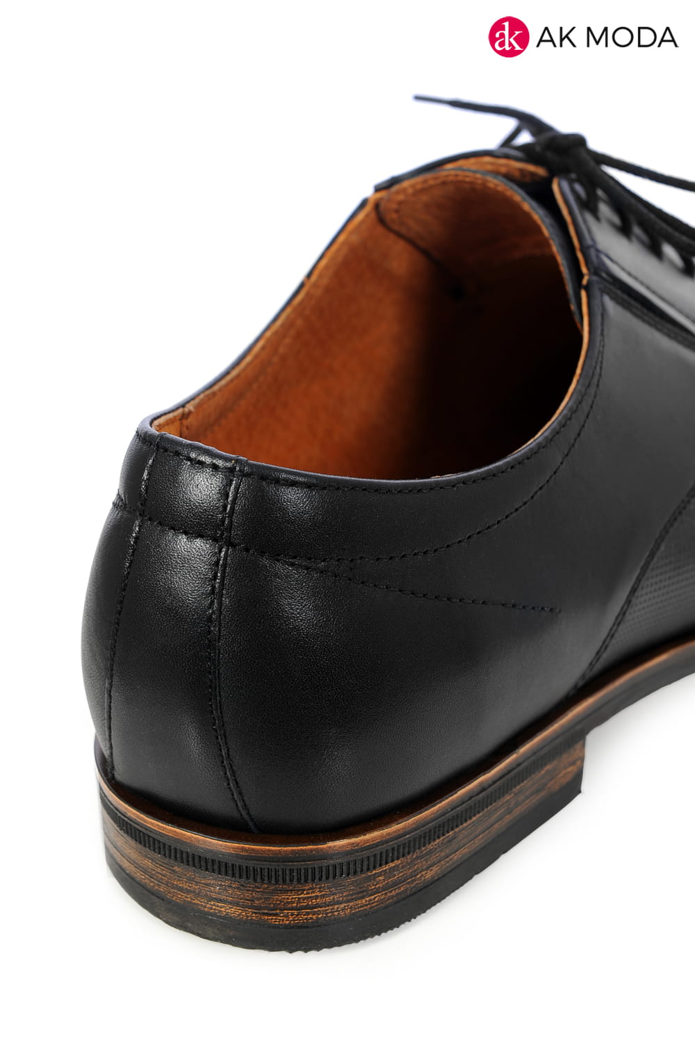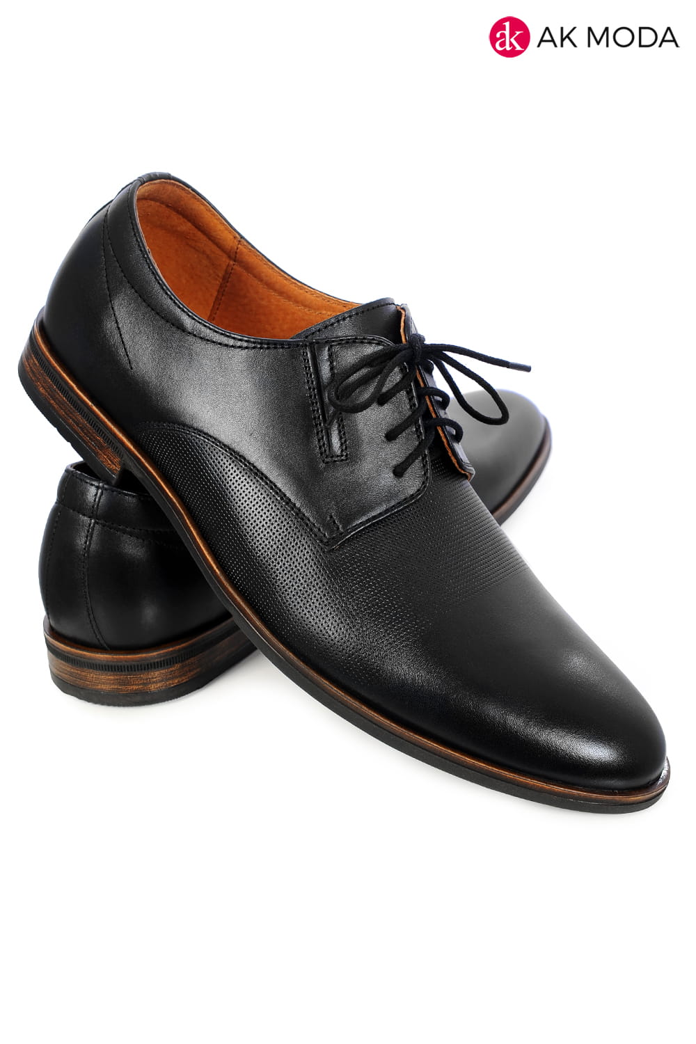Wizytowe obuwie męskie w kolorze czarnym na brązowej podeszwie. Zestawienie gładkiej skóry z elementami struktury tworzy modne połączenie.