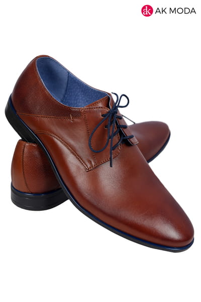 Brązowe obuwie męskie z elementami struktury. Chabrowe sznurówki i przeszycia w tym samym kolorze tworzą ciekawą alternatywę dla klasycznego modelu. Wykonane w całości ze skóry.