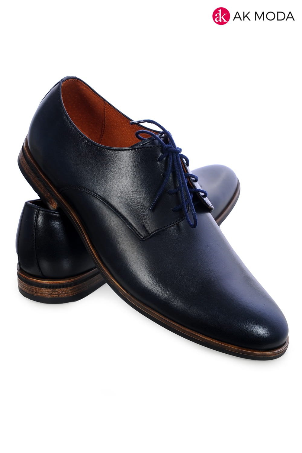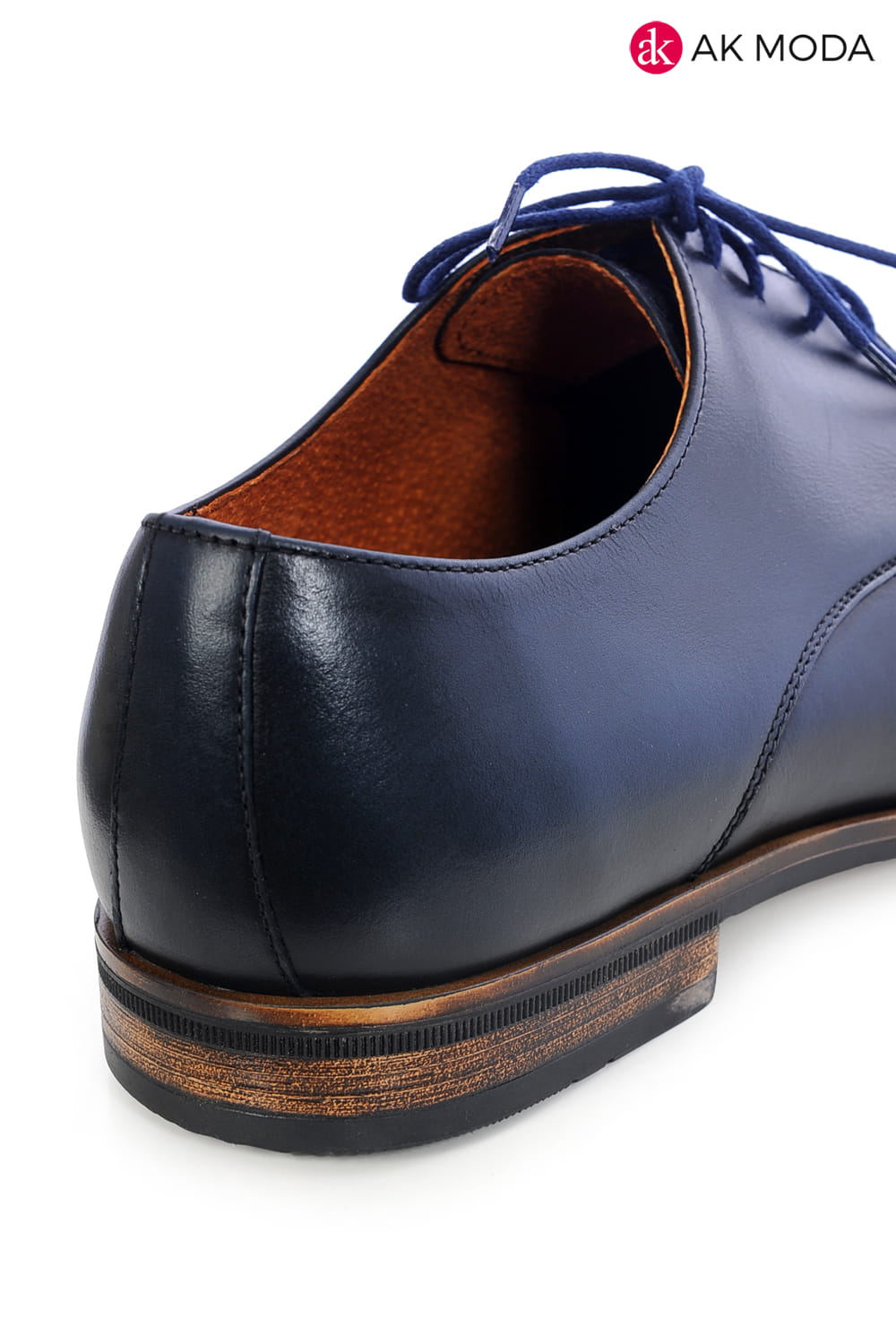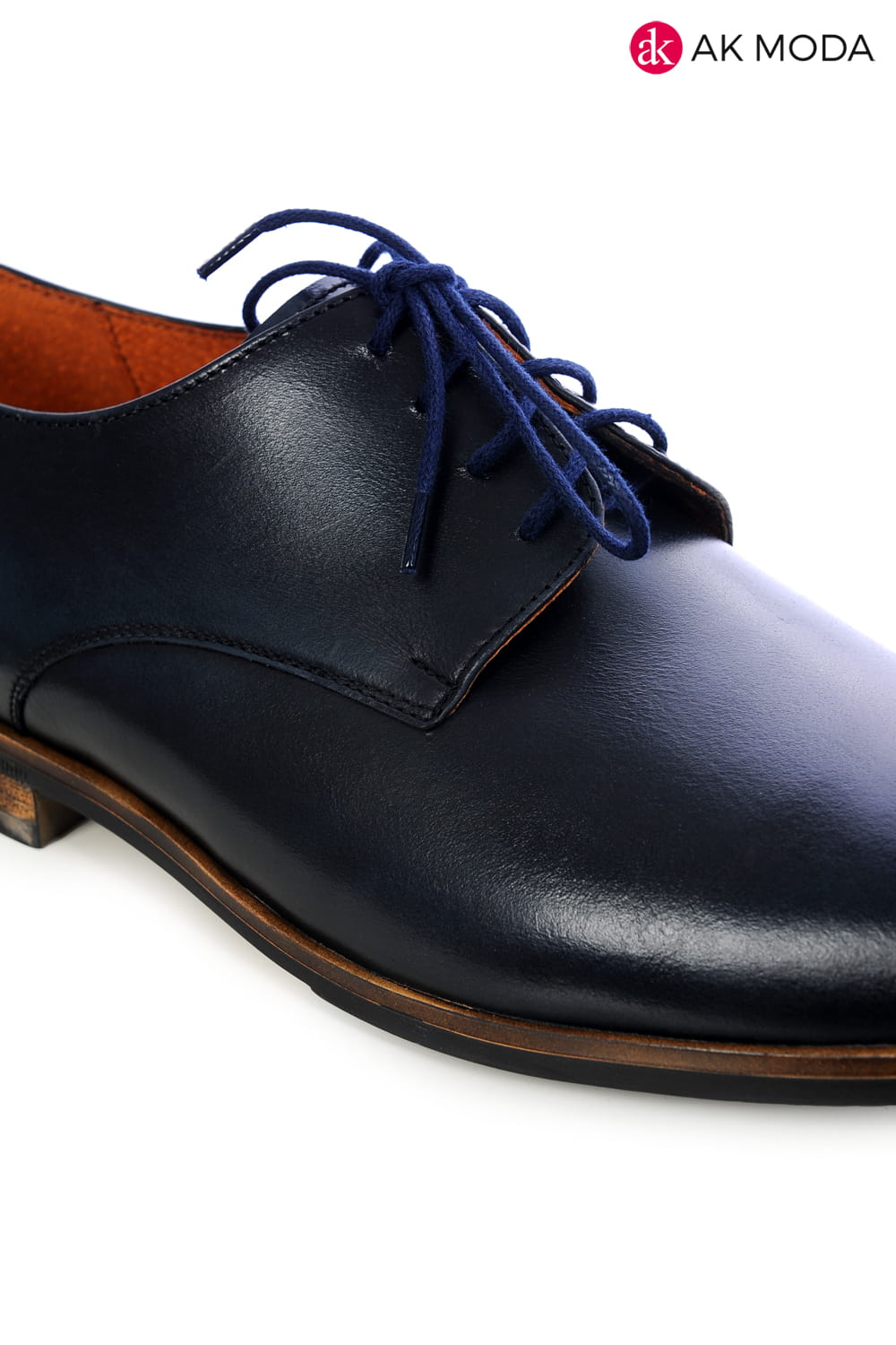 Modne obuwie męskie w kolorze granatowym z brązową podeszwą. Wykonane w całości ze skóry naturalnej.