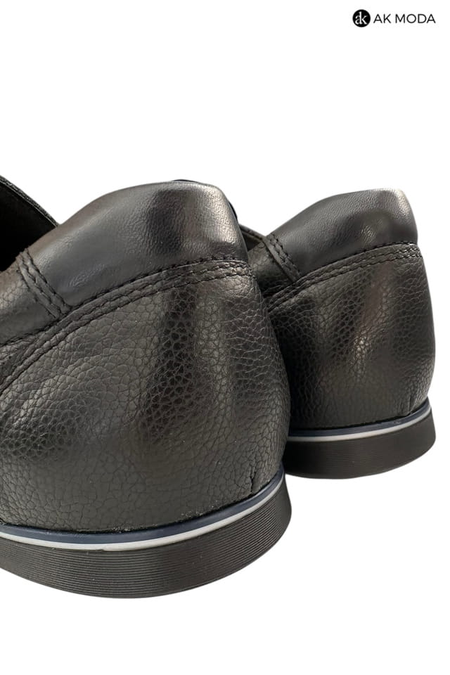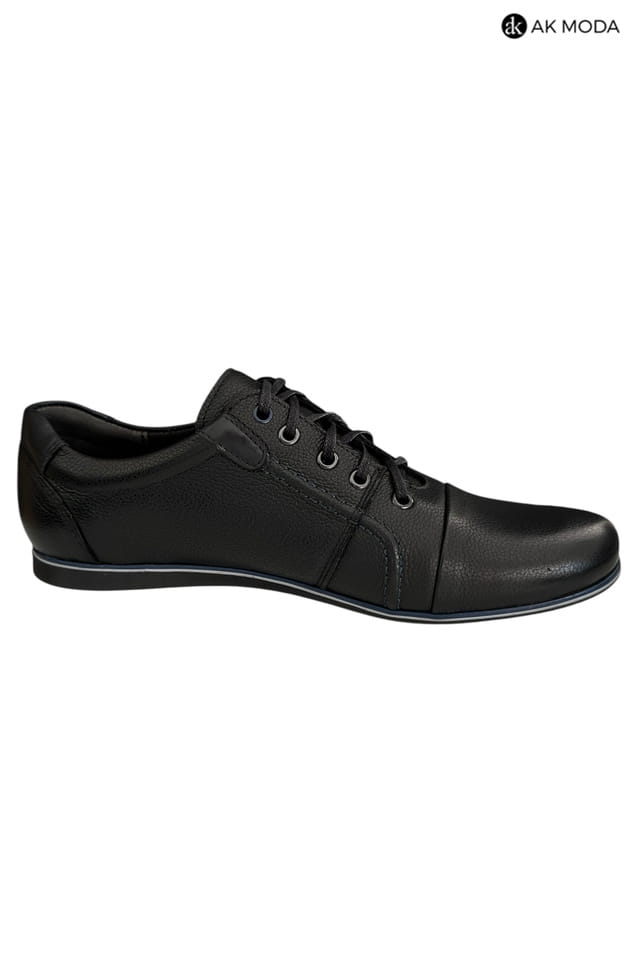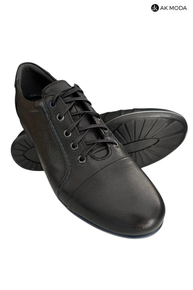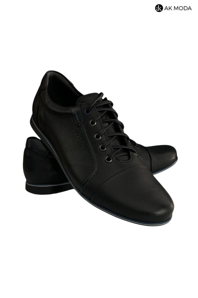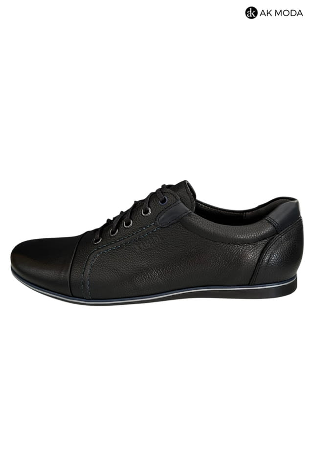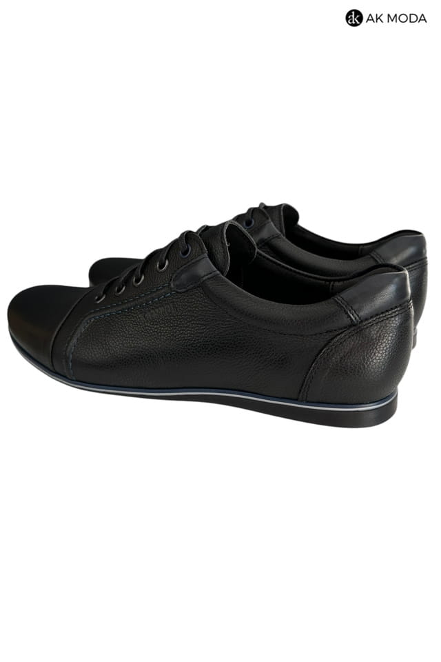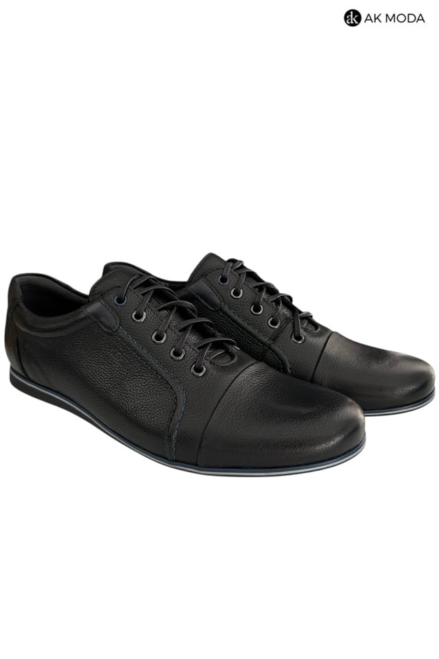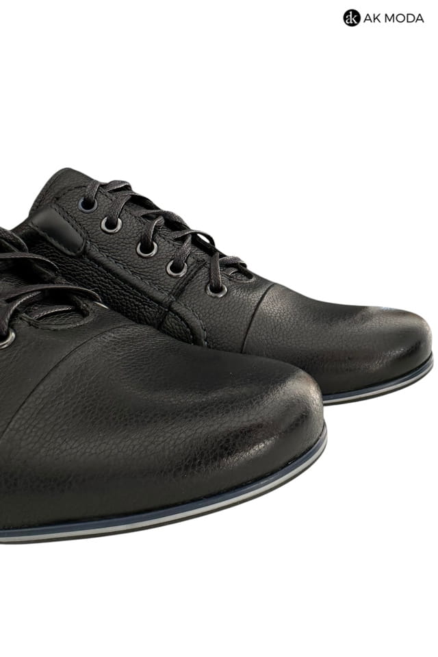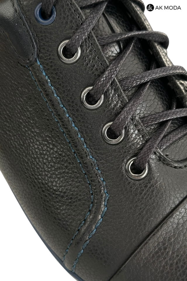 Casualowe półbuty męskie w kolorze czarnym z niebieskimi akcentami. Wykonane w całości ze skóry naturalnej, zapewnią komfort i wygodę w chodzeniu.