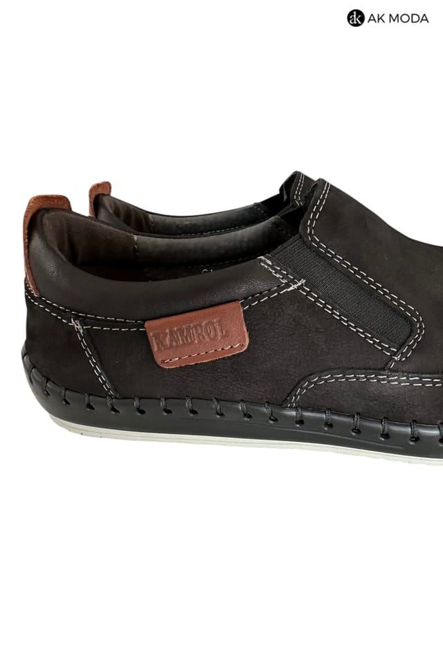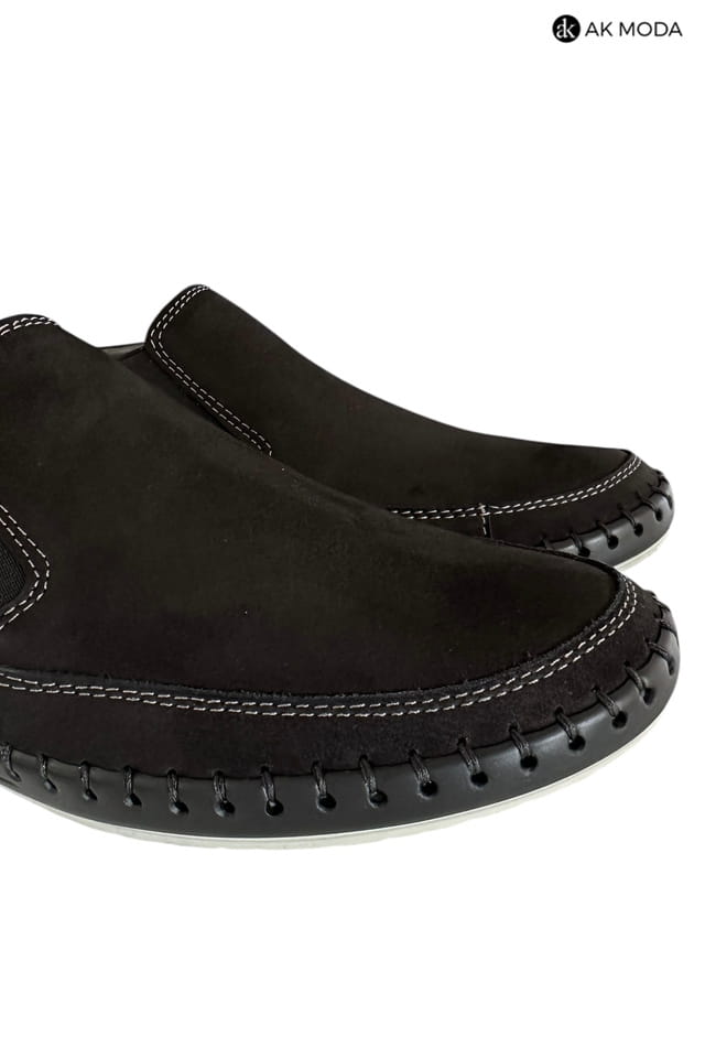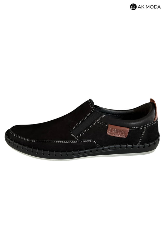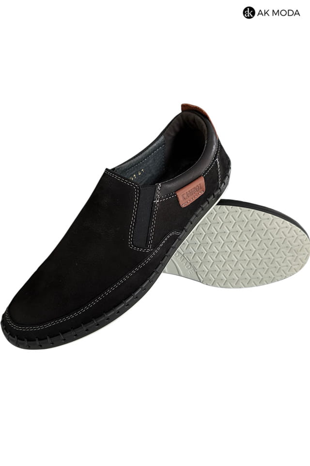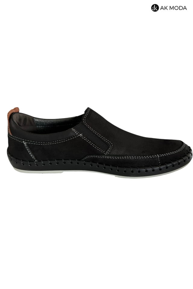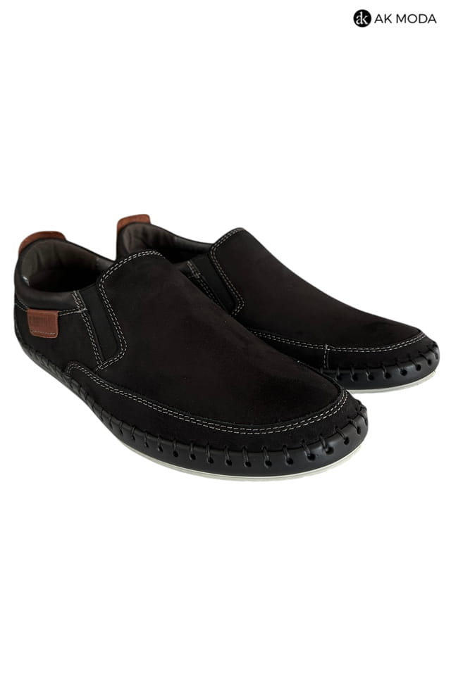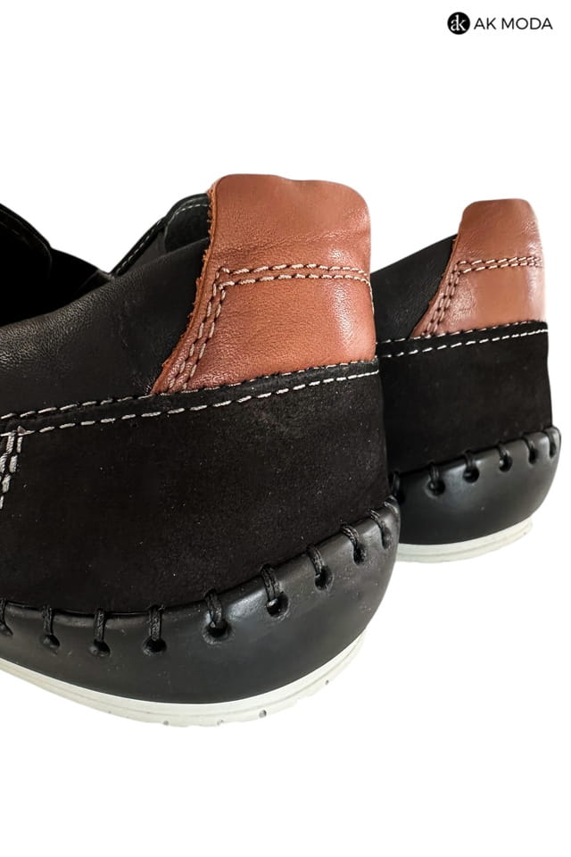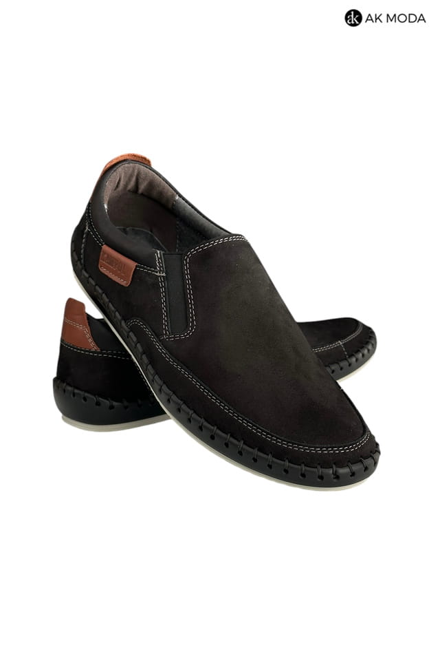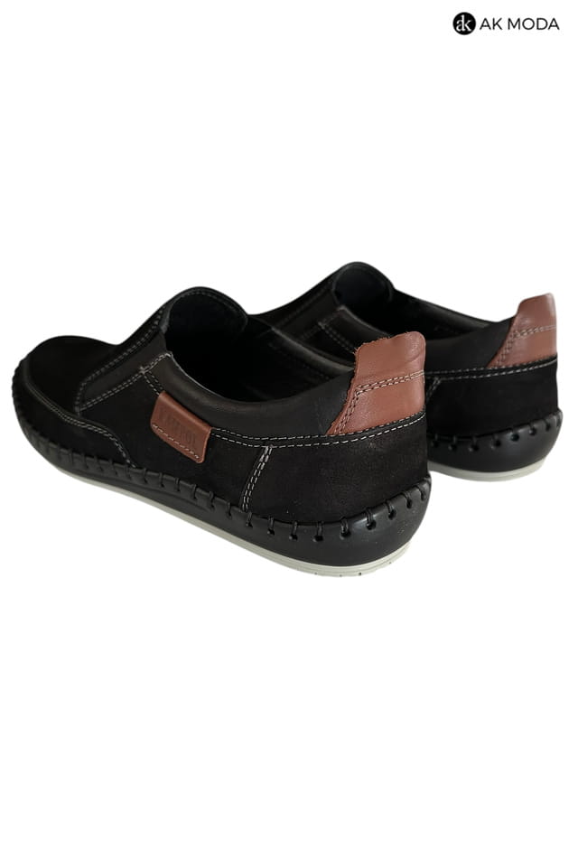 Lekkie, elastyczne mokasyny męskie w kolorze czarnym z brązowymi akcentami. Buty w całości wykonane ze skóry naturalnej, wierzch - nubuk, środek - skóra licowa.