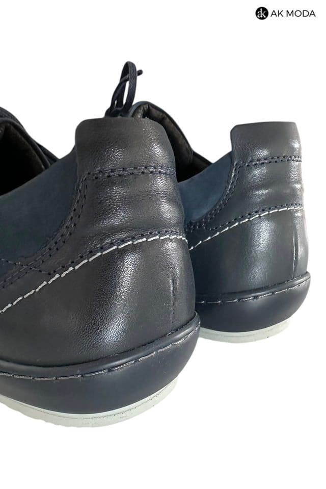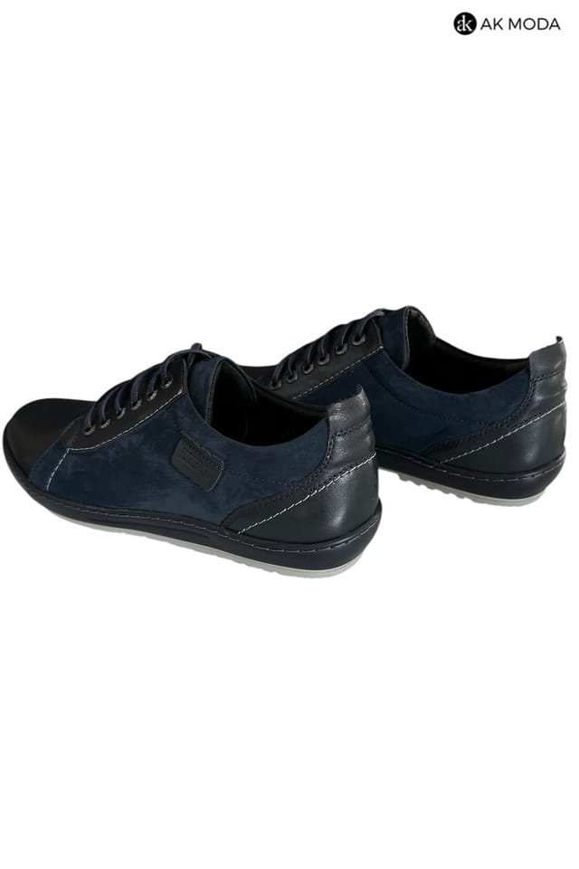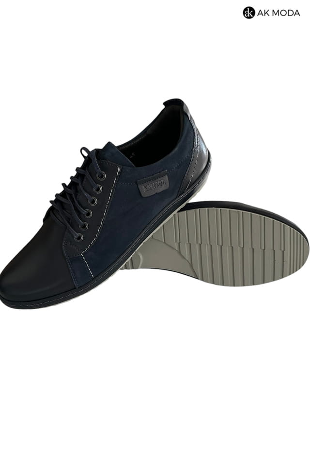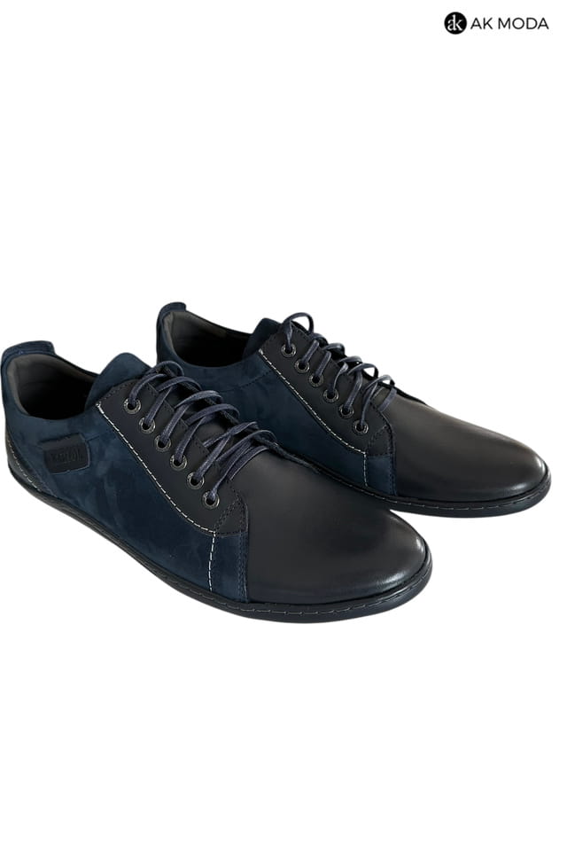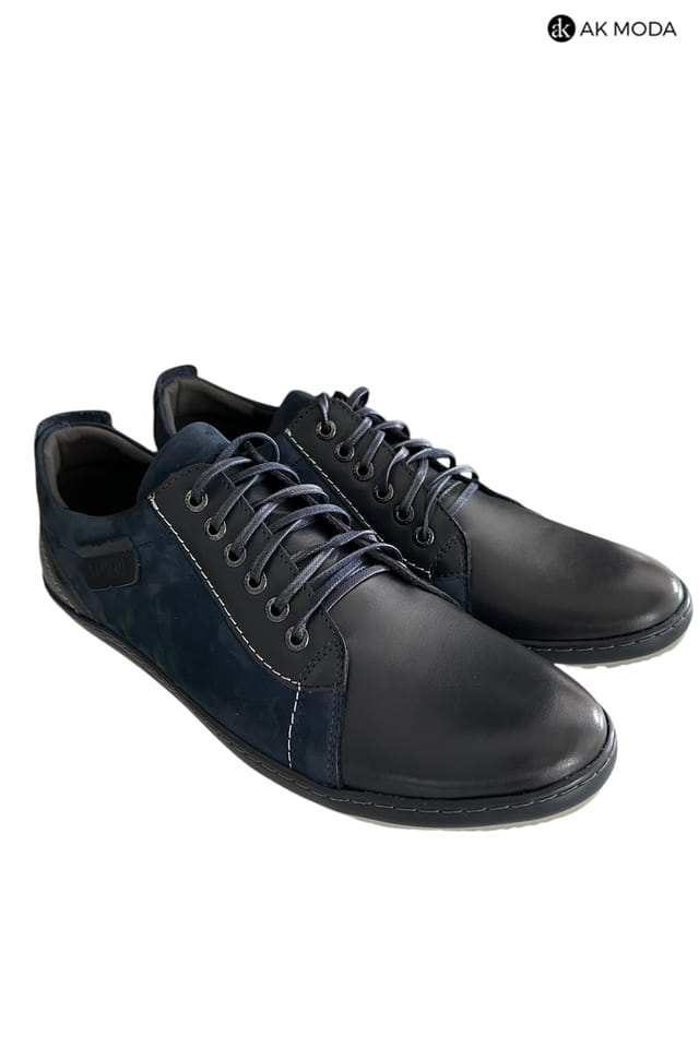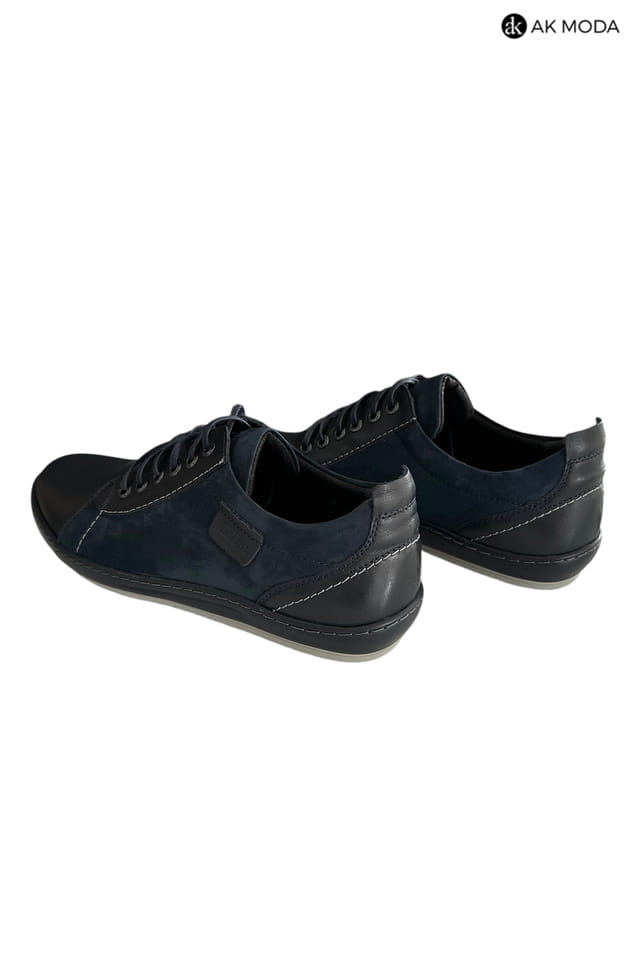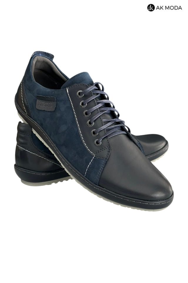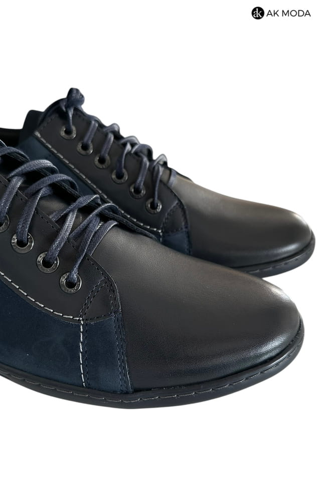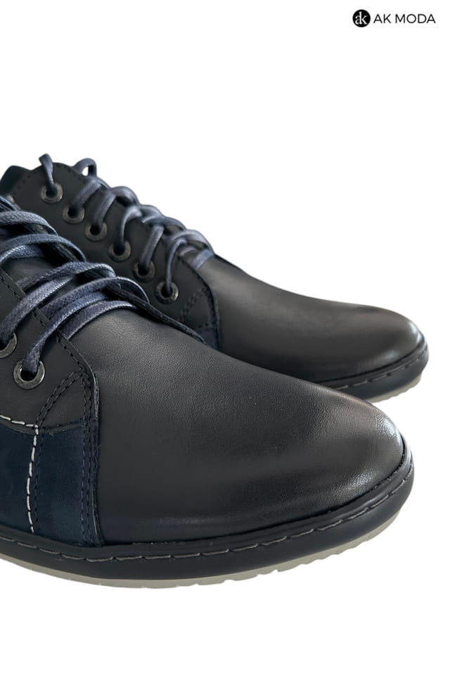 Sznurowane, casualowe półbuty męskie w kolorze granatowym. Buty zostały wykonane z połączenia naturalnej skóry licowej i nubukowej.