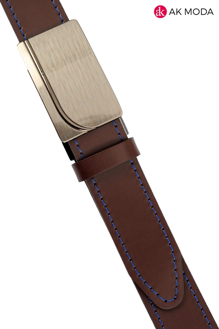 Elegancki skórzany męski pasek w kolorze ciemnobrązowym z chabrowym obszyciem. Łatwo regulowana automatyczna klamra. Możliwość skrócenia.