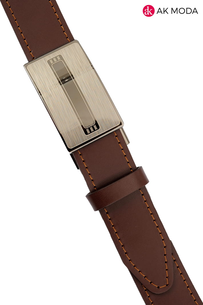 Elegancki skórzany męski pasek w kolorze ciemnobrązowym z obszyciem. Łatwo regulowana automatyczna klamra. Możliwość skrócenia.