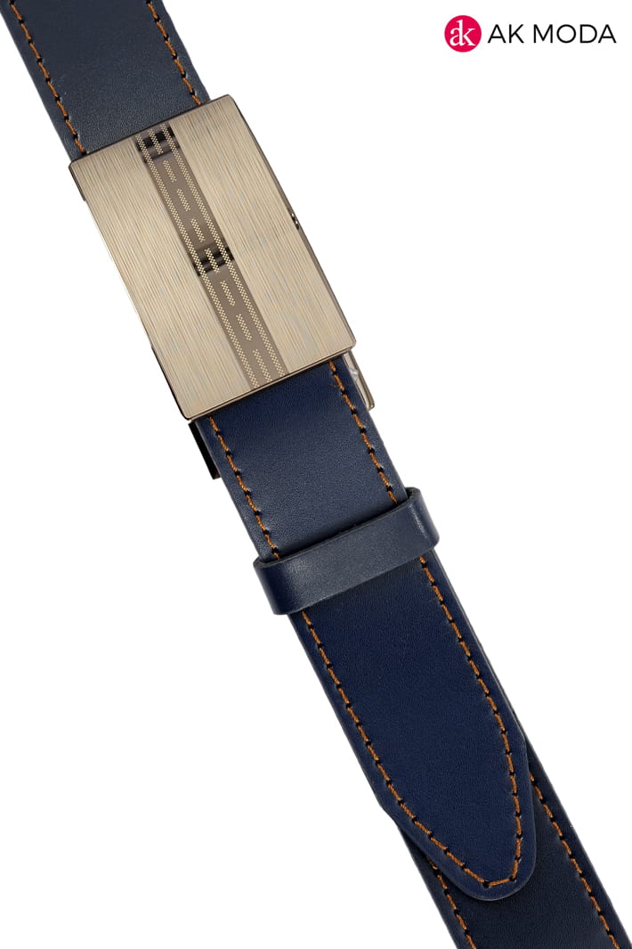 Elegancki skórzany męski pasek w kolorze granatowym z brązowym obszyciem. Łatwo regulowana automatyczna klamra. Możliwość skrócenia.