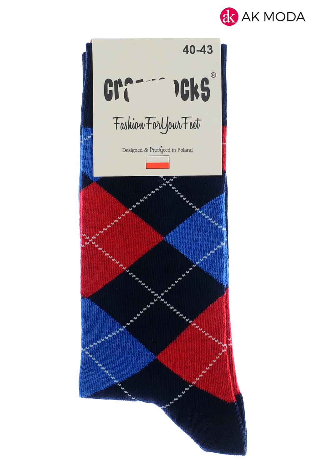 Granatowe skarpety męskie w niebiesko - czerwone romby.