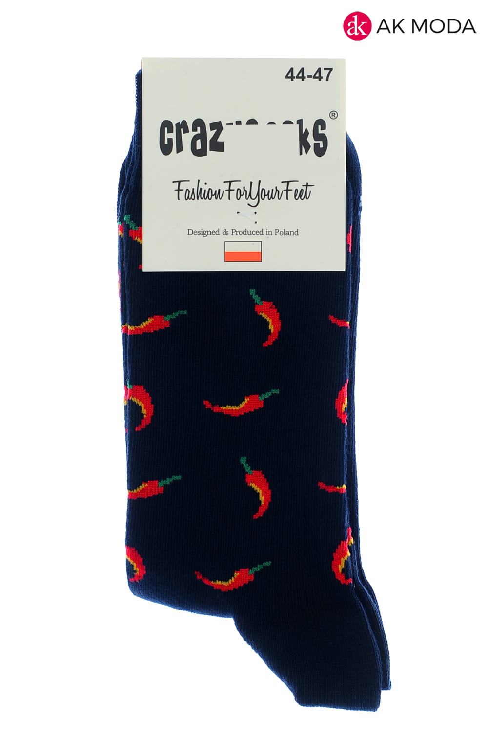 Granatowe skarpety męskie w czerwone papryczki.