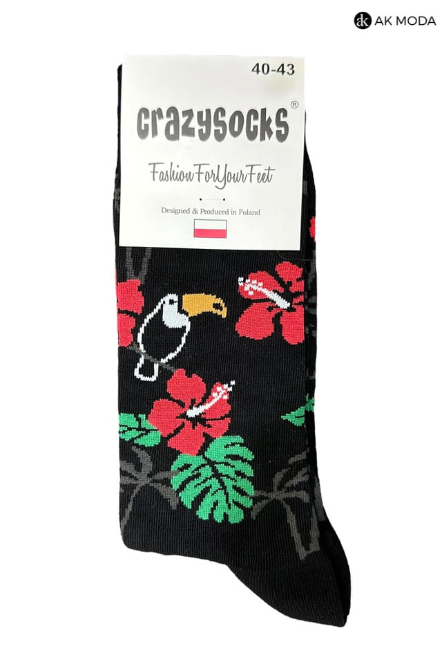 Czarne skarpety męskie z motywem tukanów i roślin.