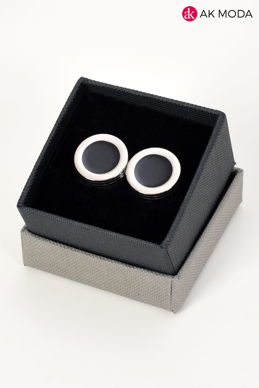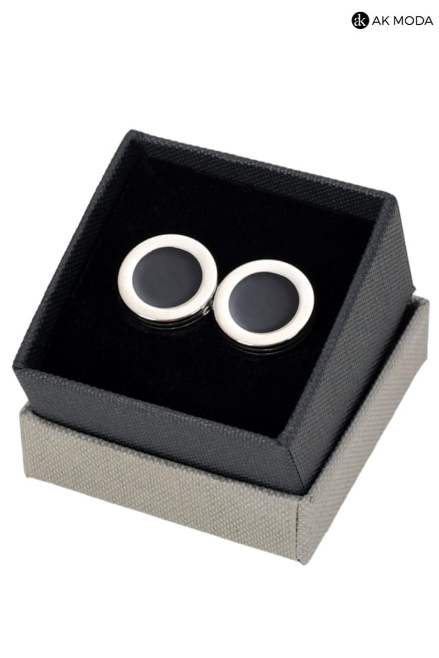 Klasyczne i eleganckie okrągłe spinki do mankietów w srebrnym kolorze z czarnym wypełnieniem..