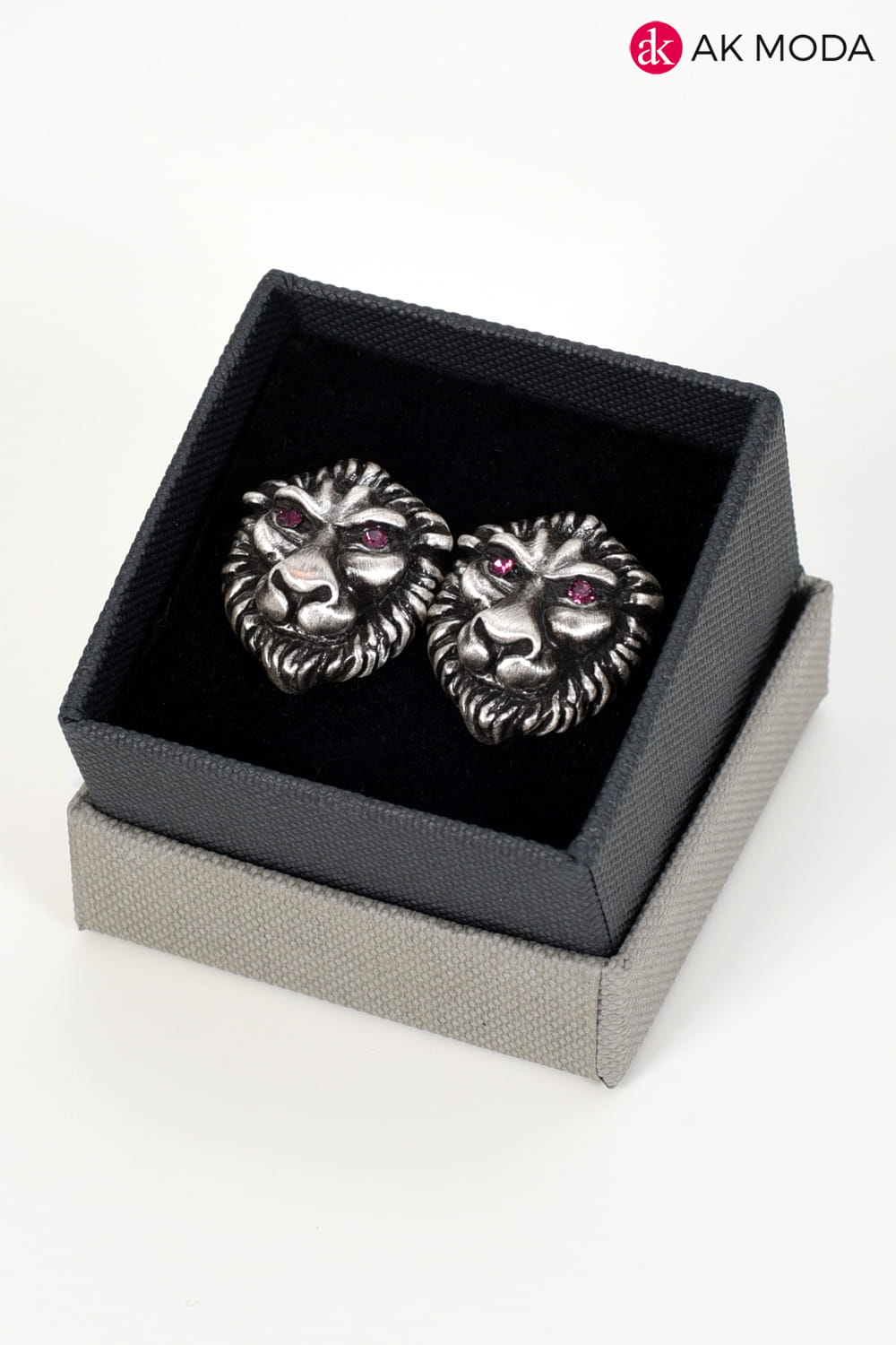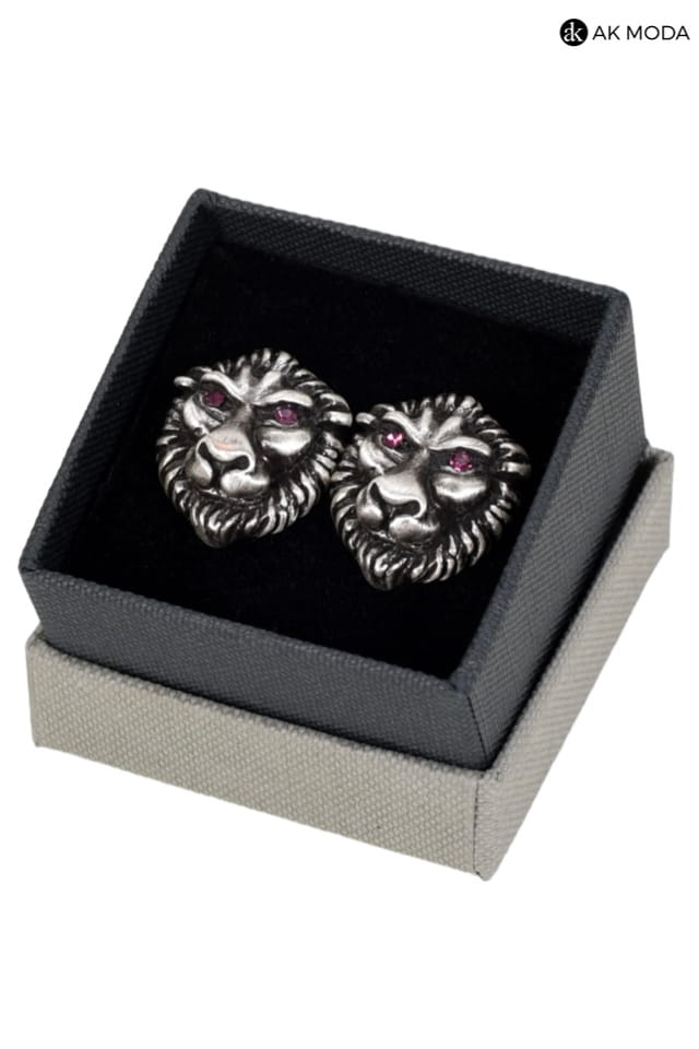 Spinki do mankietów w kolorze starego srebra w kształcie lwich głów z różowymi cyrkoniami.