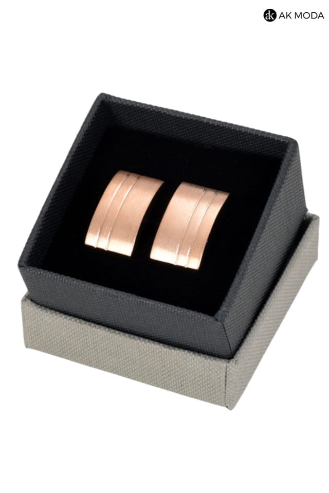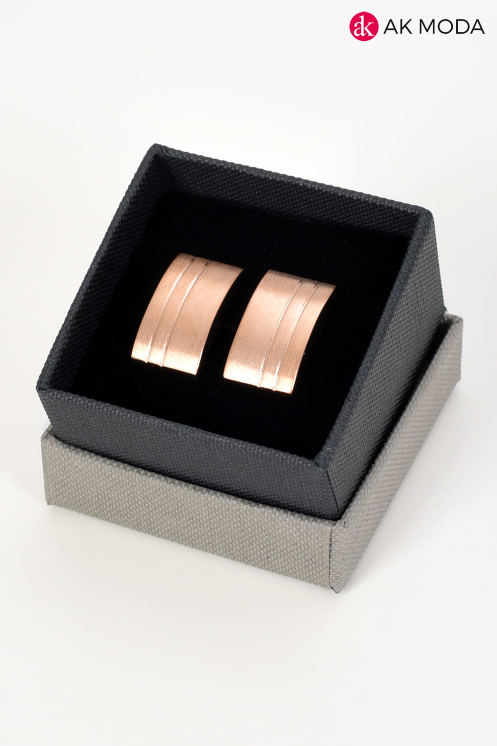 Prostokątne matowe spinki do mankietów w kolorze miedzianego złota z delikatnym grawerem.