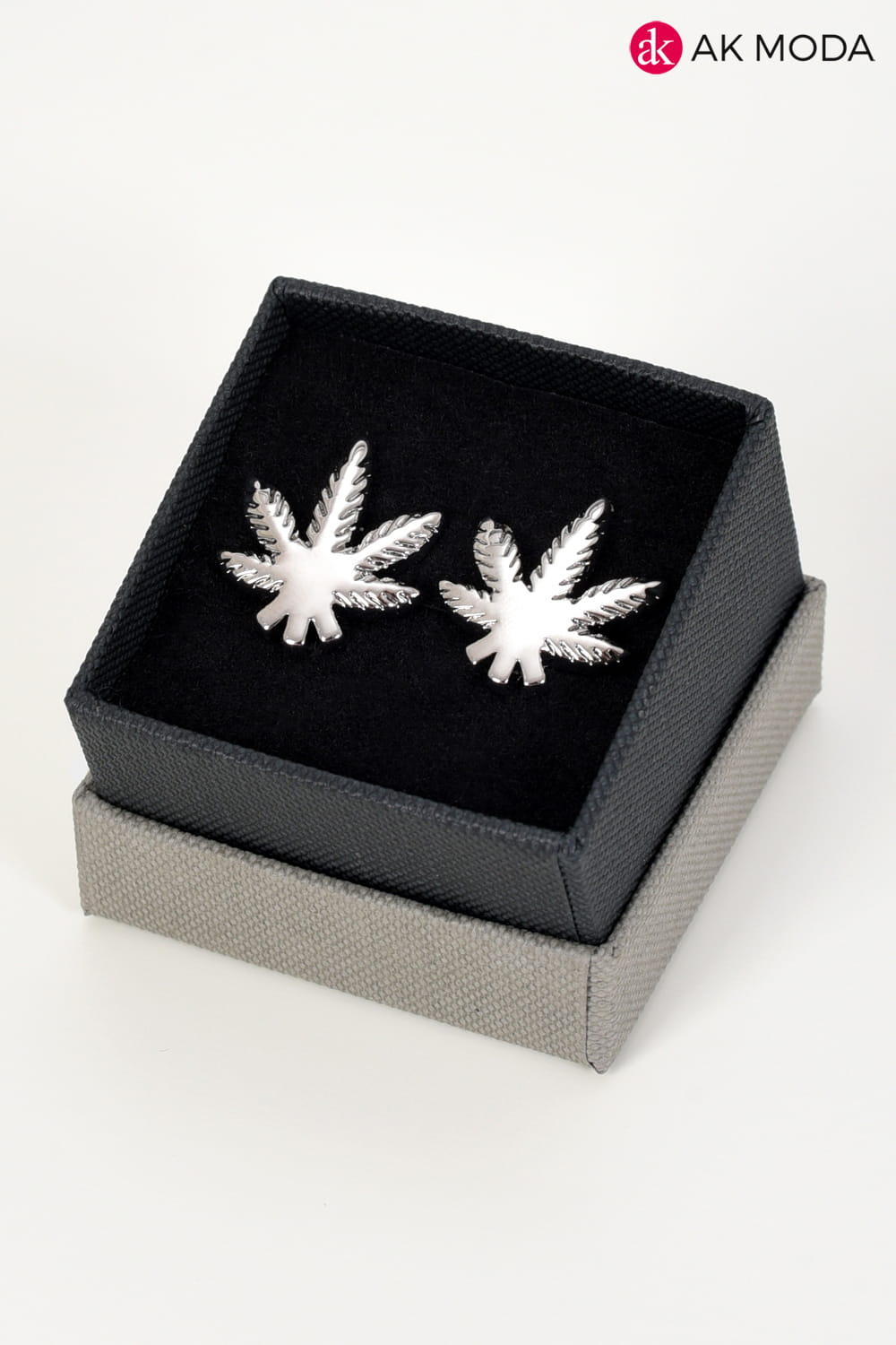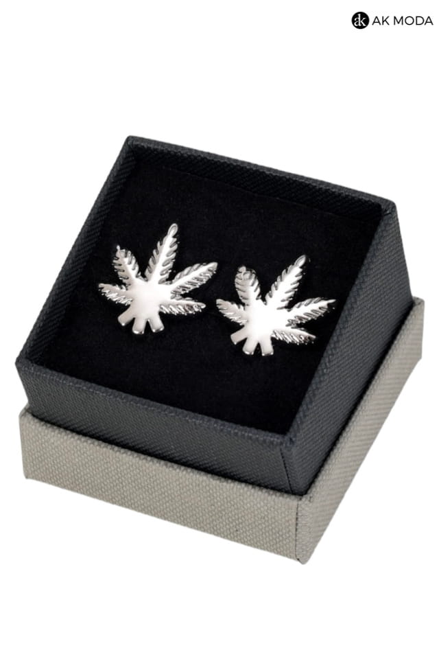 Spinki do mankietów w srebrnym kolorze w kształcie liści.