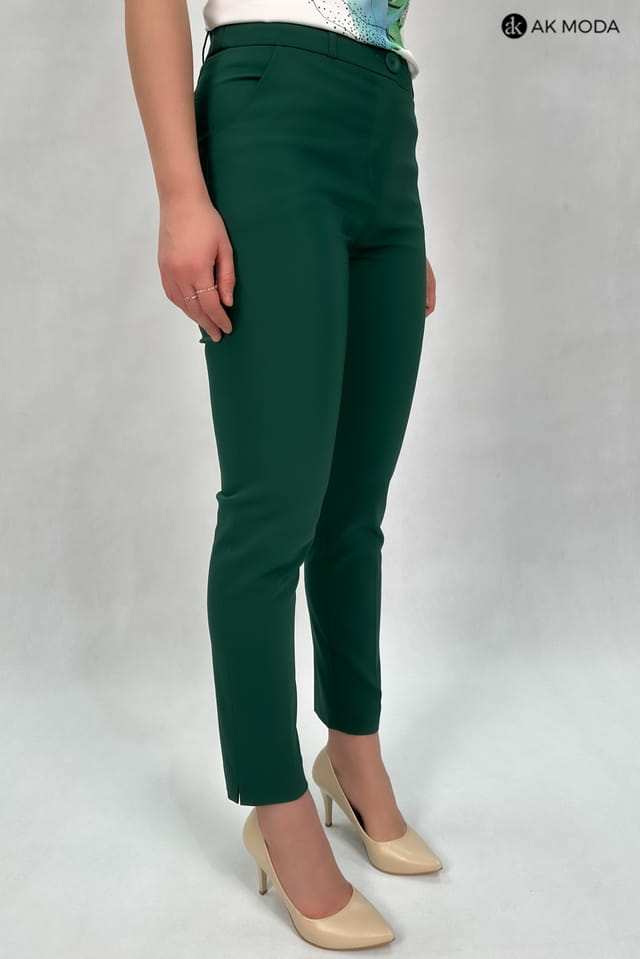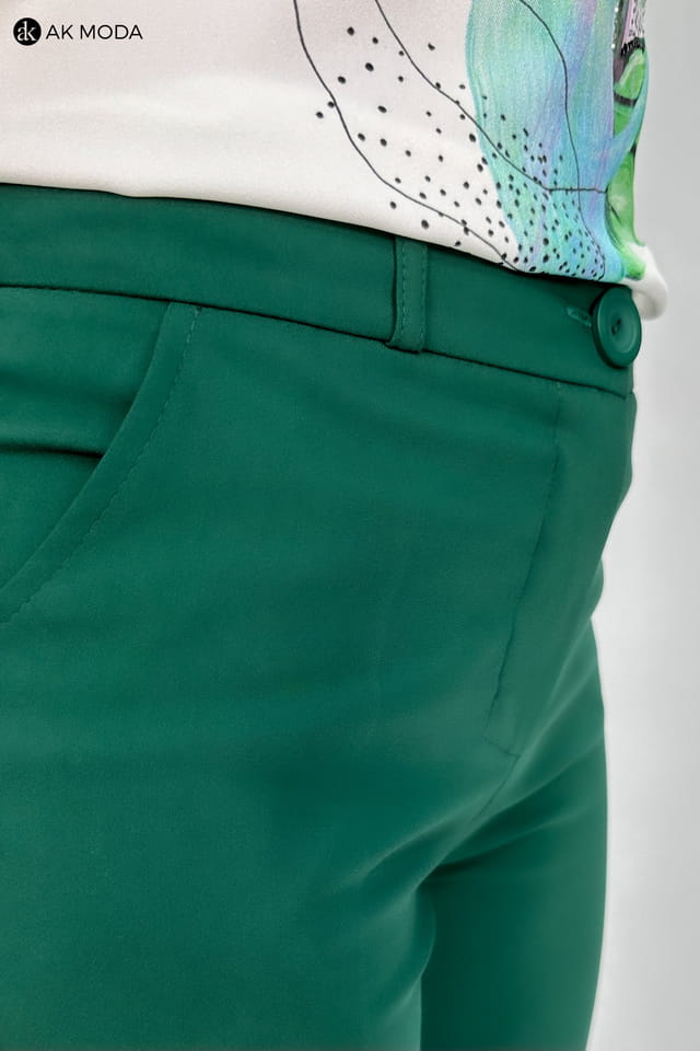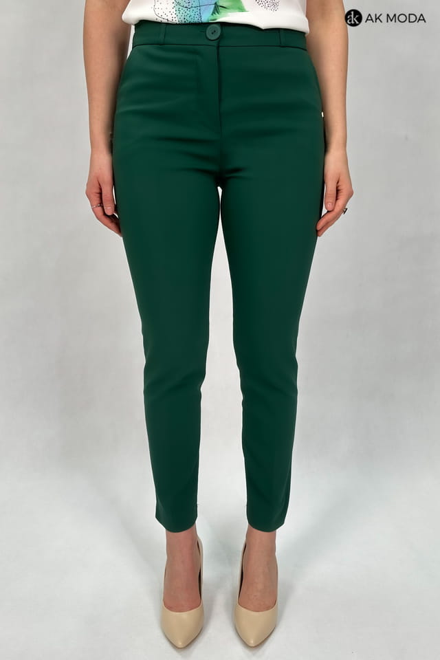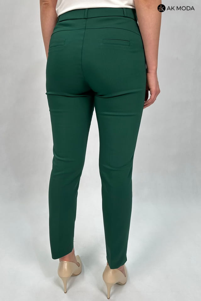 Eleganckie spodnie cygaretki w kolorze butelkowej zieleni. W pasie z tyłu gumka.