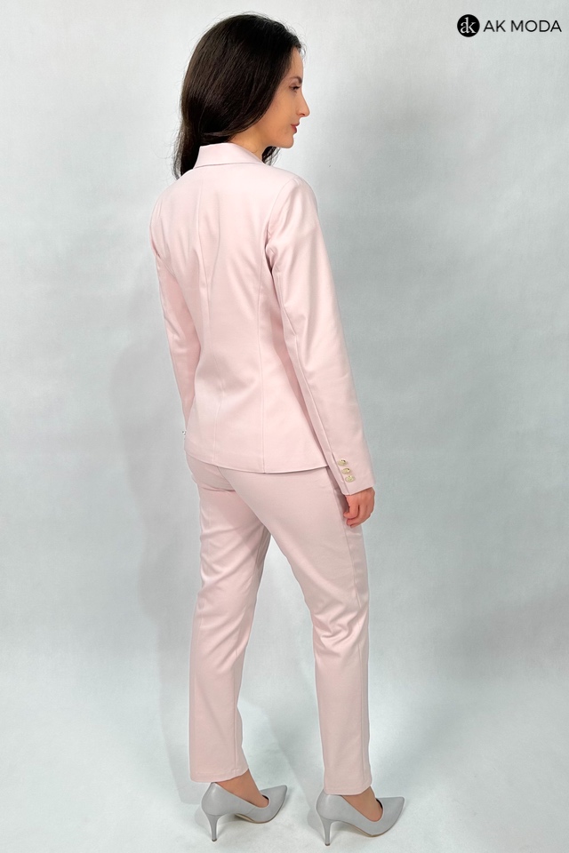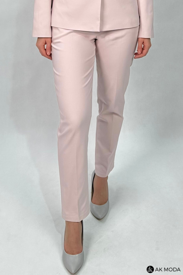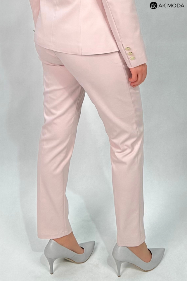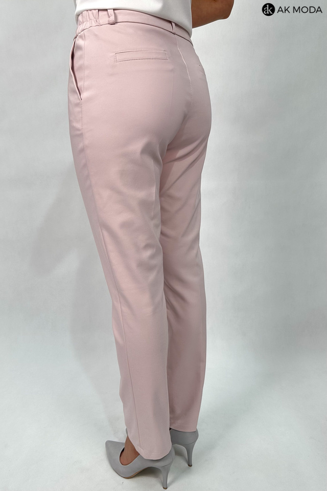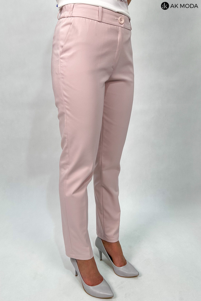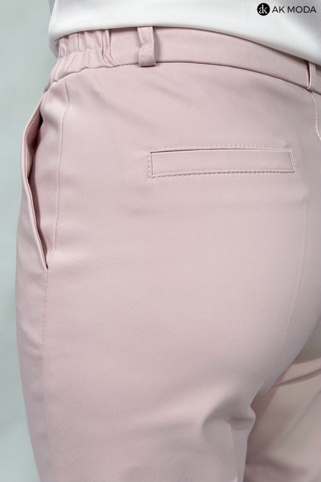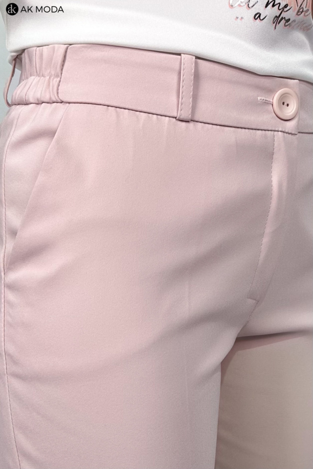 Spodnie damskie w kolorze pudrowego różu, długość 7/8, w pasie po bokach gumki.