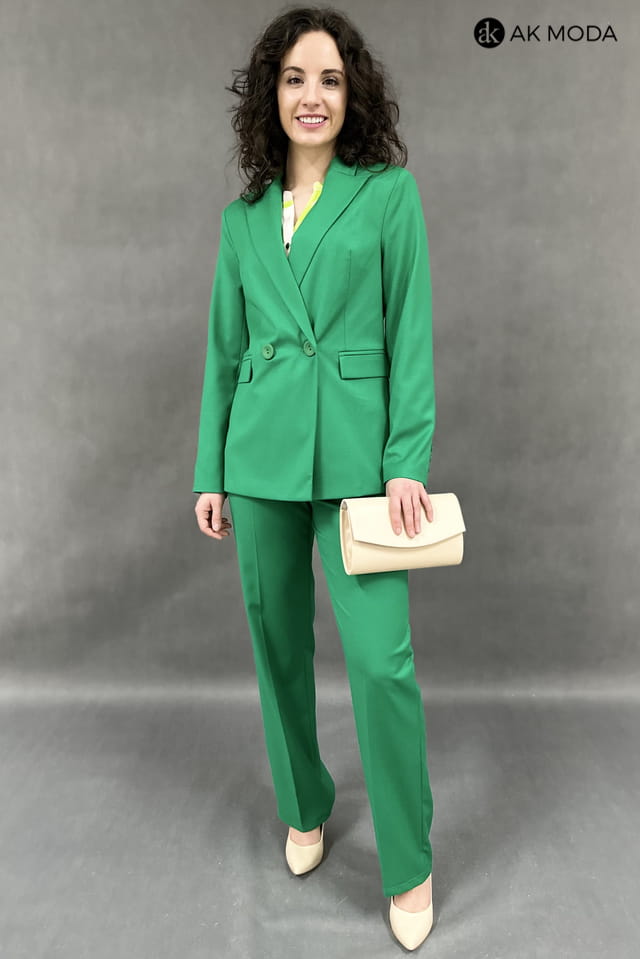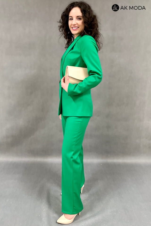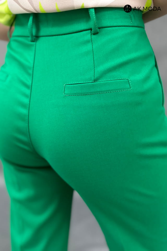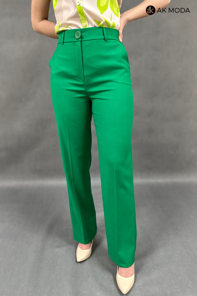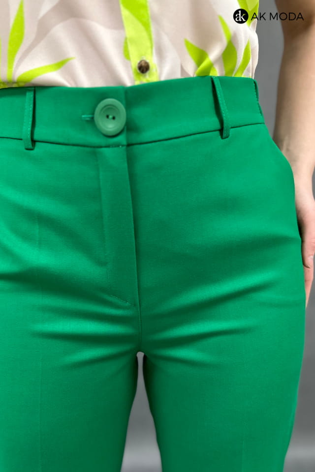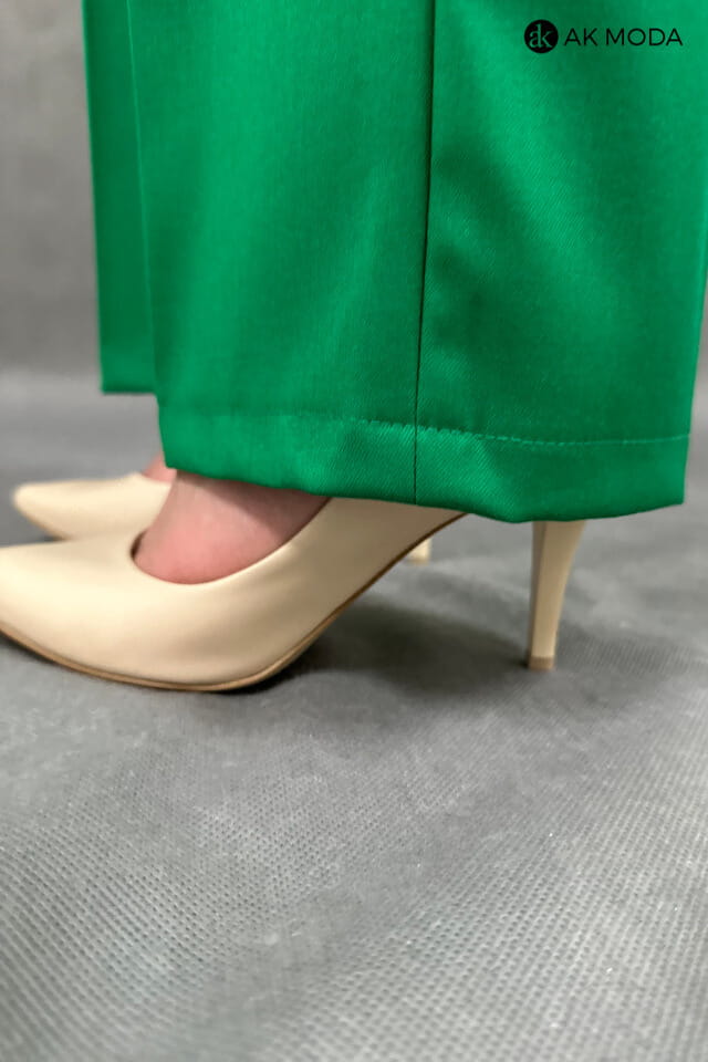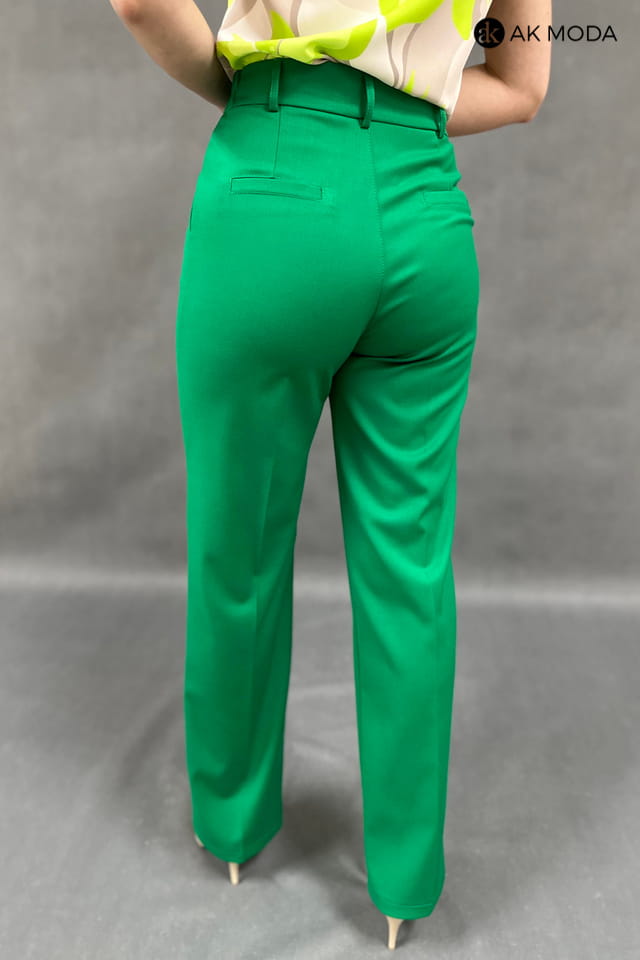 Zielone eleganckie spodnie damskie z kieszeniami. Fason z prostymi nogawkami, w pasie po bokach gumki.