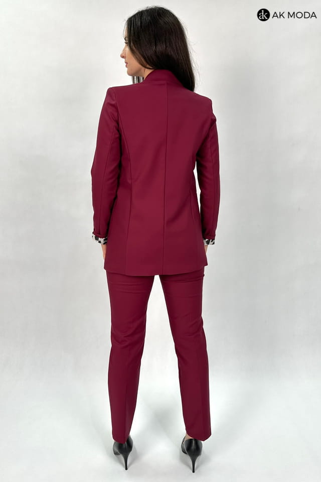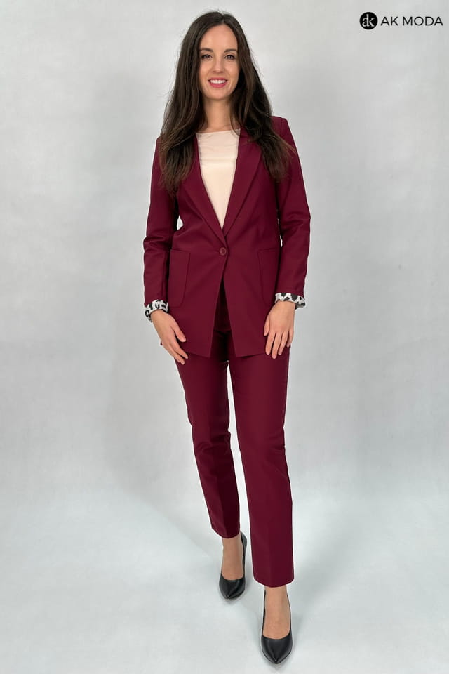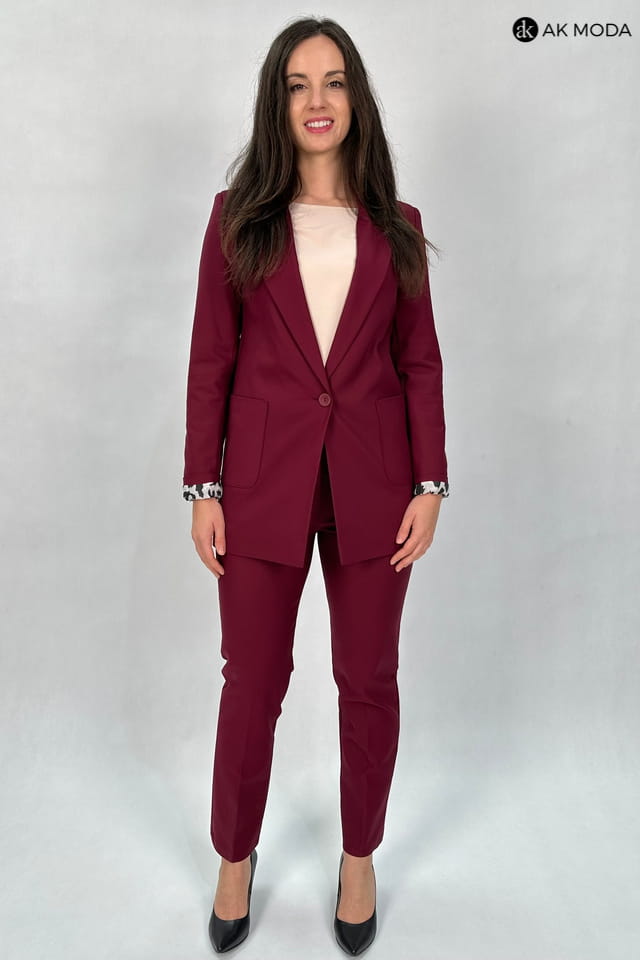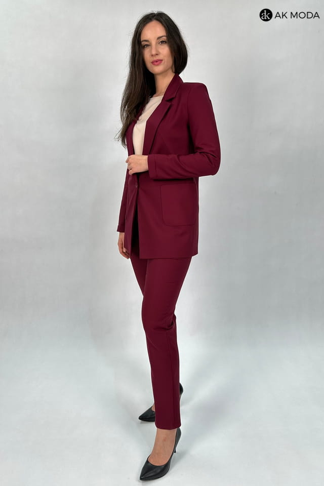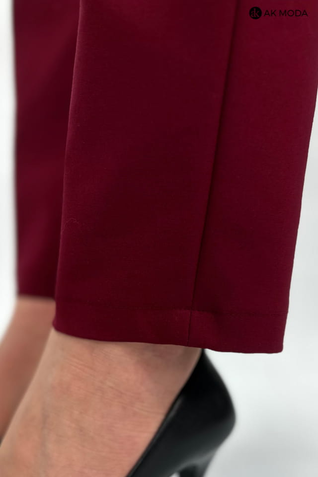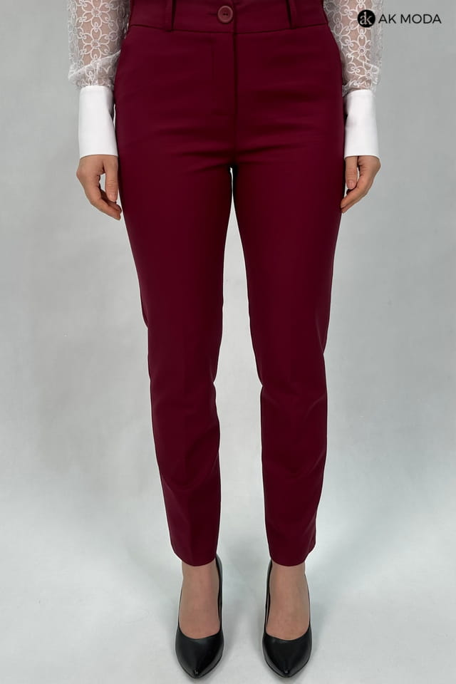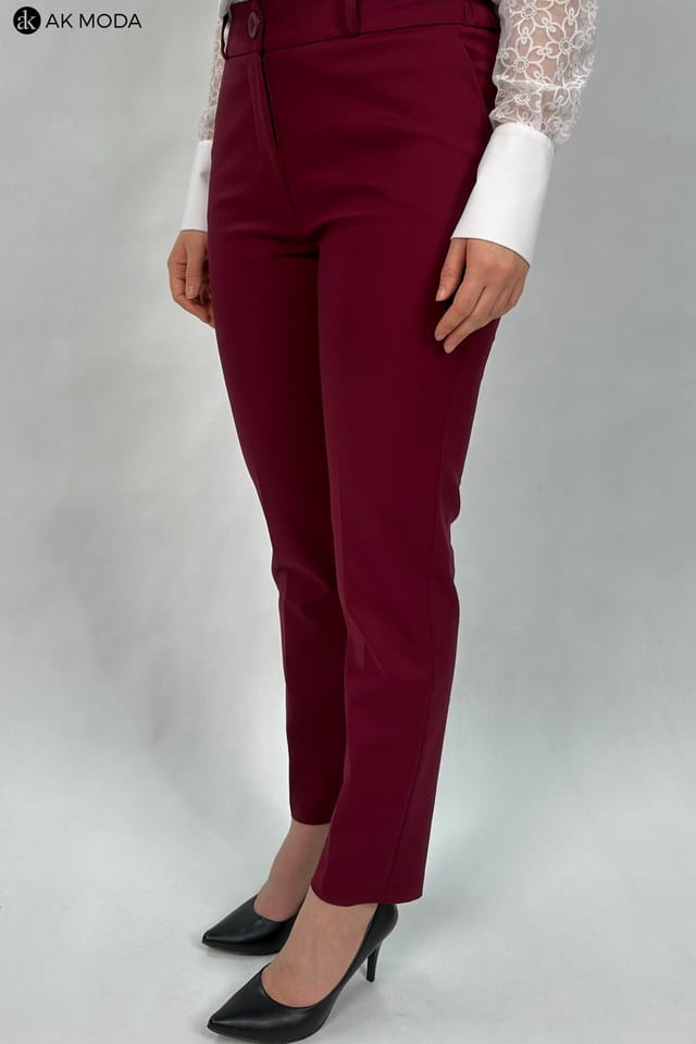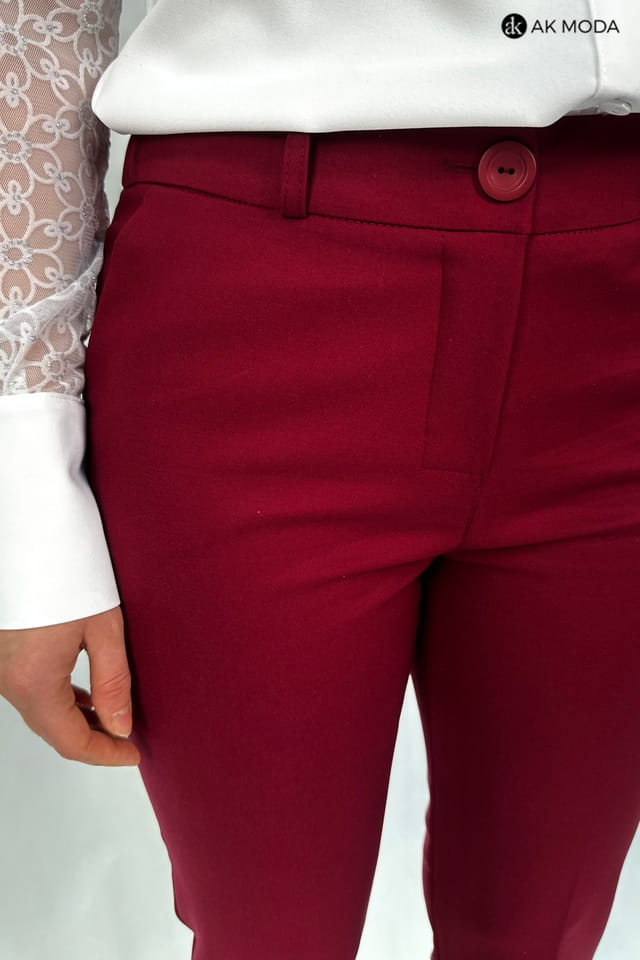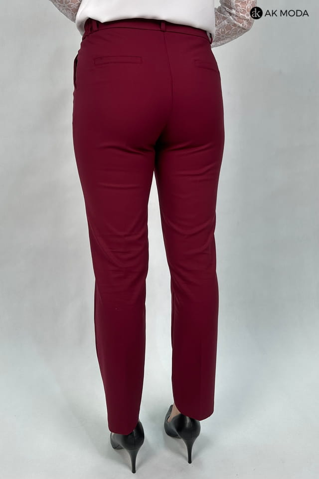 Eleganckie bordowe spodnie damskie z kieszeniami. Fason z prostymi nogawkami, w pasie po bokach gumka.