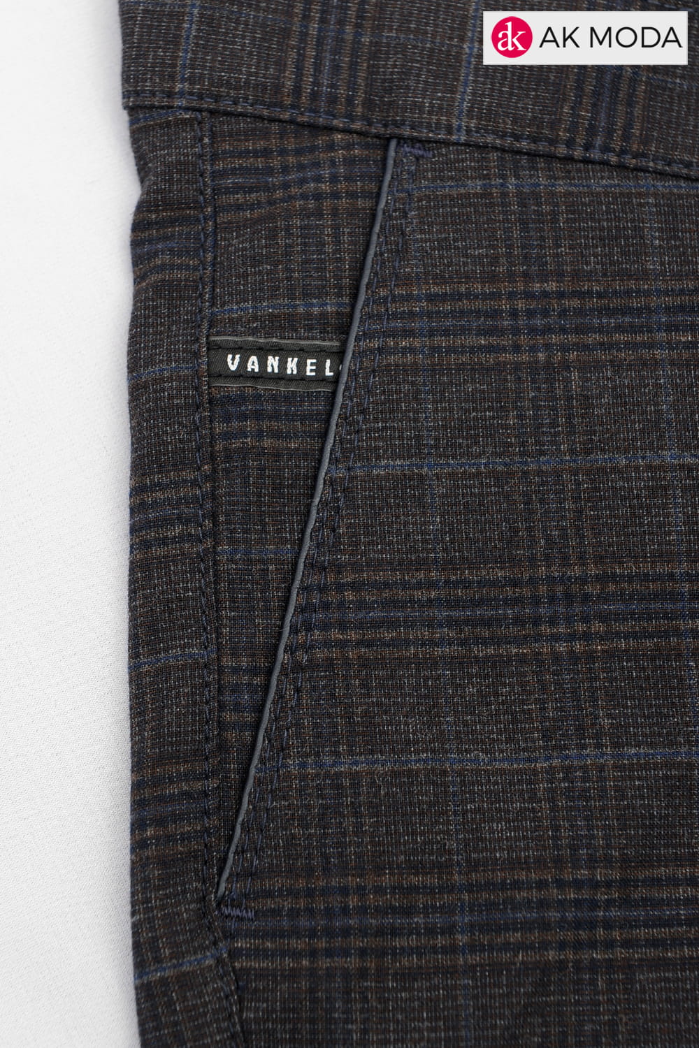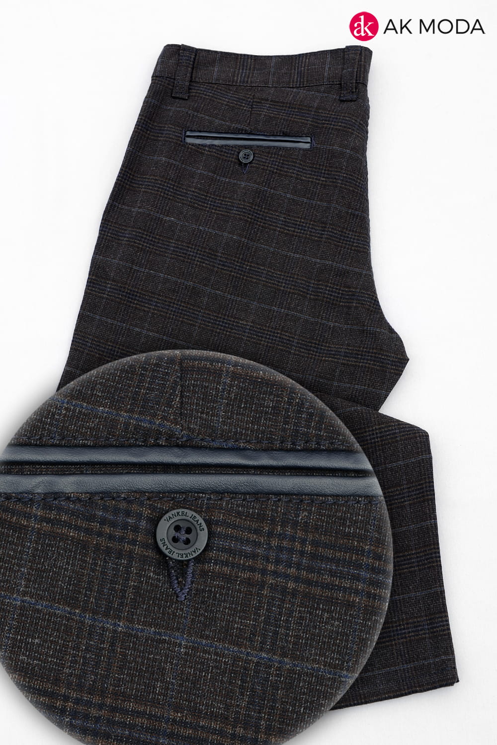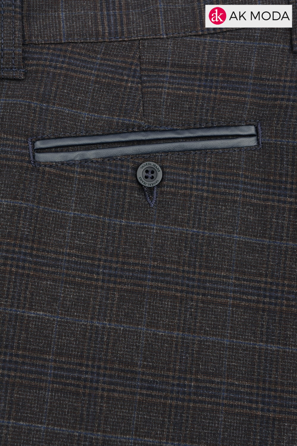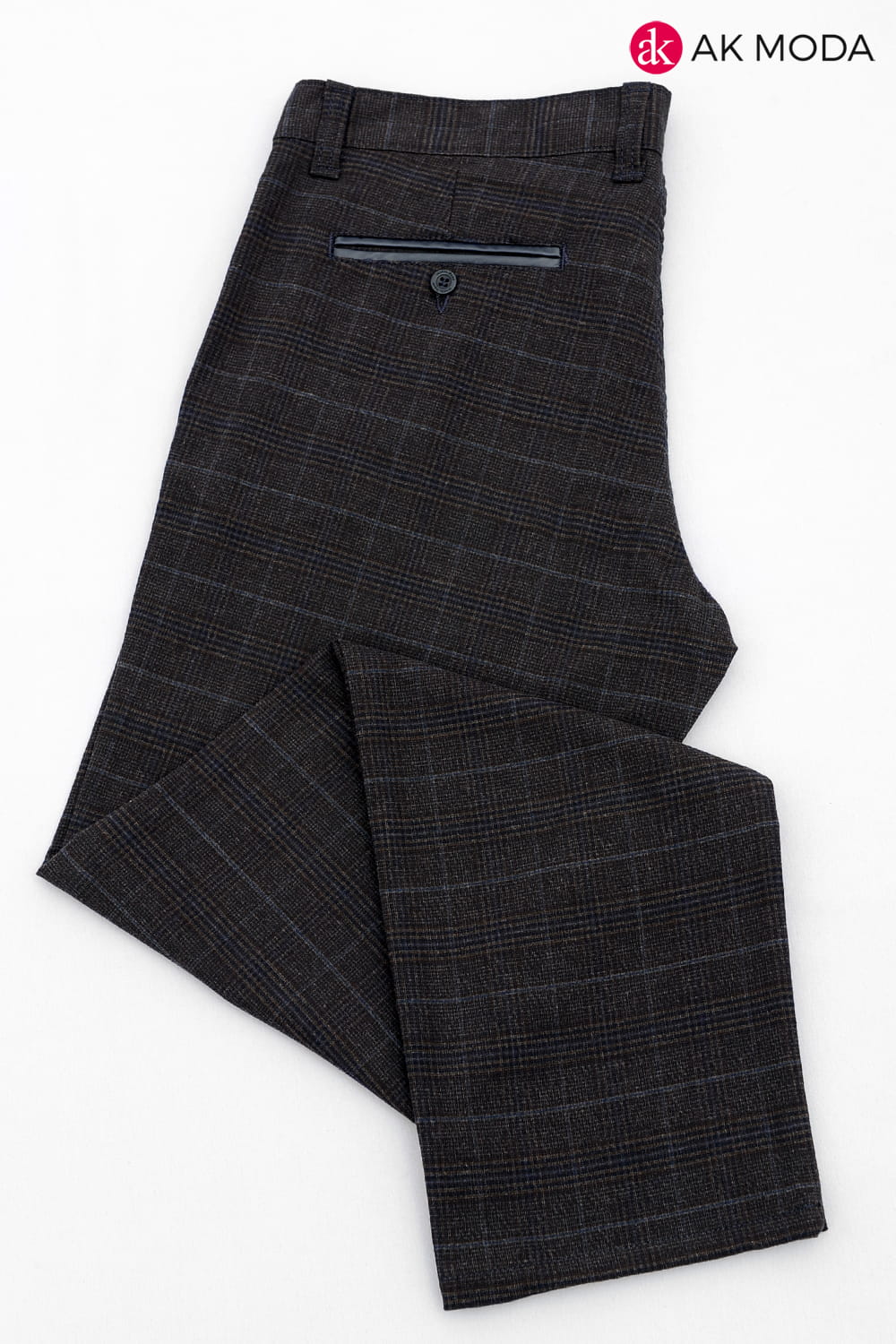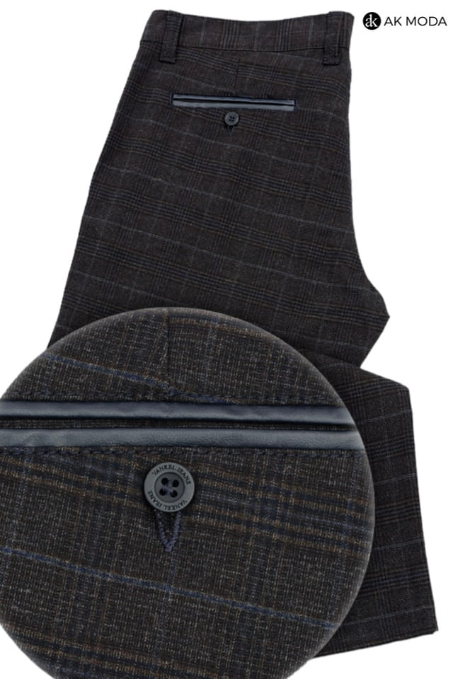 Brązowo - granatowe spodnie męskie w kratkę.