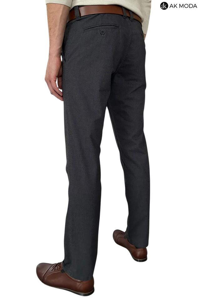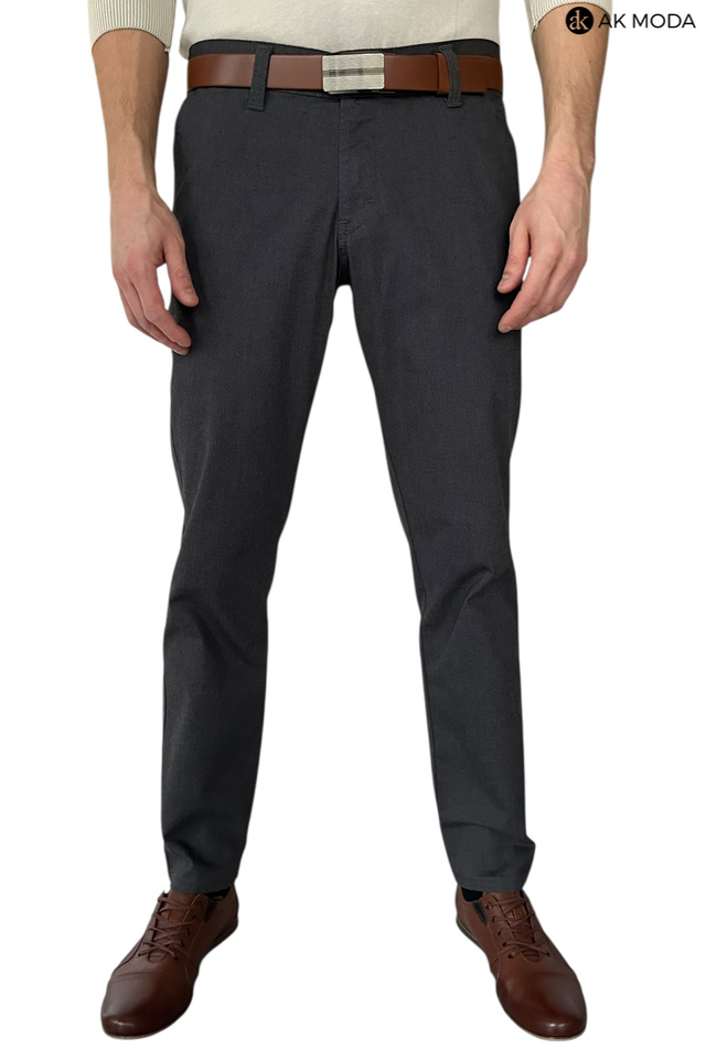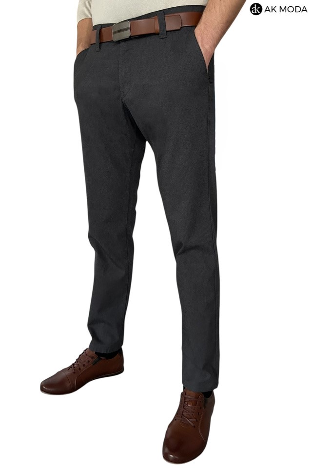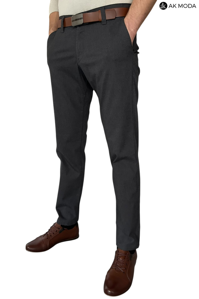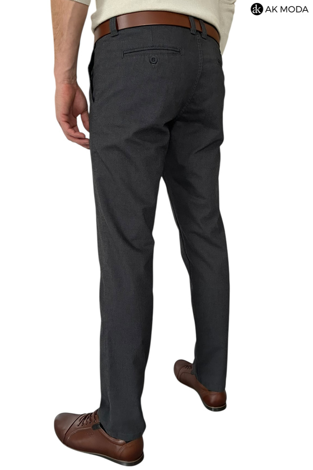 Męskie spodnie typu chino w kolorze ciemnoszarym, uszyte z fakturowanego materiału.