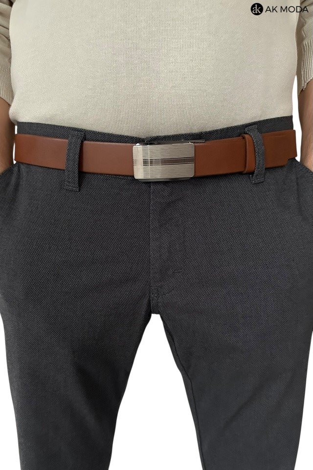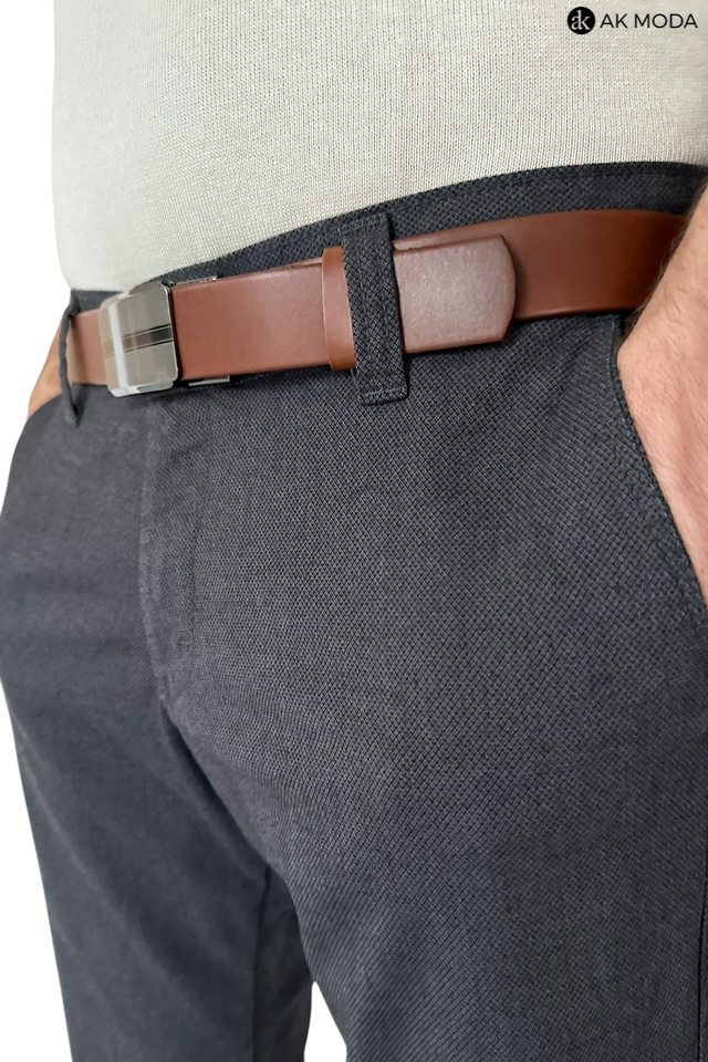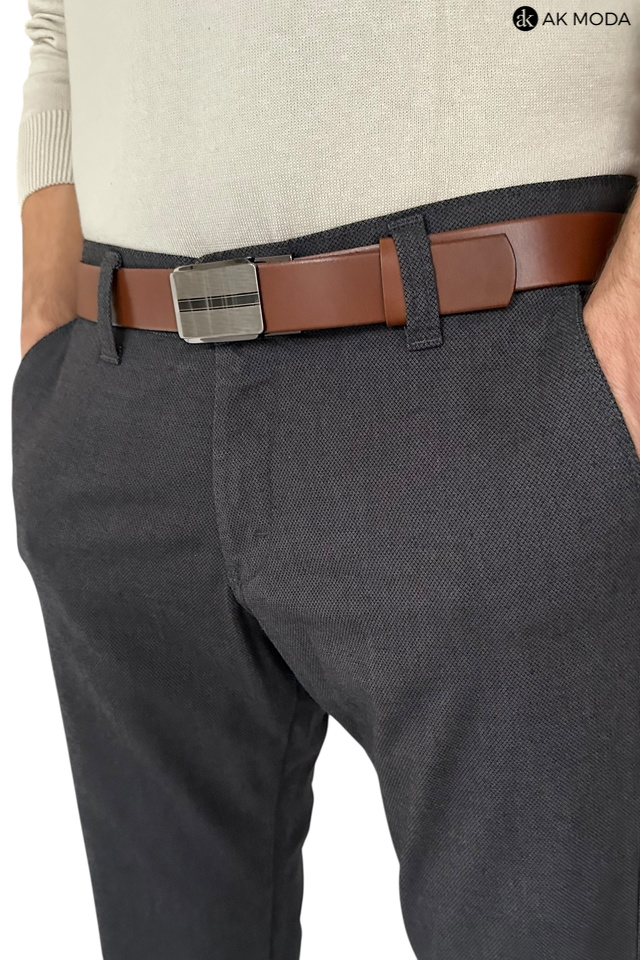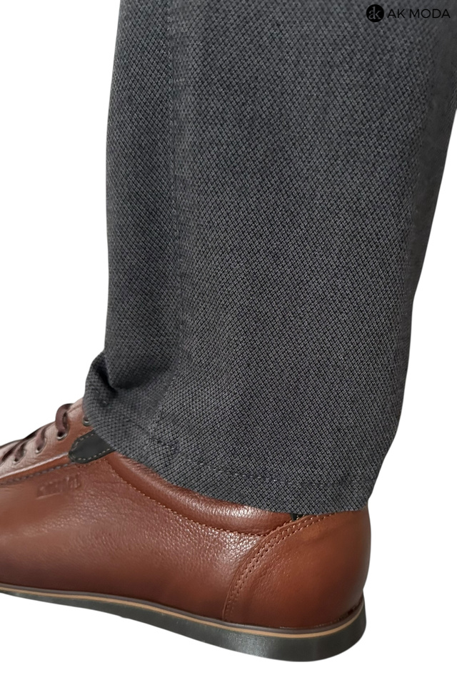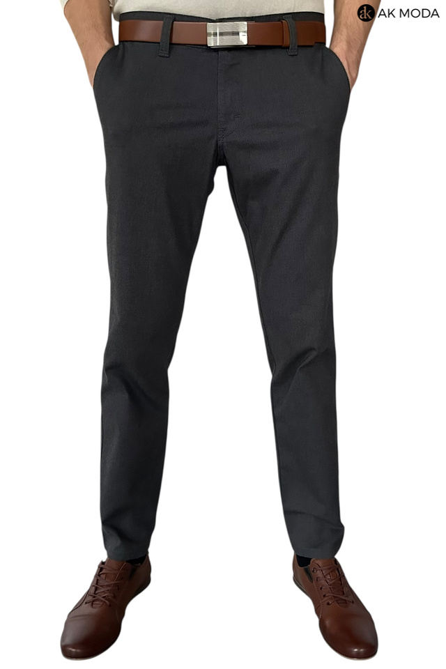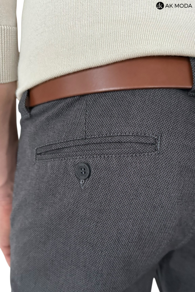 Męskie spodnie typu chino w kolorze ciemnoszarym, uszyte z fakturowanego materiału.