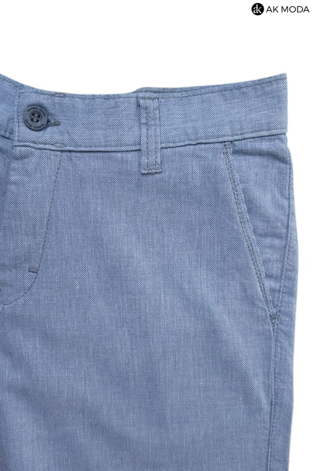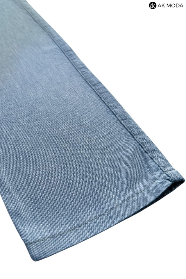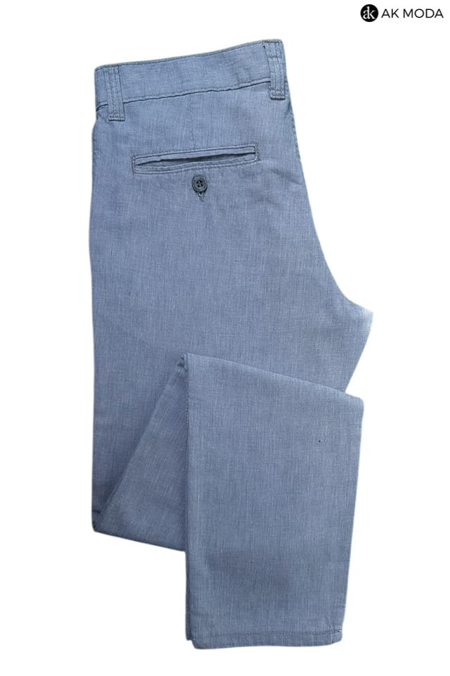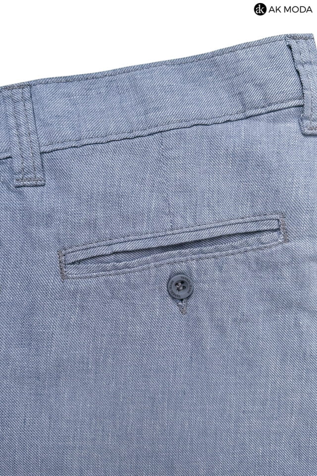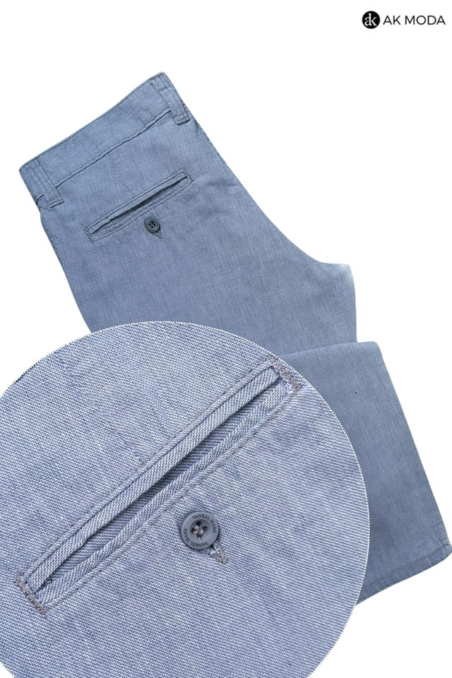Jasnoniebieskie męskie spodnie typu chino uszyte z materiału o strukturze lnu.