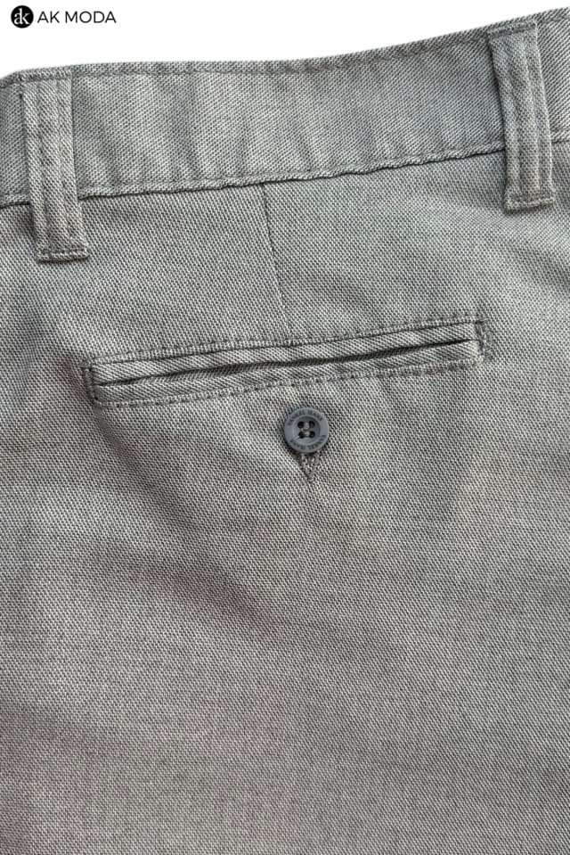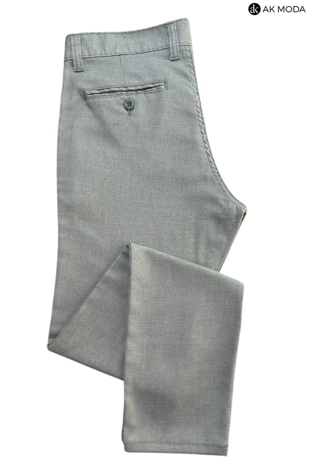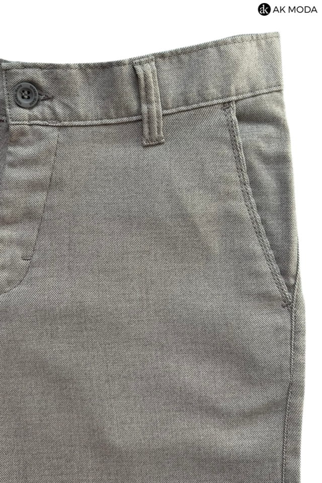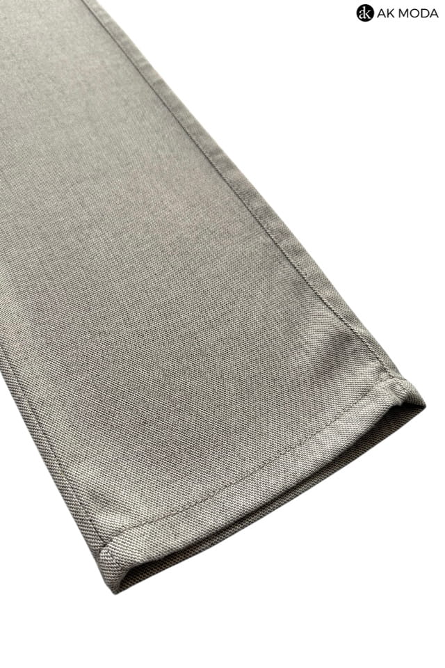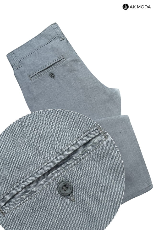 Jasnoszare męskie spodnie typu chino, uszyte ze strukturalnego materiału.