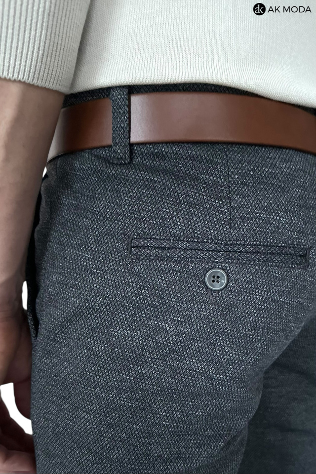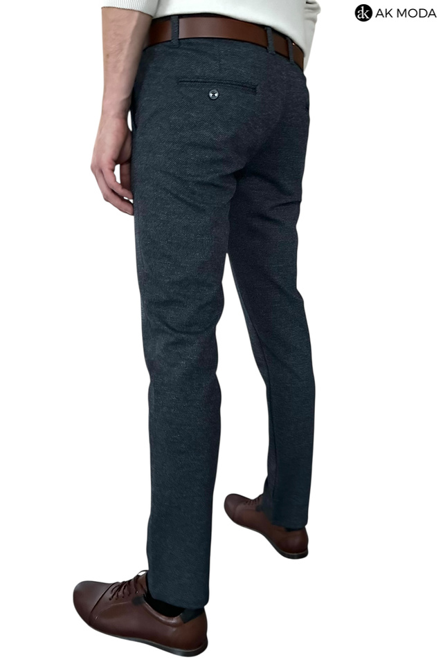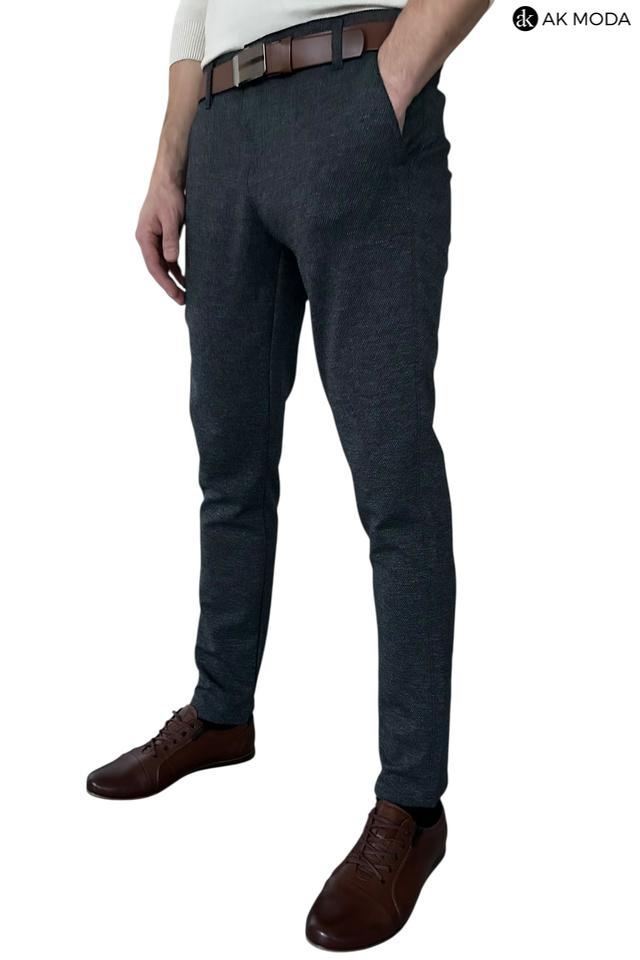 Spodnie męskie typu chino w kolorze granatowym melanżowym, uszyte z fakturowanego materiału.