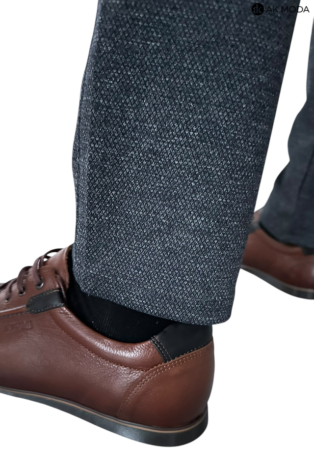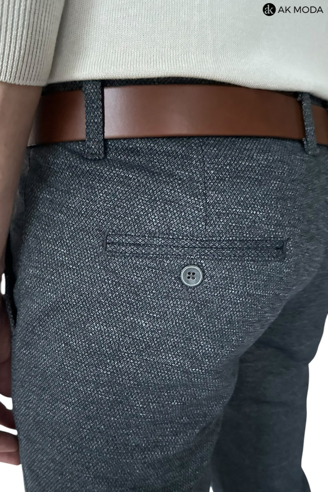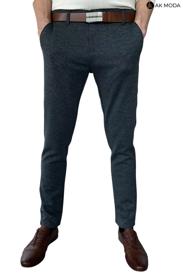Spodnie męskie typu chino w kolorze granatowym melanżowym, uszyte z fakturowanego materiału.