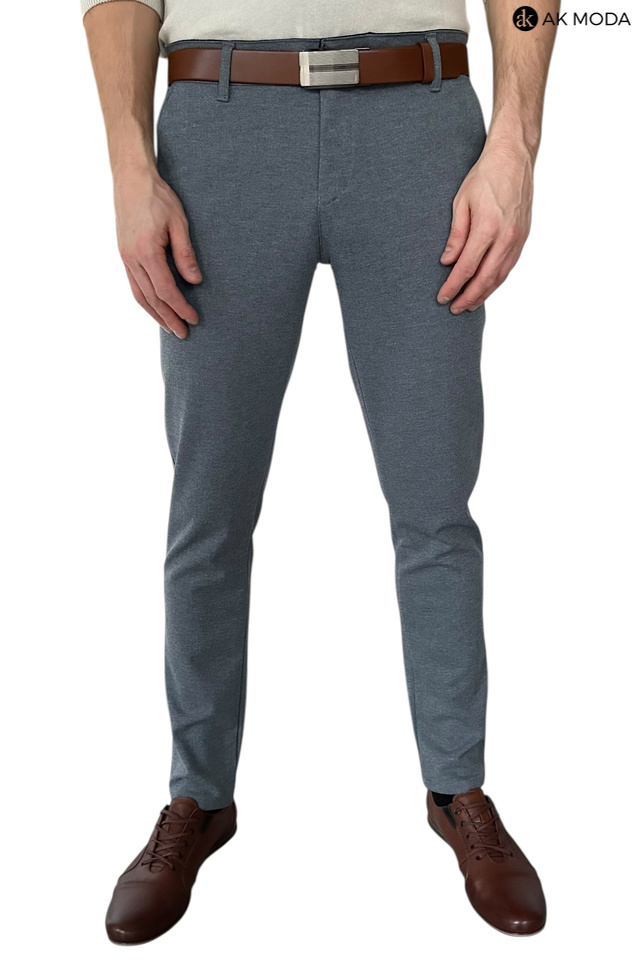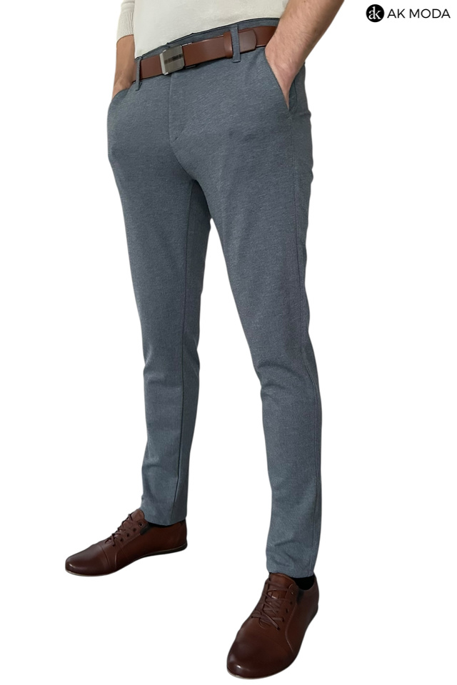 Spodnie męskie typu chino w kolorze granatowym melanżowym, uszyte z elastycznego materiału.