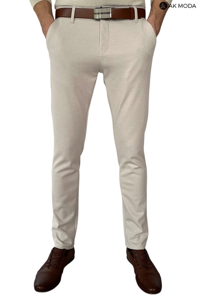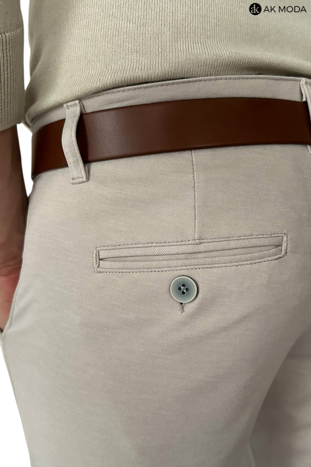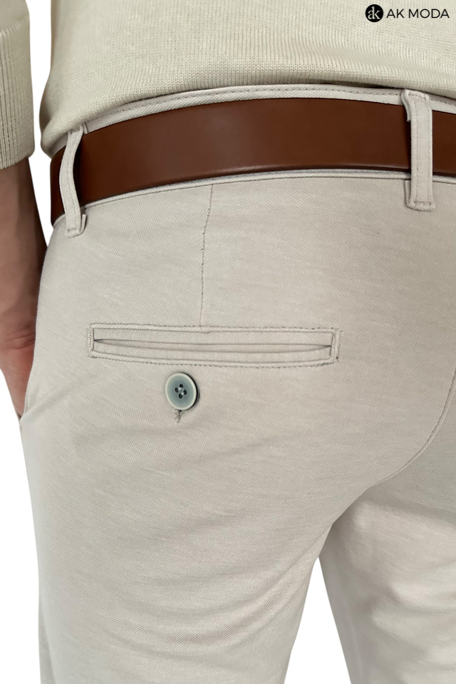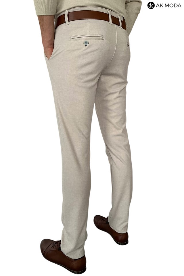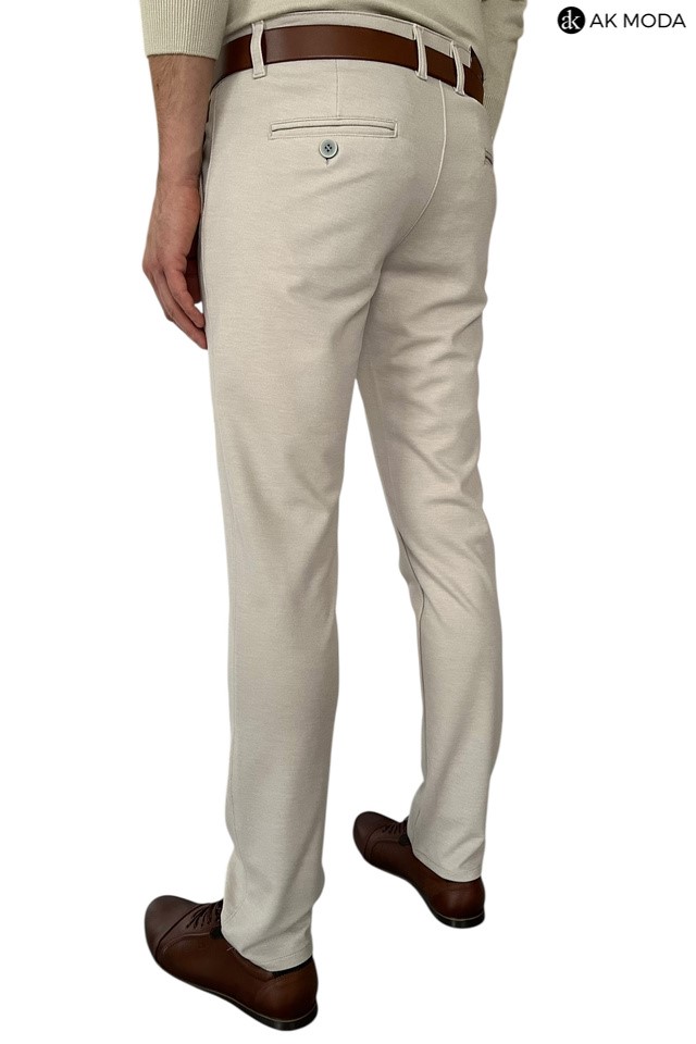Spodnie męskie typu chino w kolorze beżowym, uszyte z elastycznego materiału.