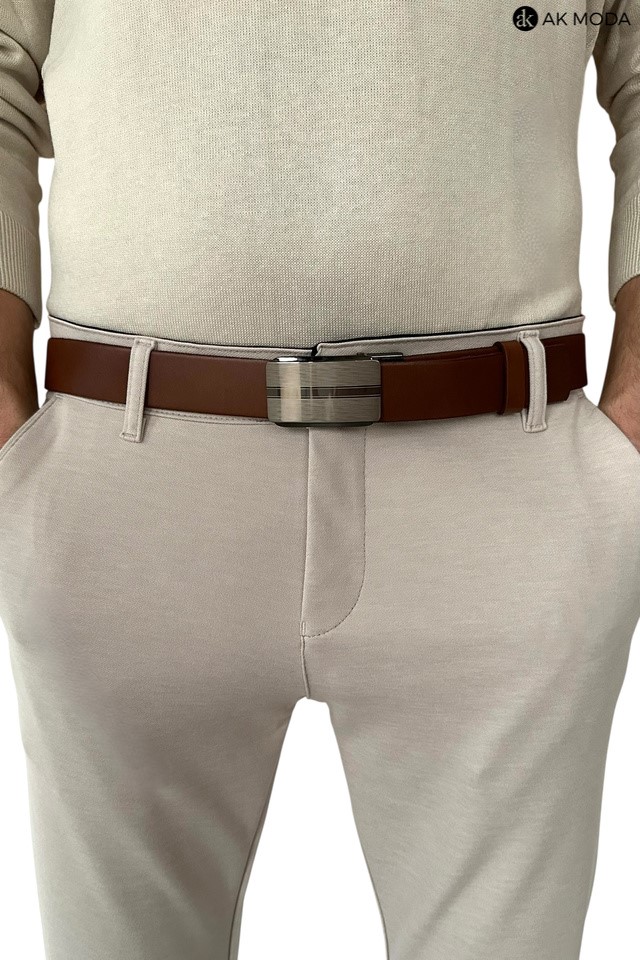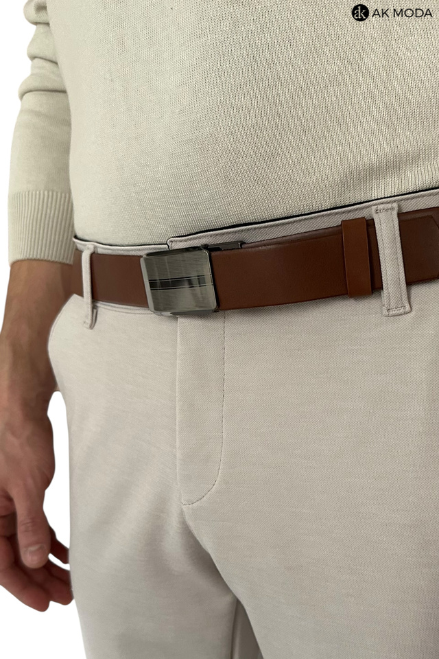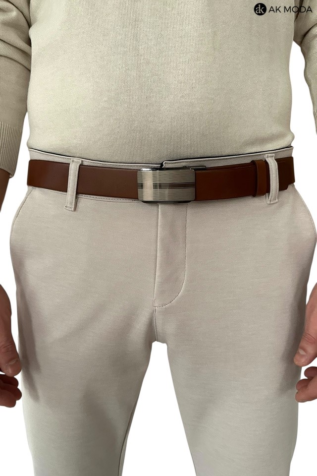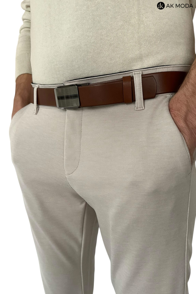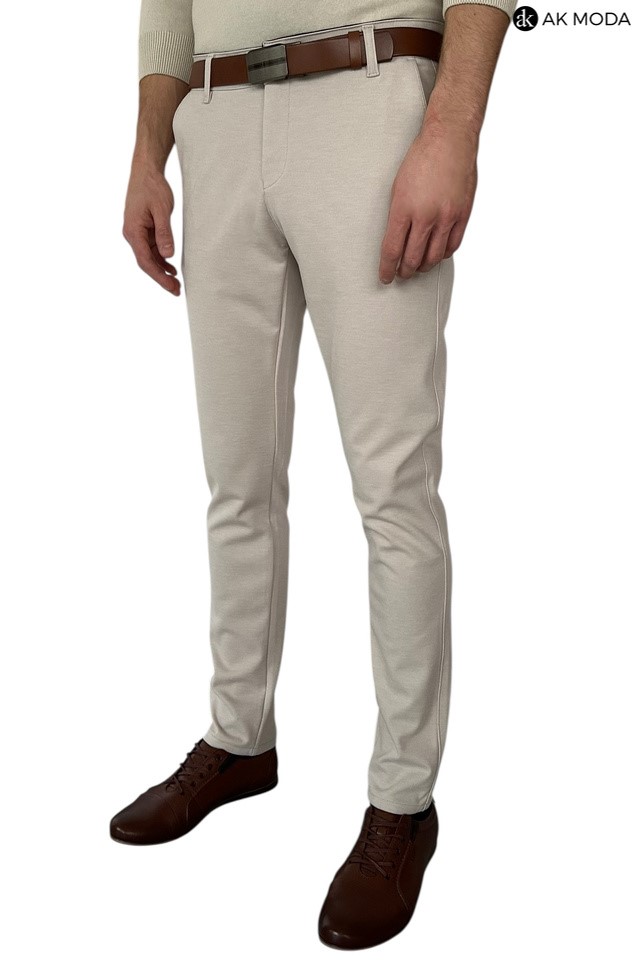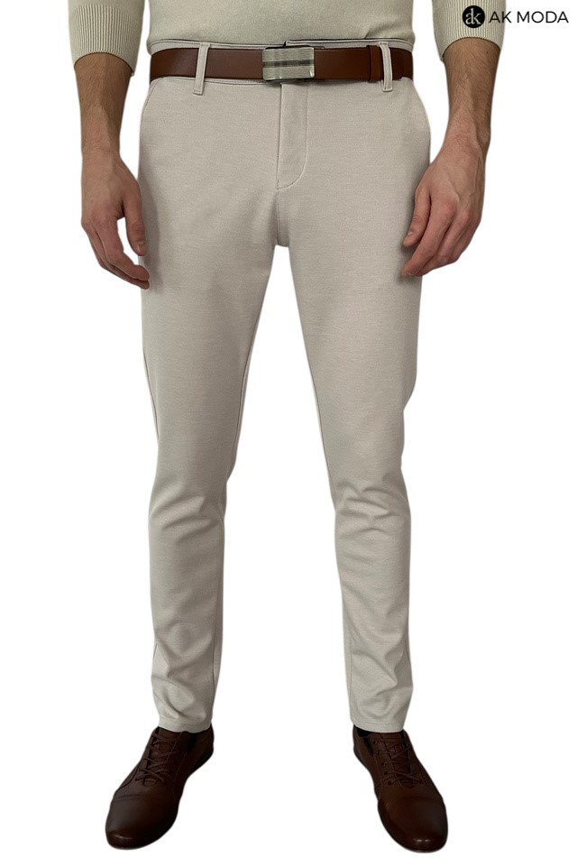Spodnie męskie typu chino w kolorze beżowym, uszyte z elastycznego materiału.