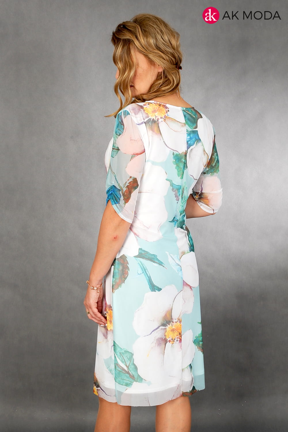 Dopasowana wzorzysta sukienka z siateczkowego materiału z przewagą koloru miętowego. Dekolt zakładany, na boku marszczenie, transparentne rękawy 3/4.