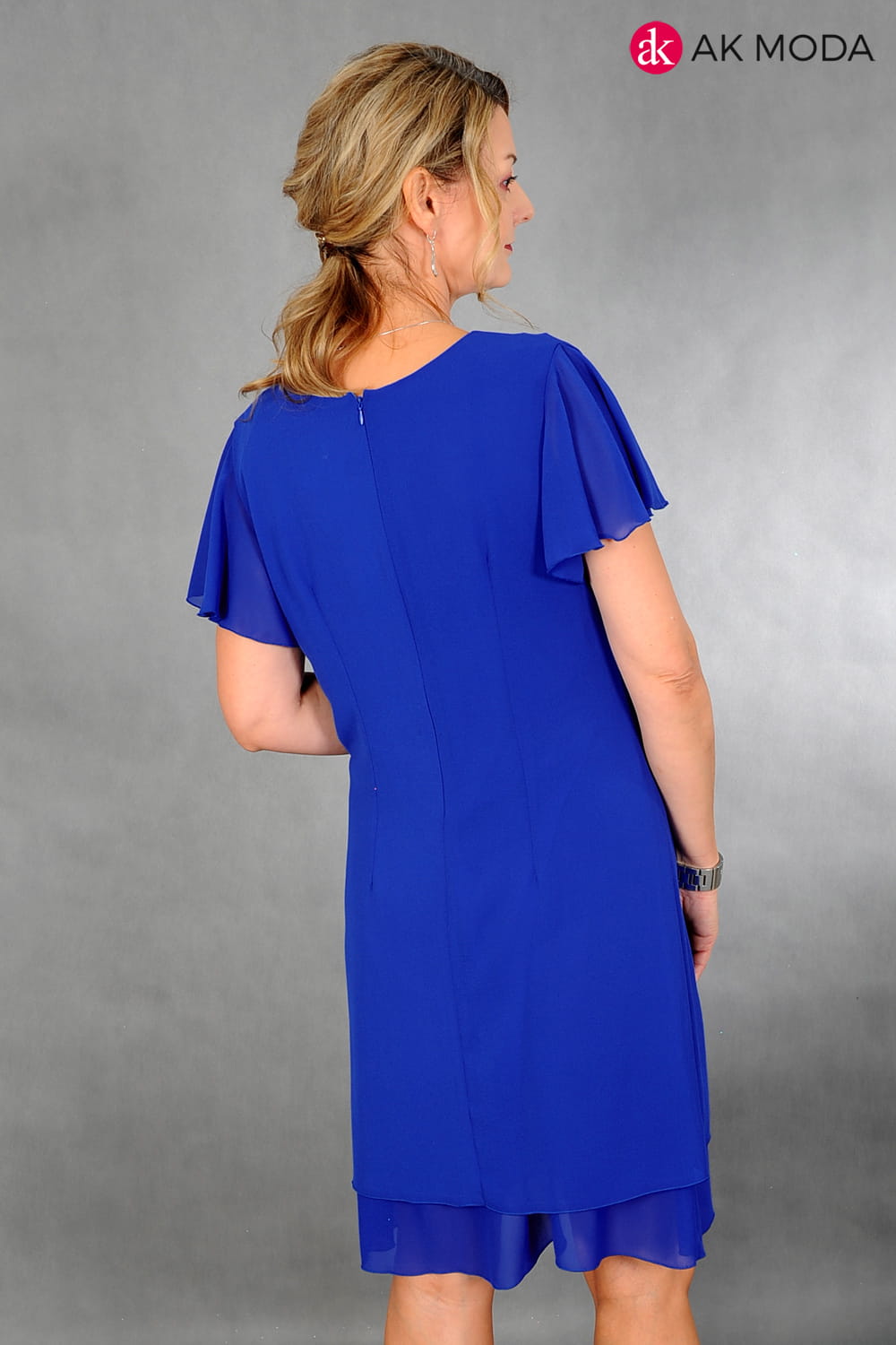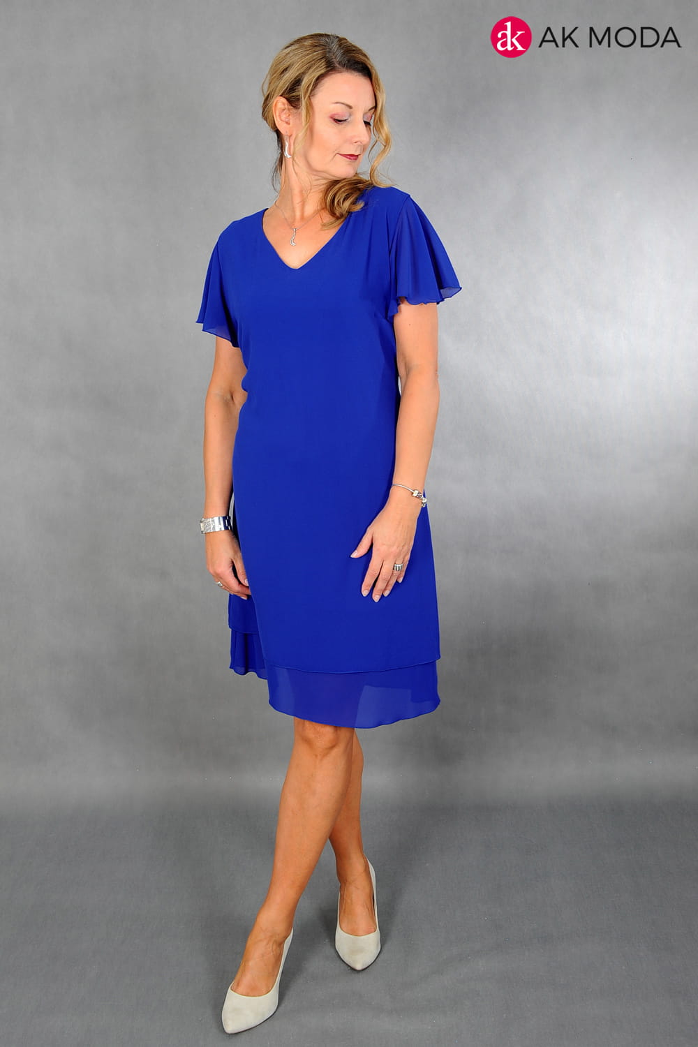Chabrowa, prosta sukienka. Krótki zwiewny rękaw w formie falbanki.