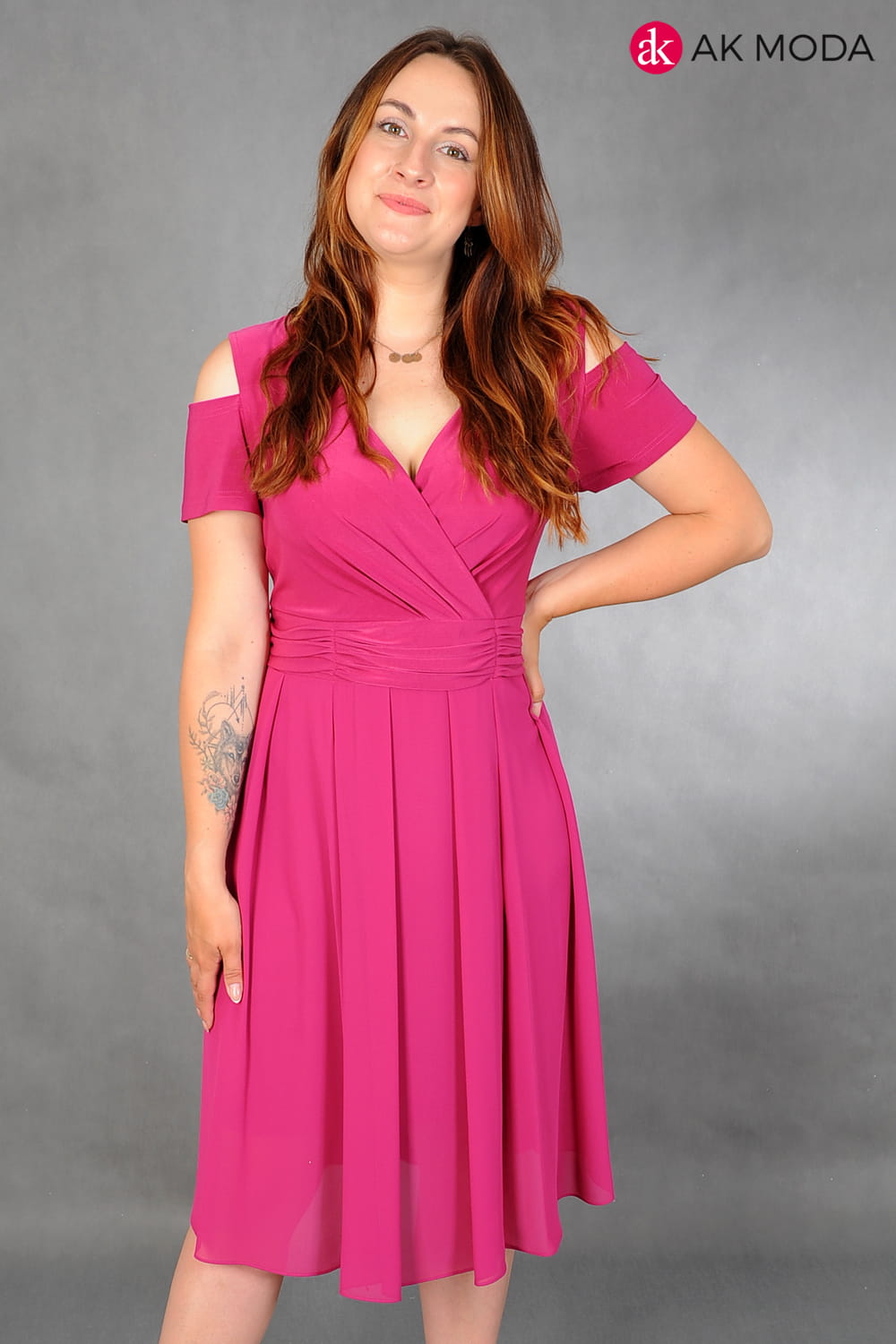 Rozkloszowana fuksjowa sukienka z odkrytymi ramionami. Dekolt kopertowy i marszczenia w pasie.