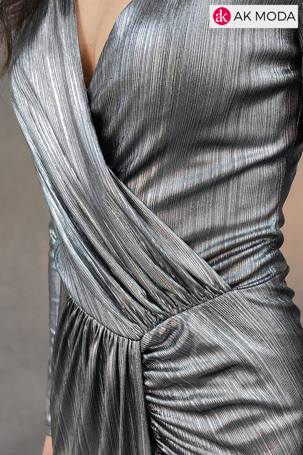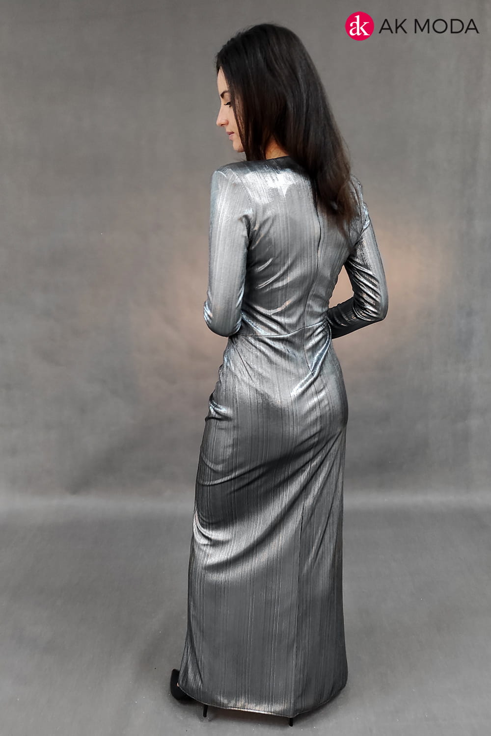 Elegancka długa sukienka z długim rękawem, w kolorze srebrnym uszyta z połyskującego materiału. Marszczenie w pasie, rozcięcie z boku.