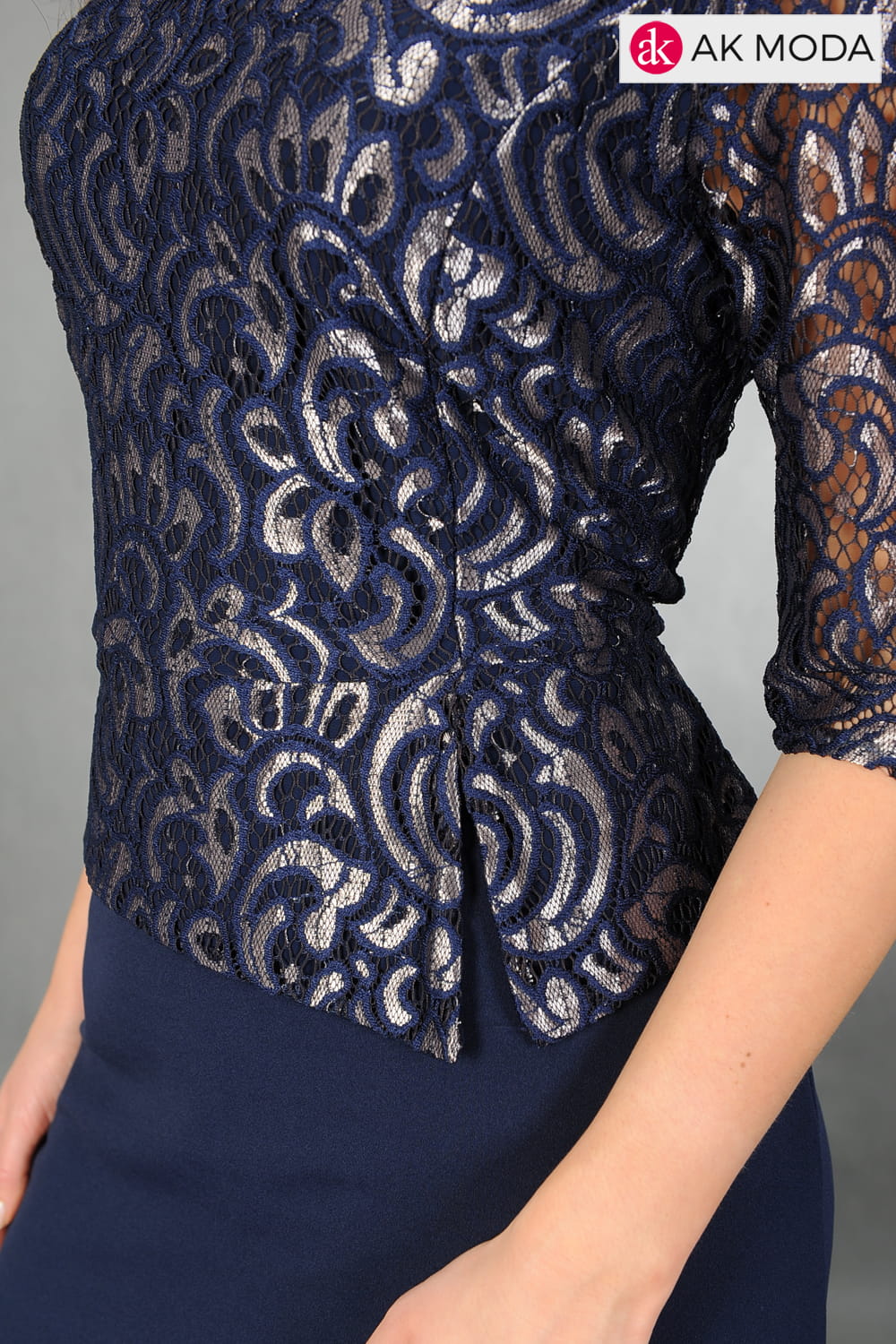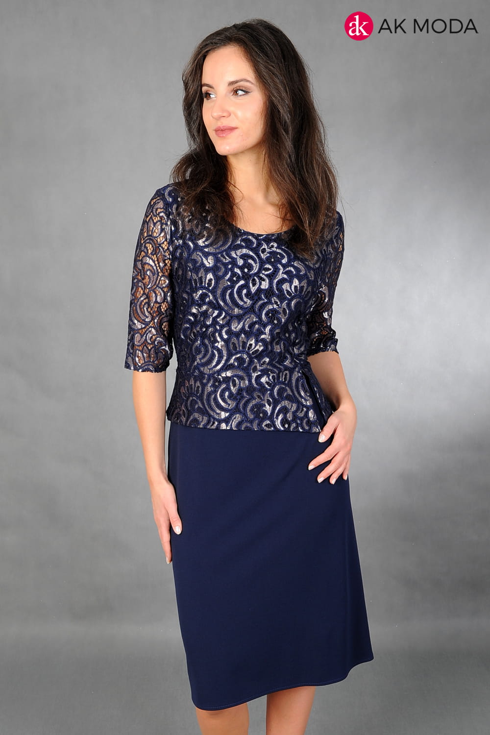 Granatowa, prosta sukienka z krótkim rękawem. Góra z baskinką uszyta z błyszczącej koronki, dół gładki.